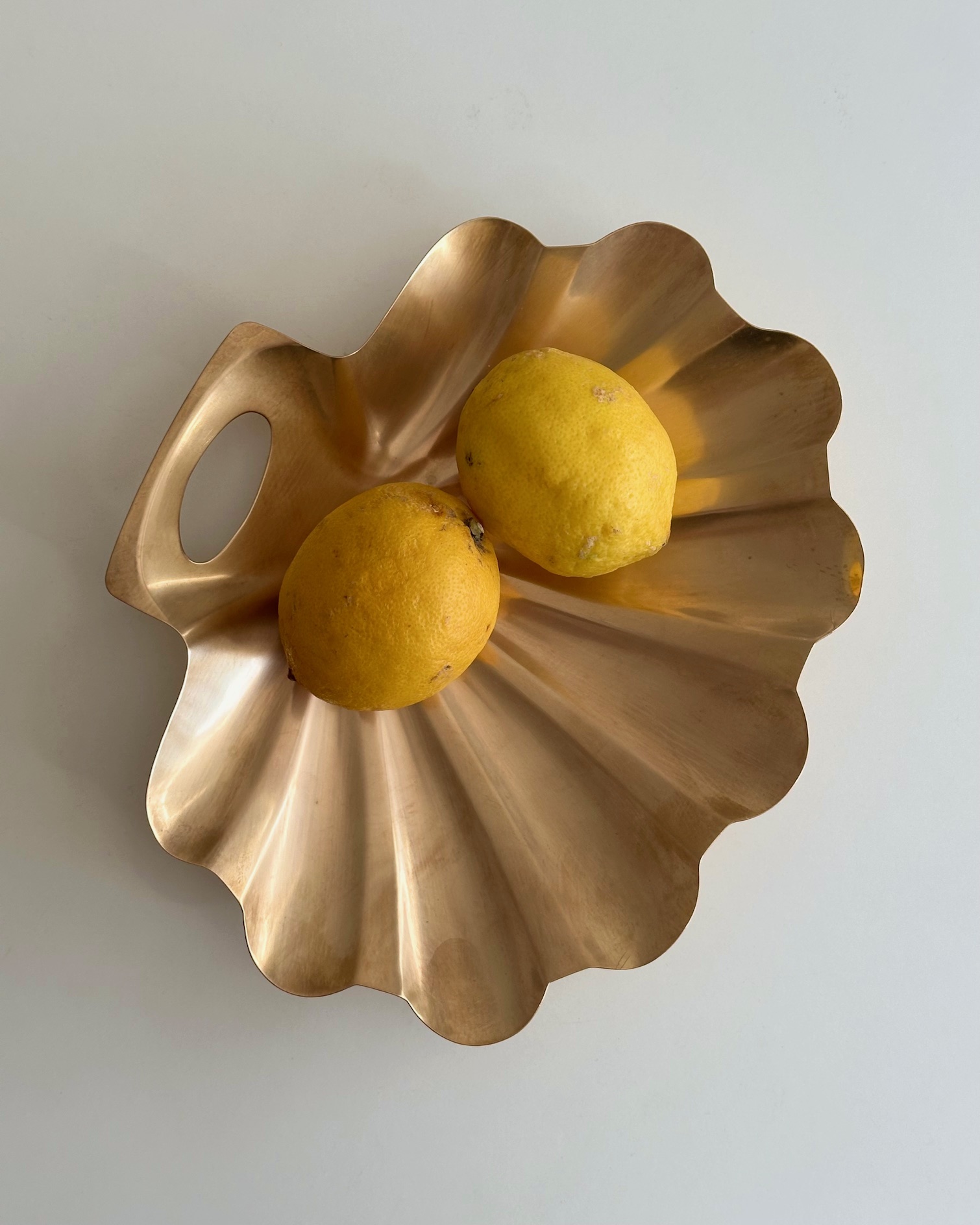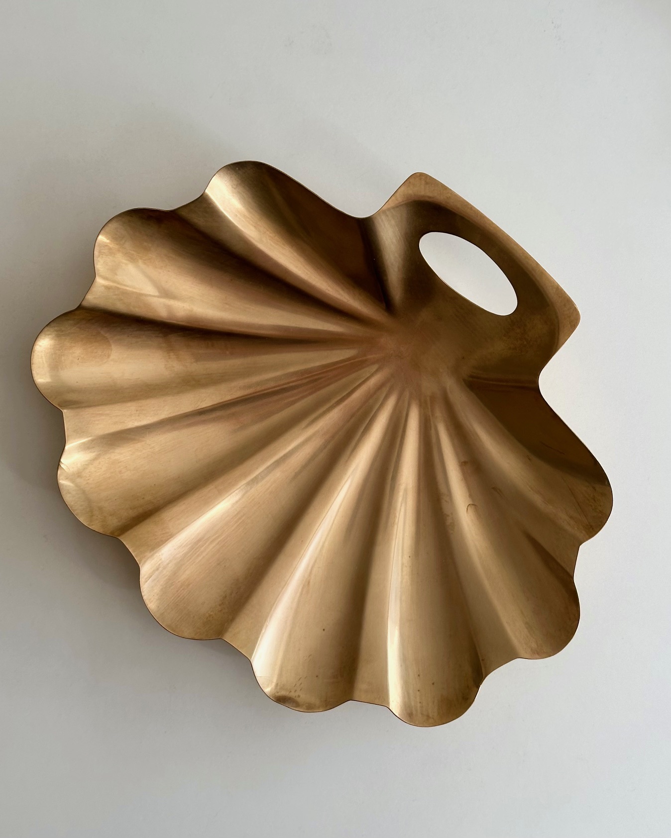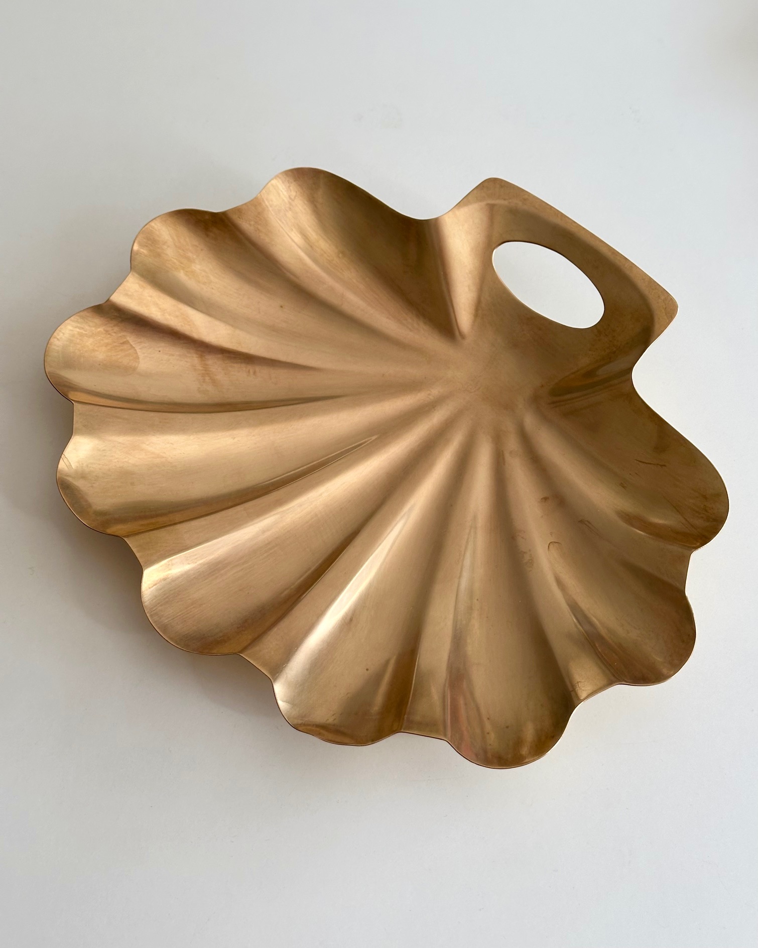 Muslingeformet fad af messing. Engang fejebakke med tilhørende kost, nu frugtskål eller brødfad.