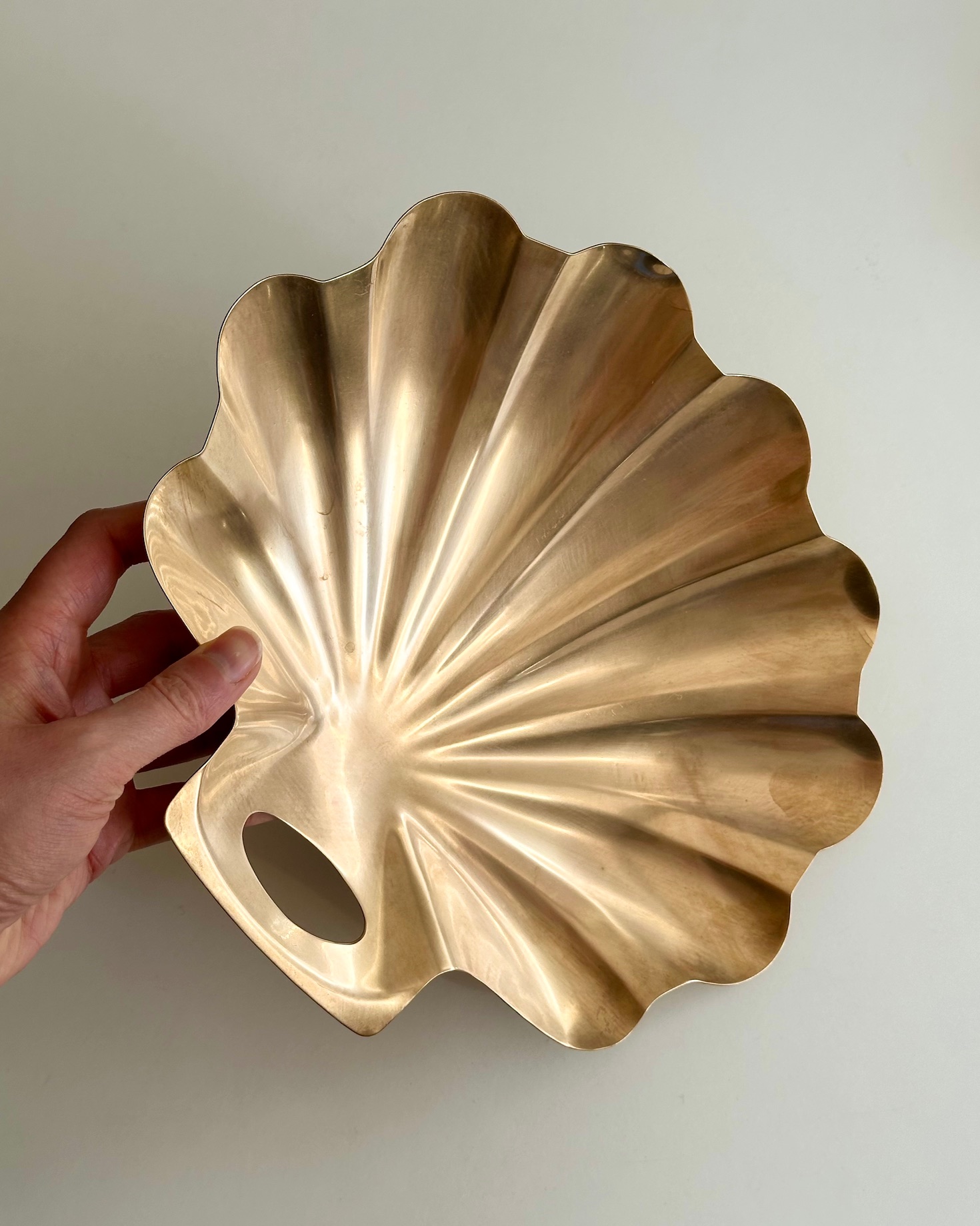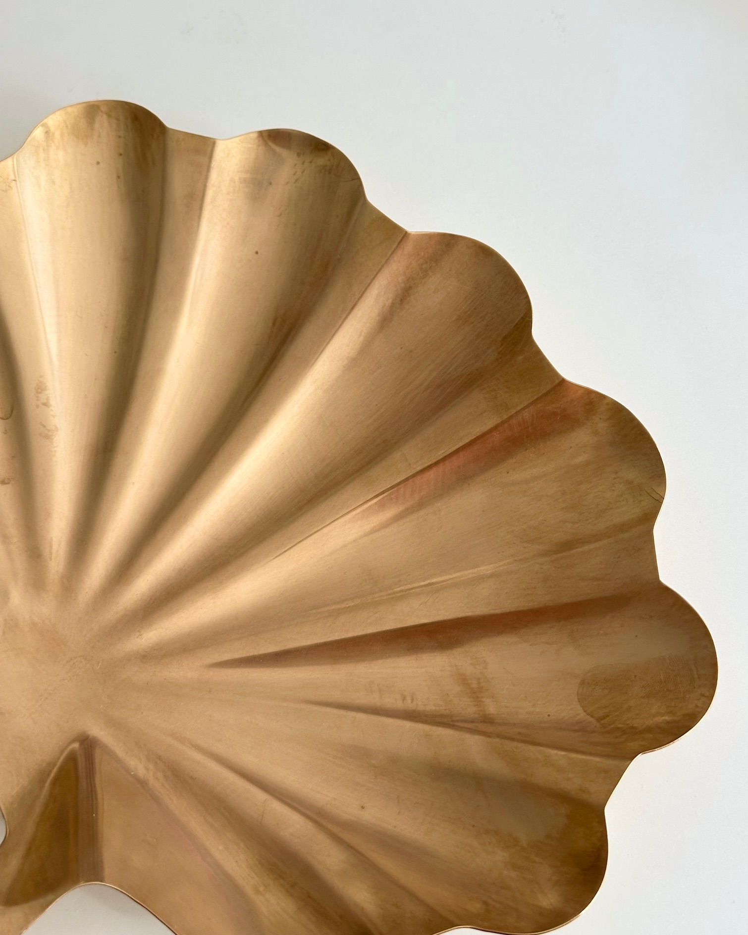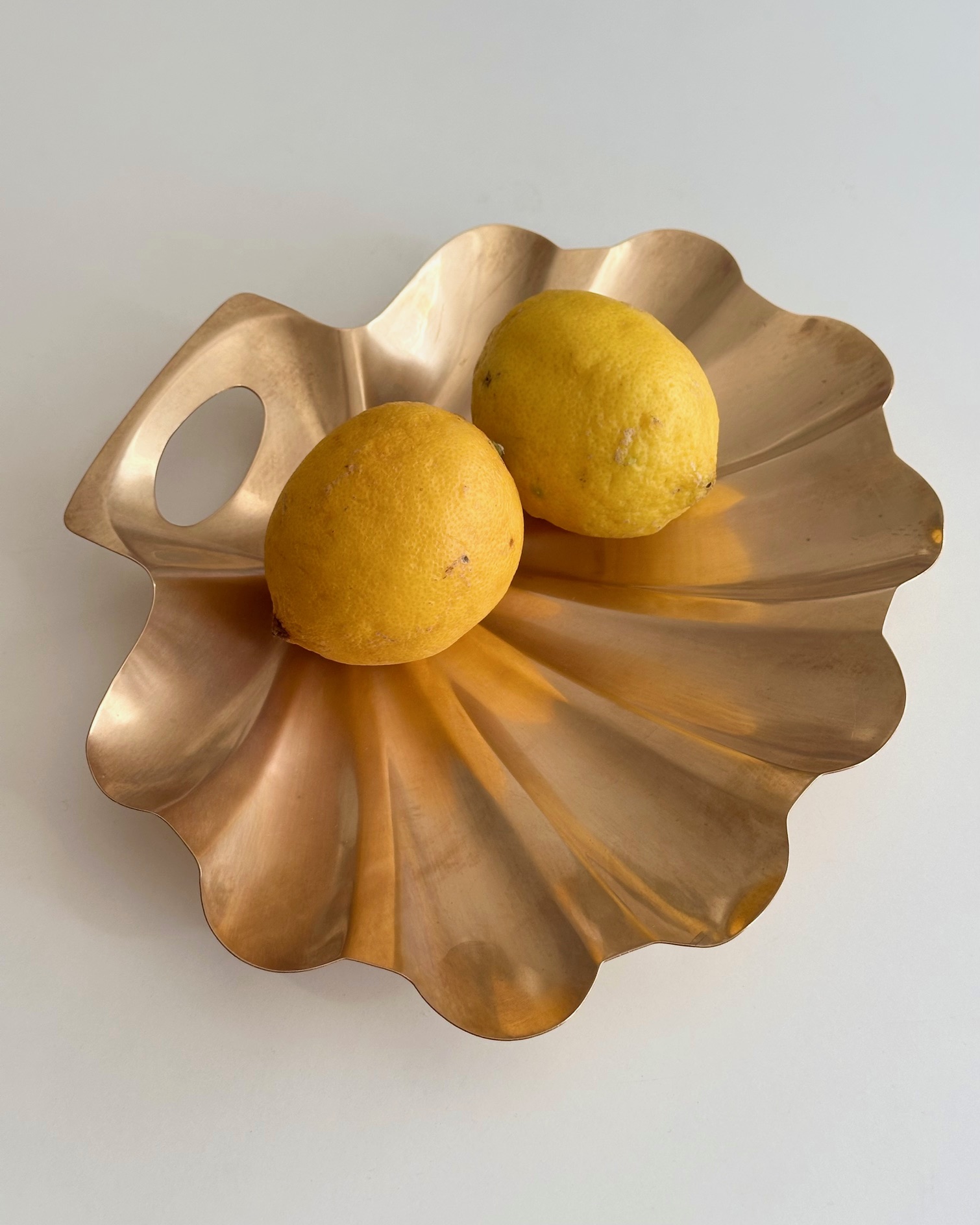 Muslingeformet fad af messing. Engang fejebakke med tilhørende kost, nu frugtskål eller brødfad.