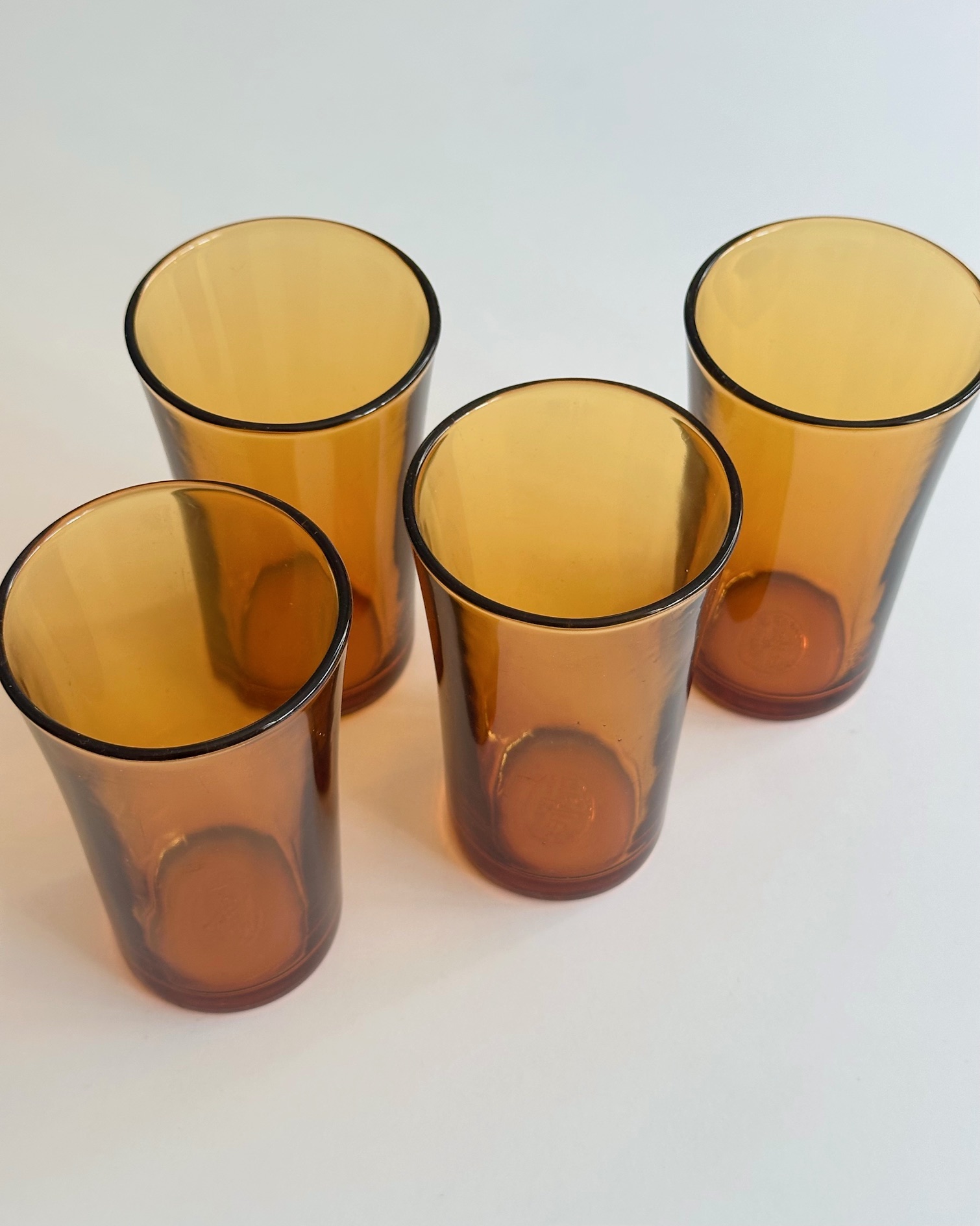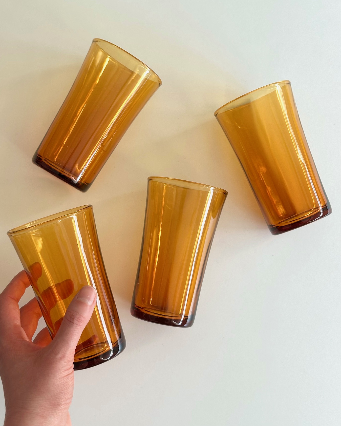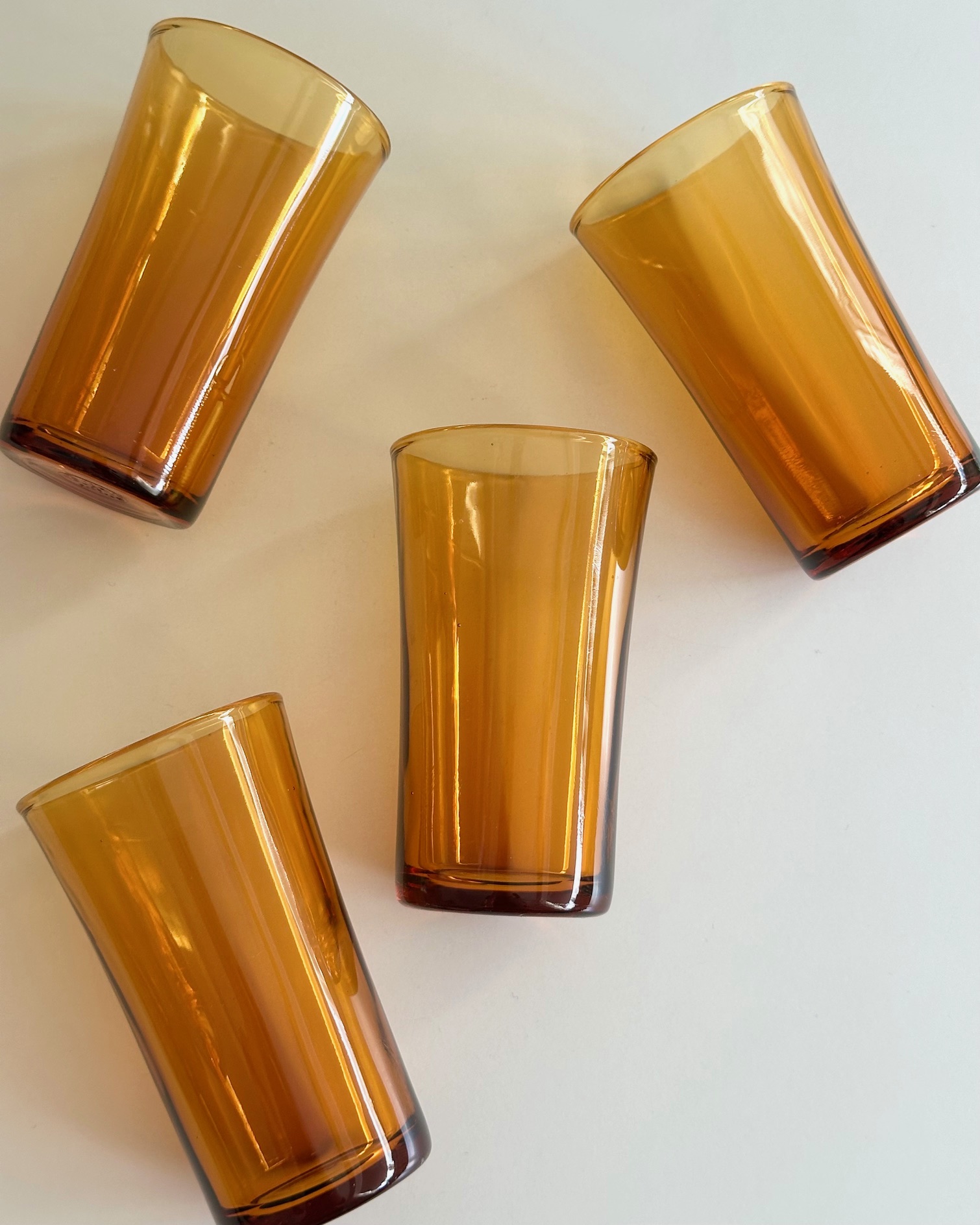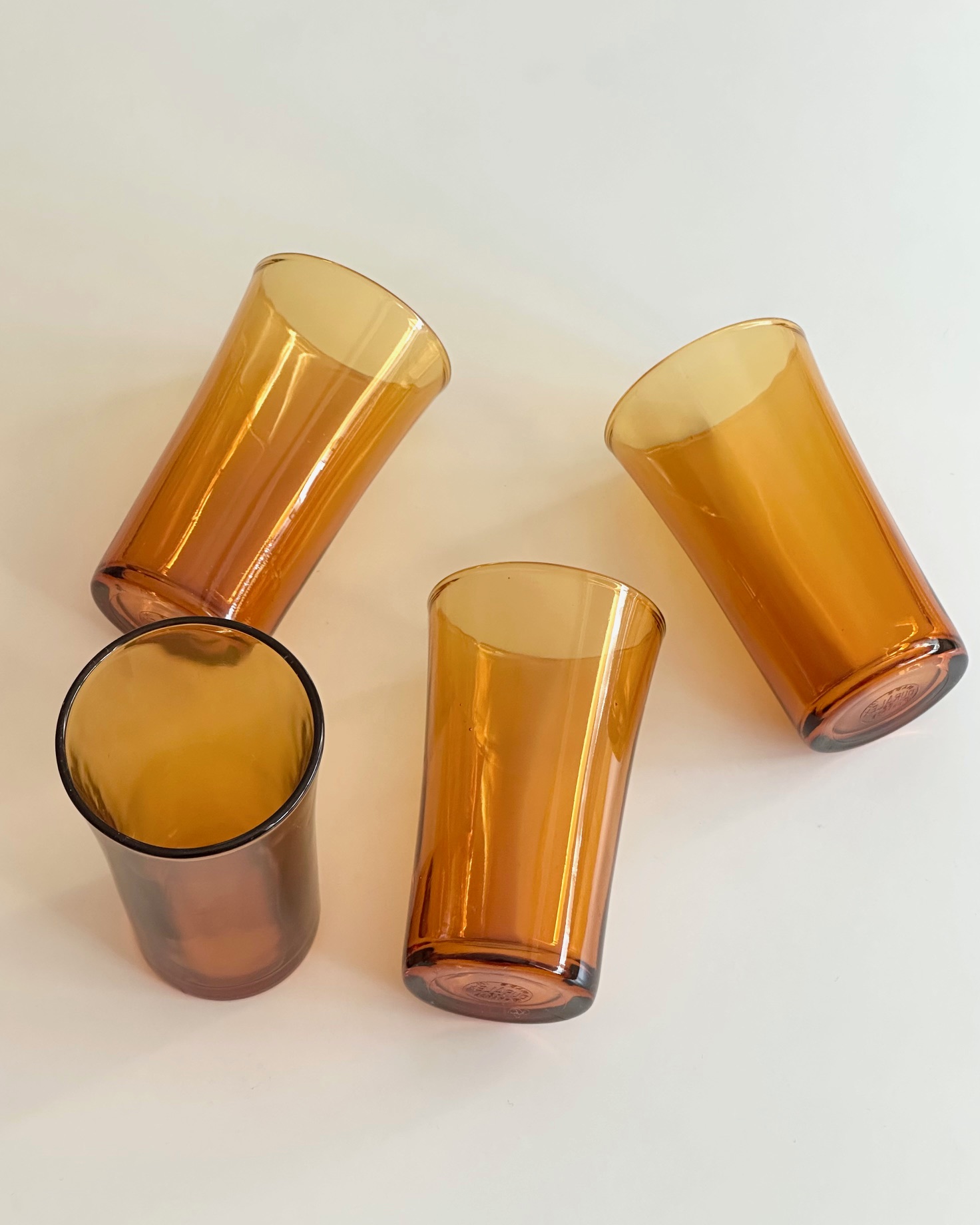 4 ravfarvede drikkeglas/longdrinkglas fra franske Duralex