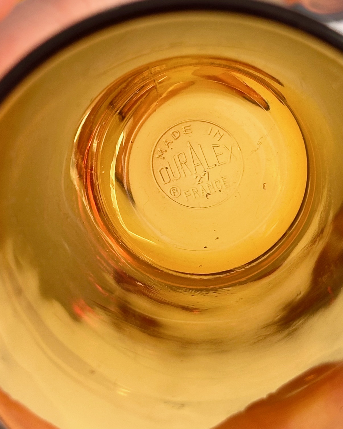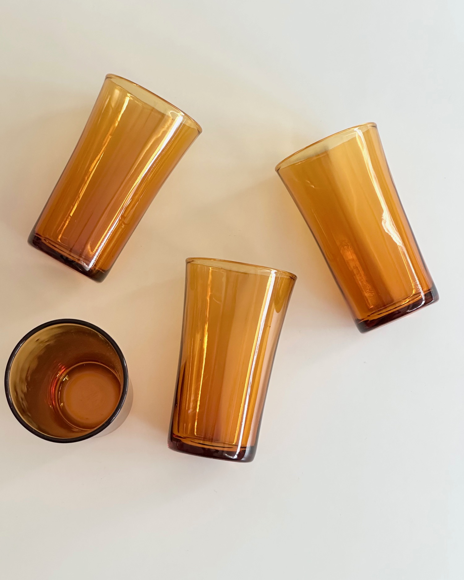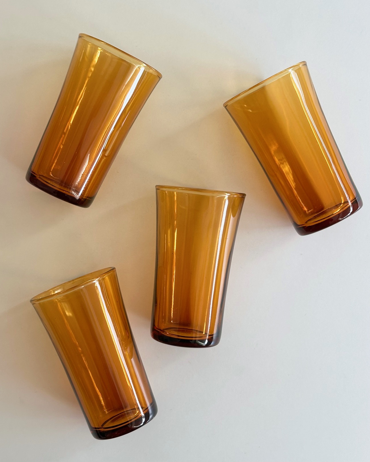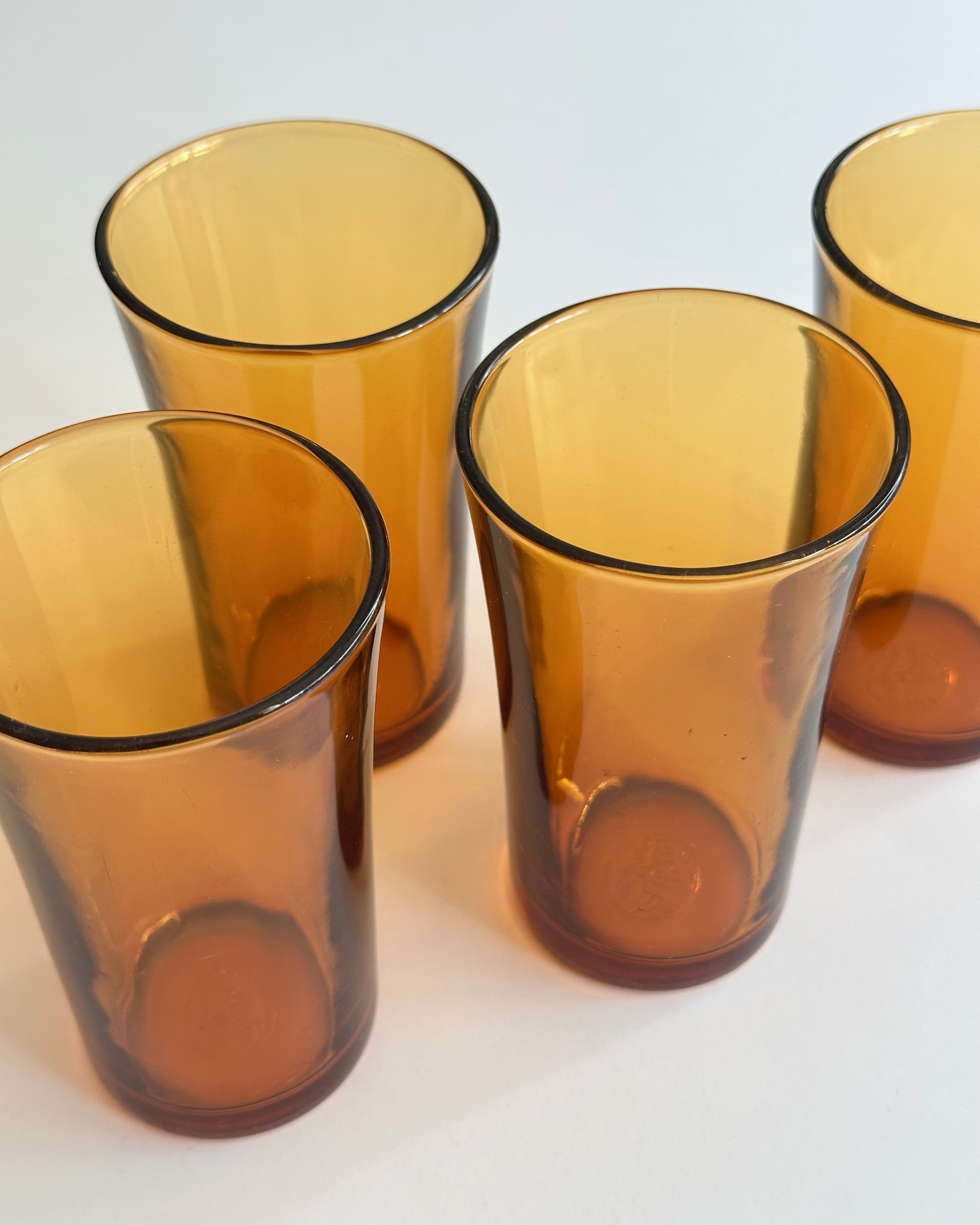 4 ravfarvede drikkeglas/longdrinkglas fra franske Duralex