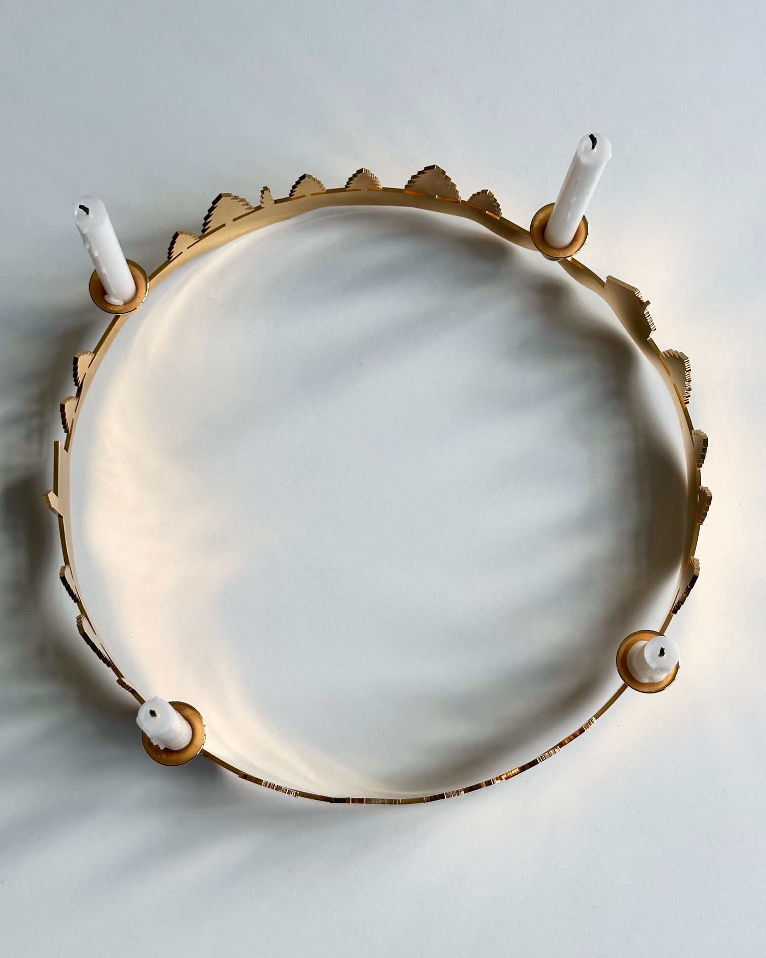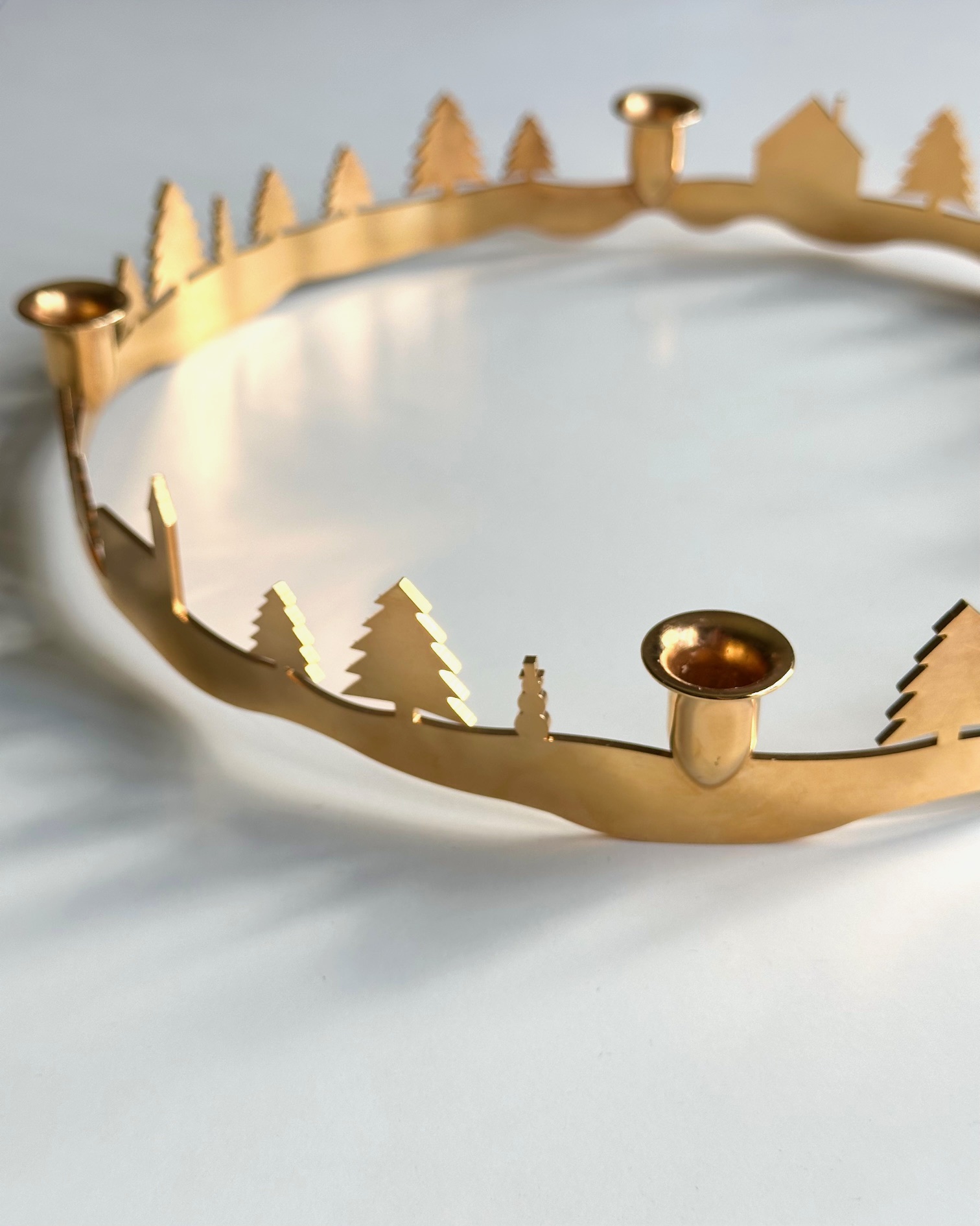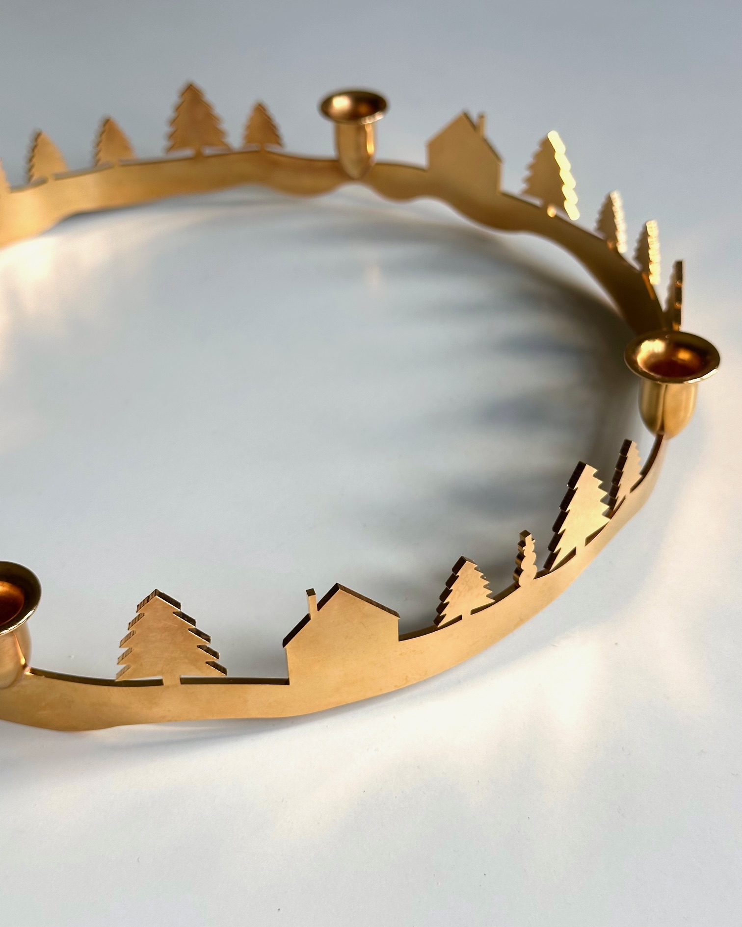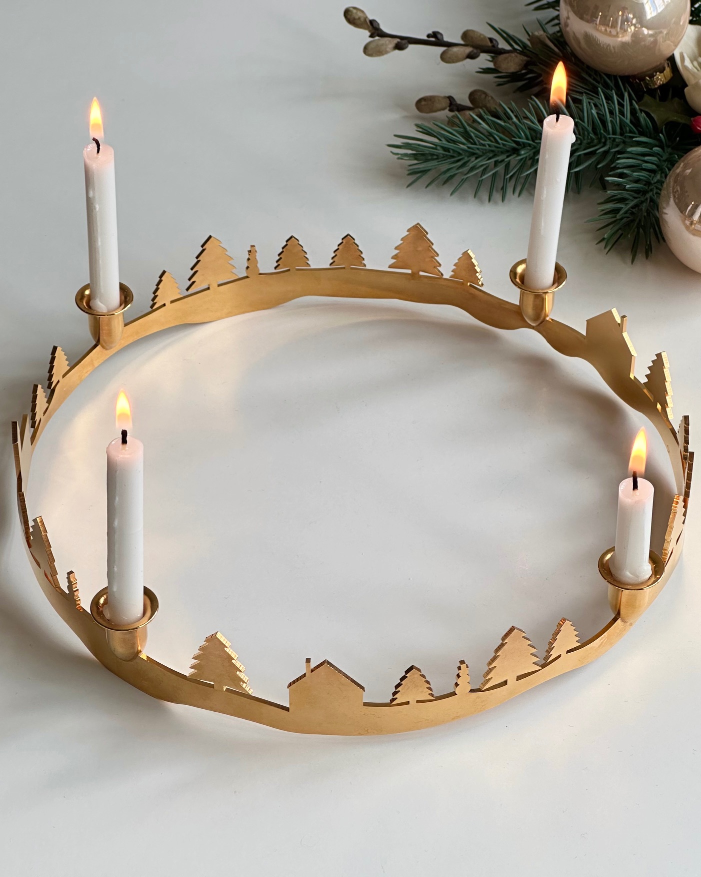 Guldbelagt adventsstage med huse, træer og snemænd, til juletræslys