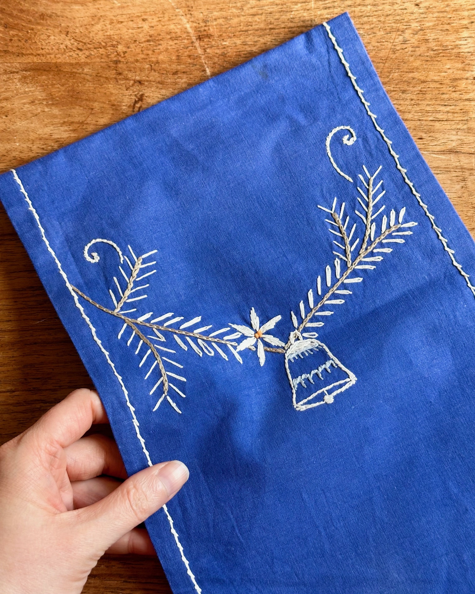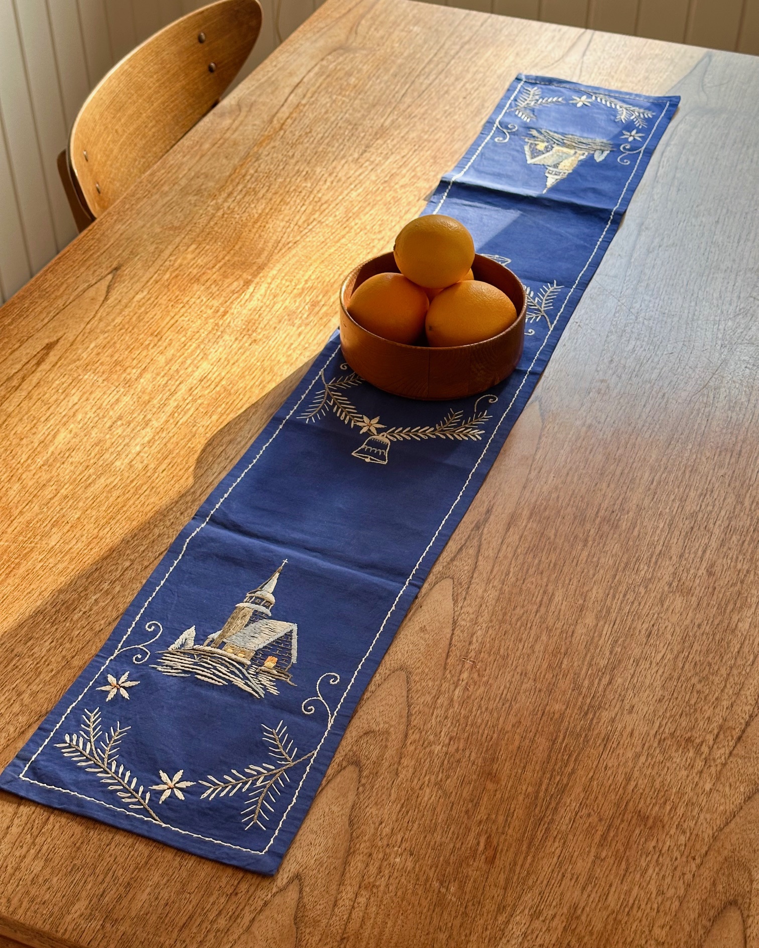 Håndbroderet bordløber, blå m kirke, 120 x 21 cm