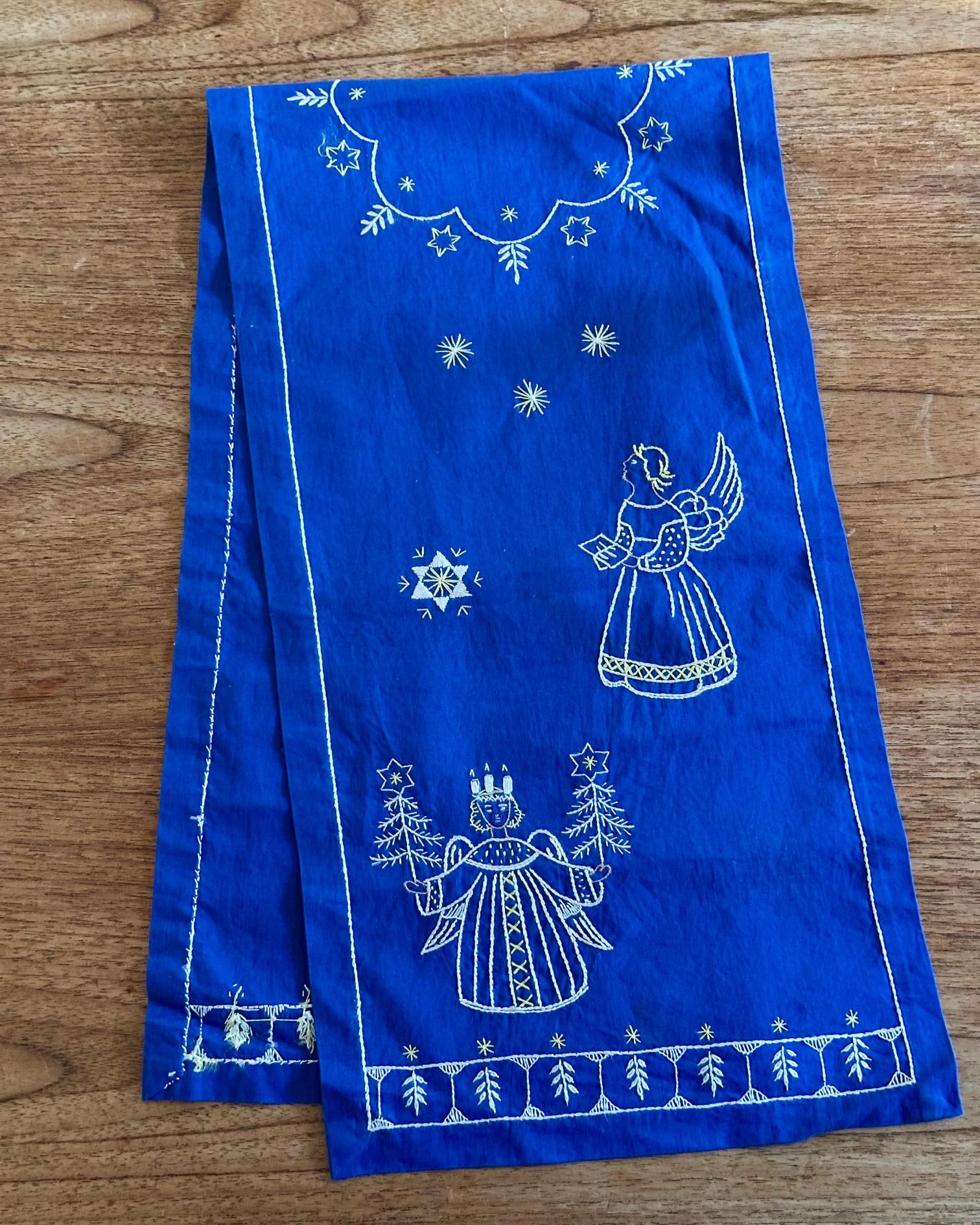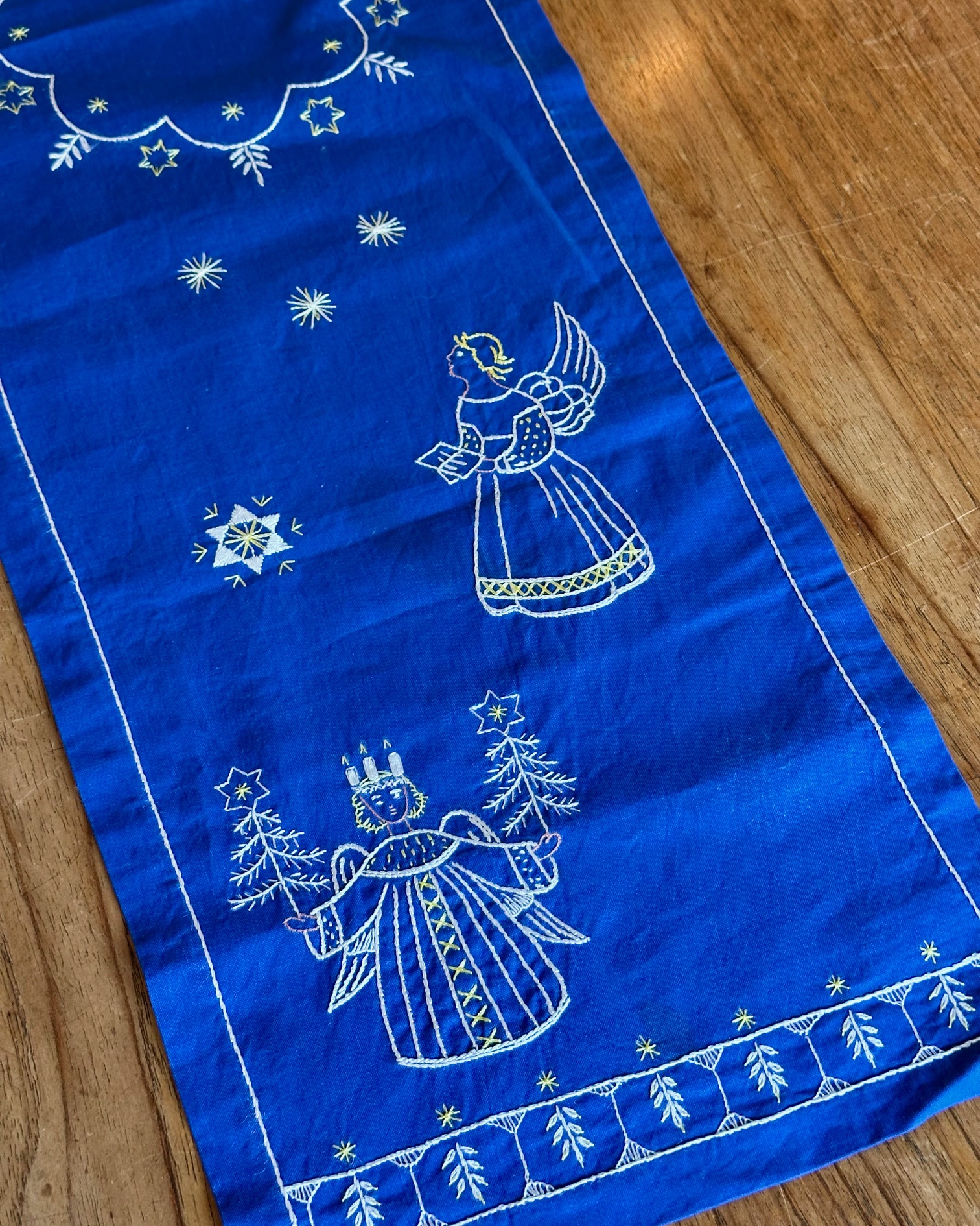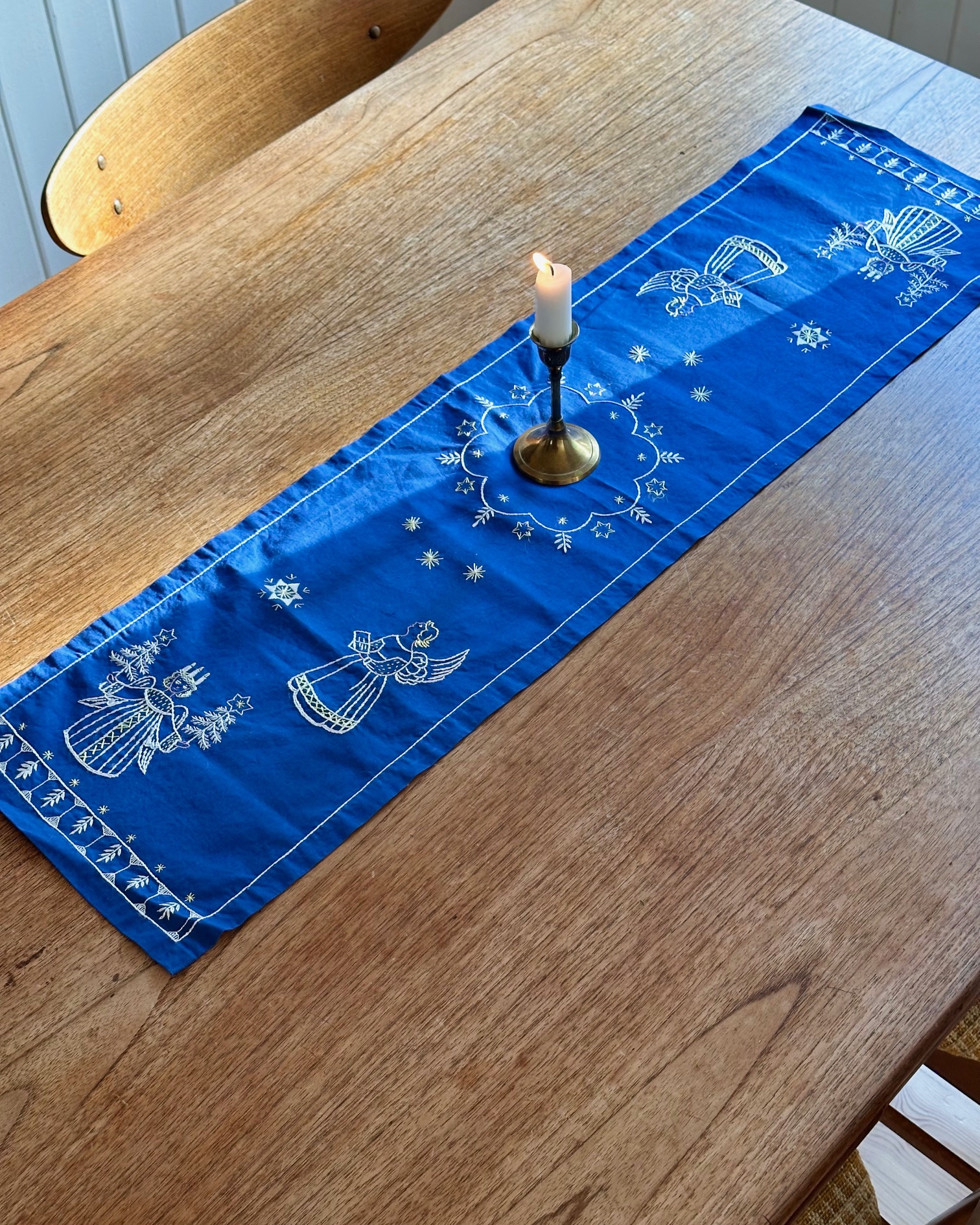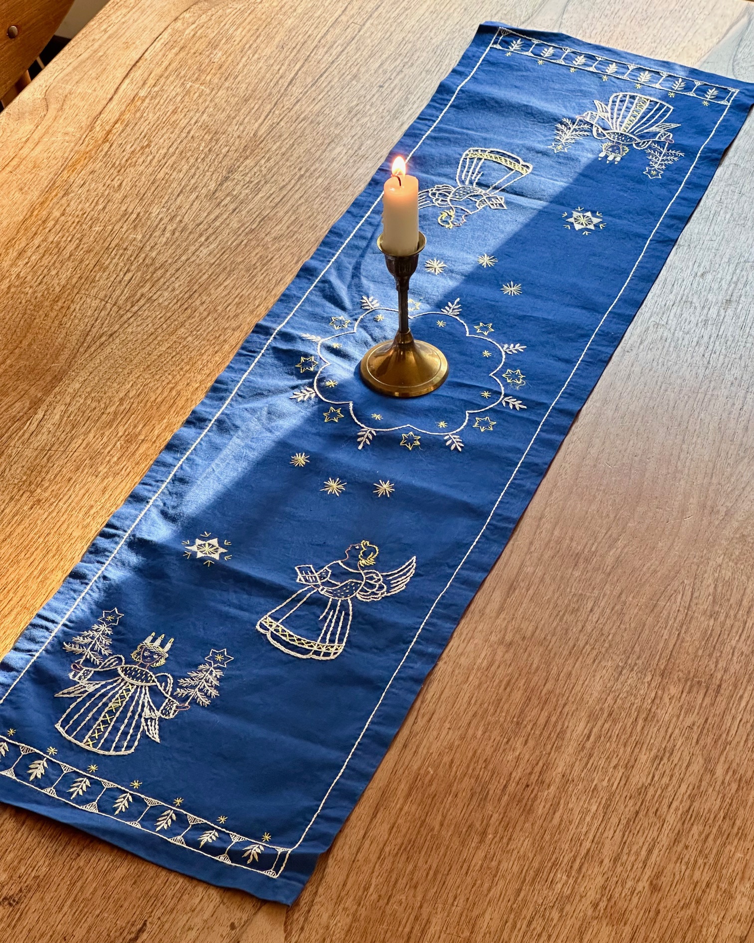 Håndbroderet bordløber, blå m engle, 93 x 25 cm