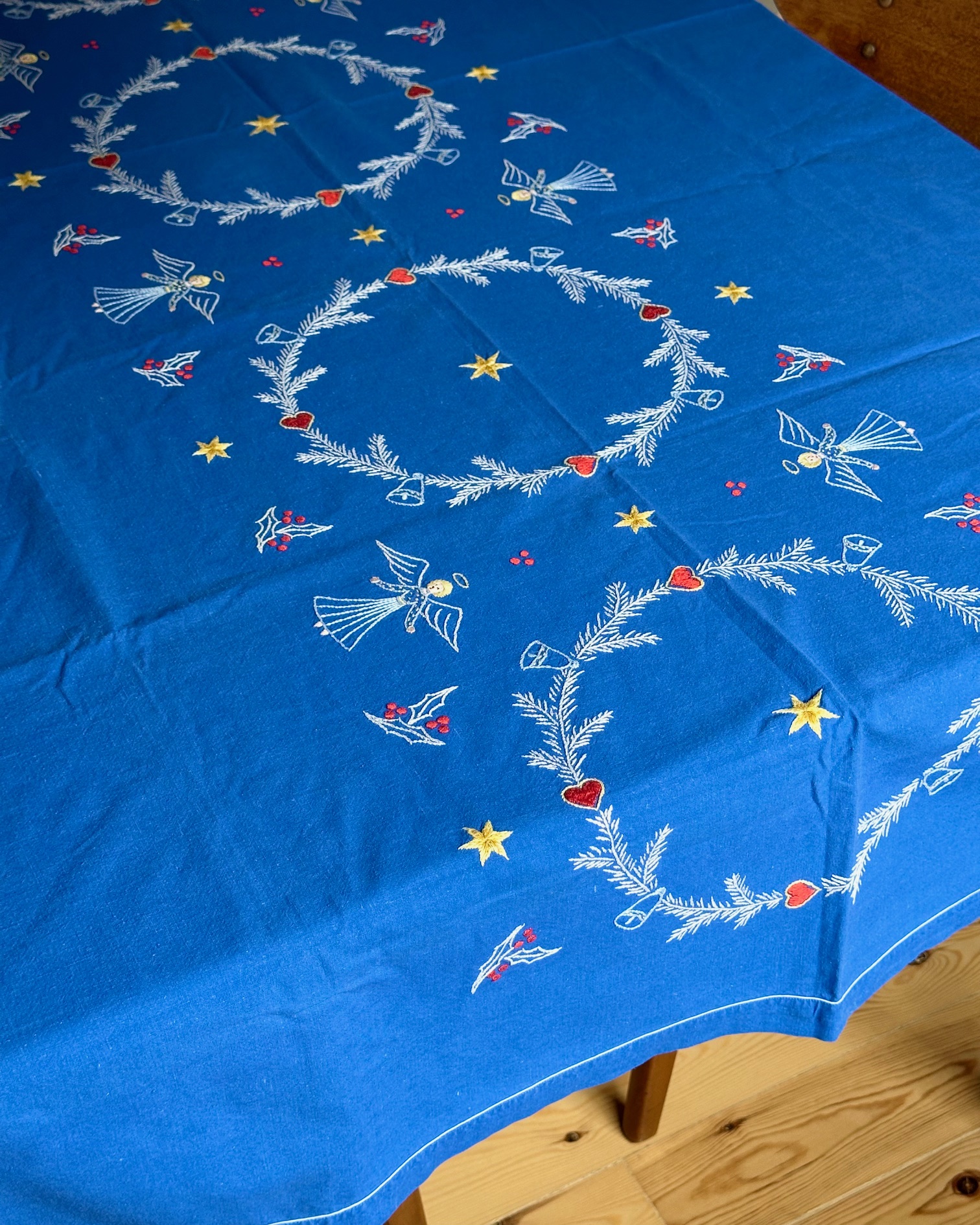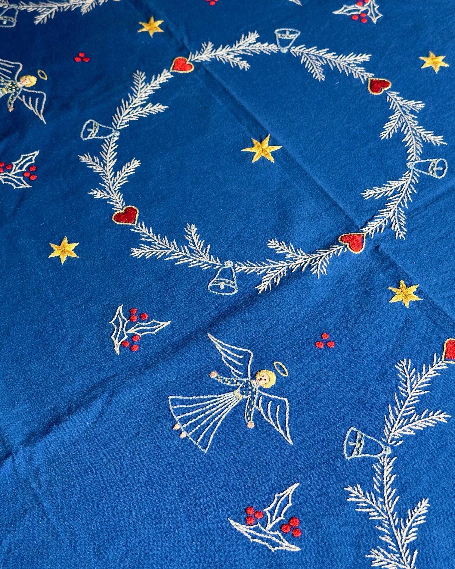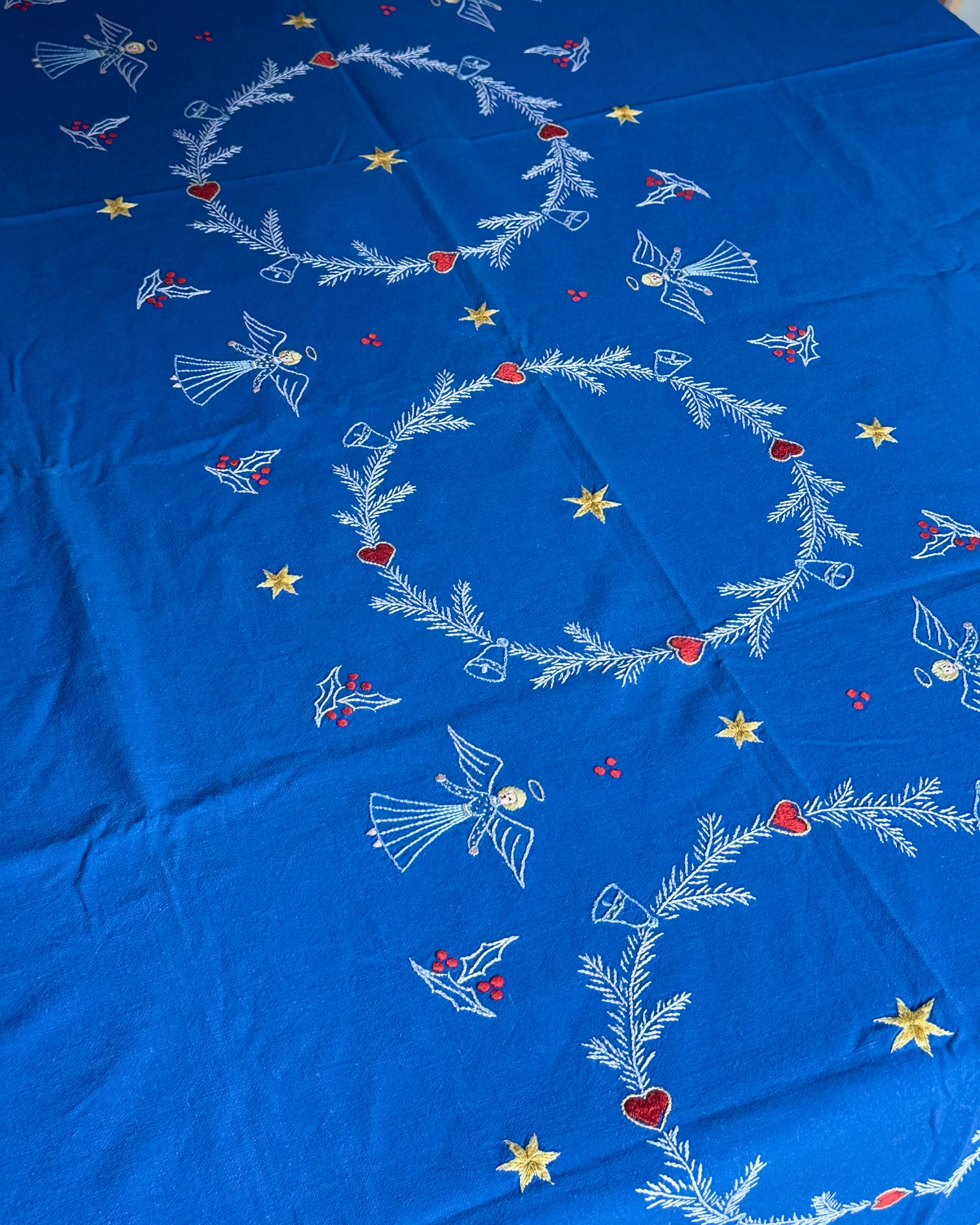 Blå juledug, håndbroderet med engle, krisstjørn og ranker