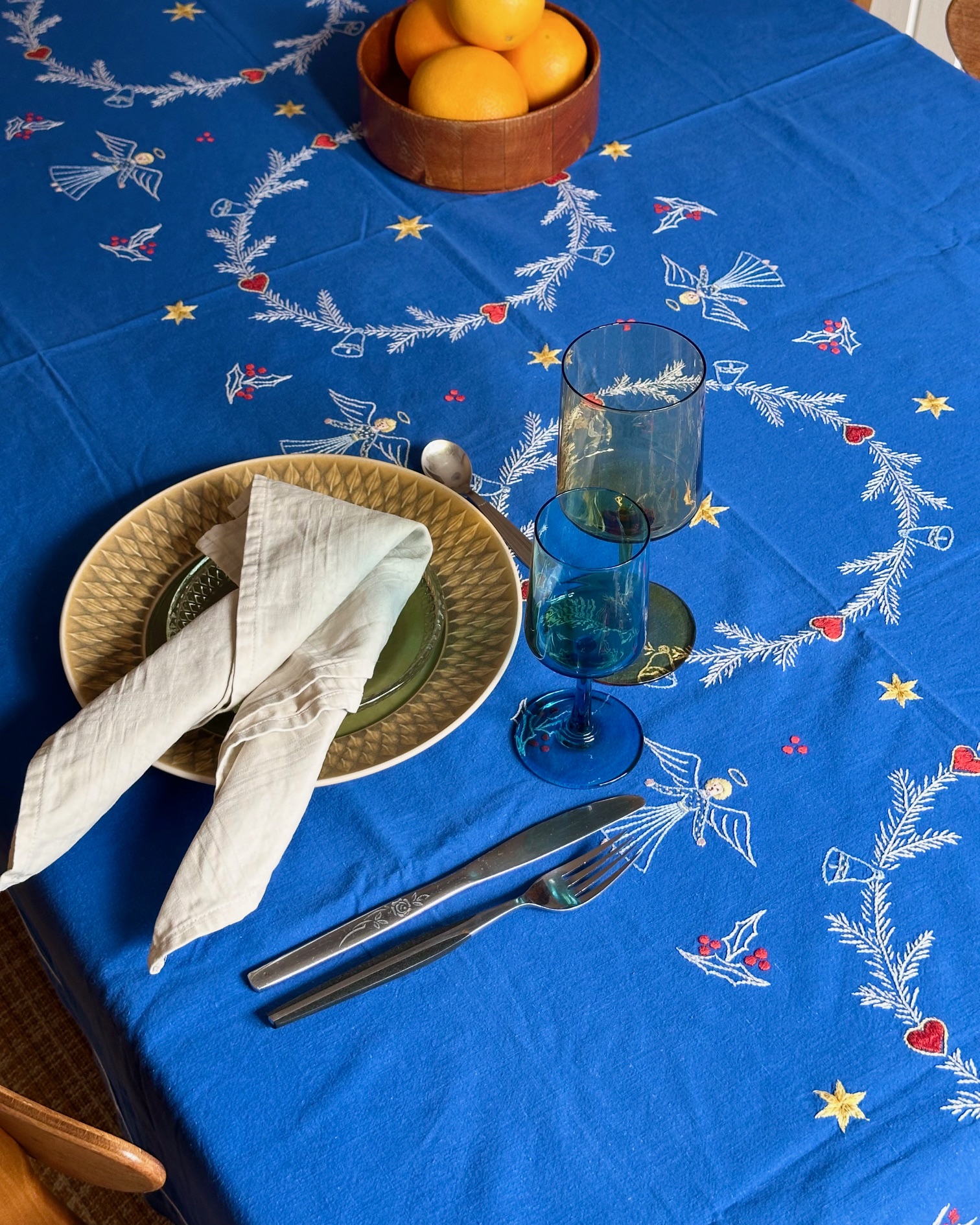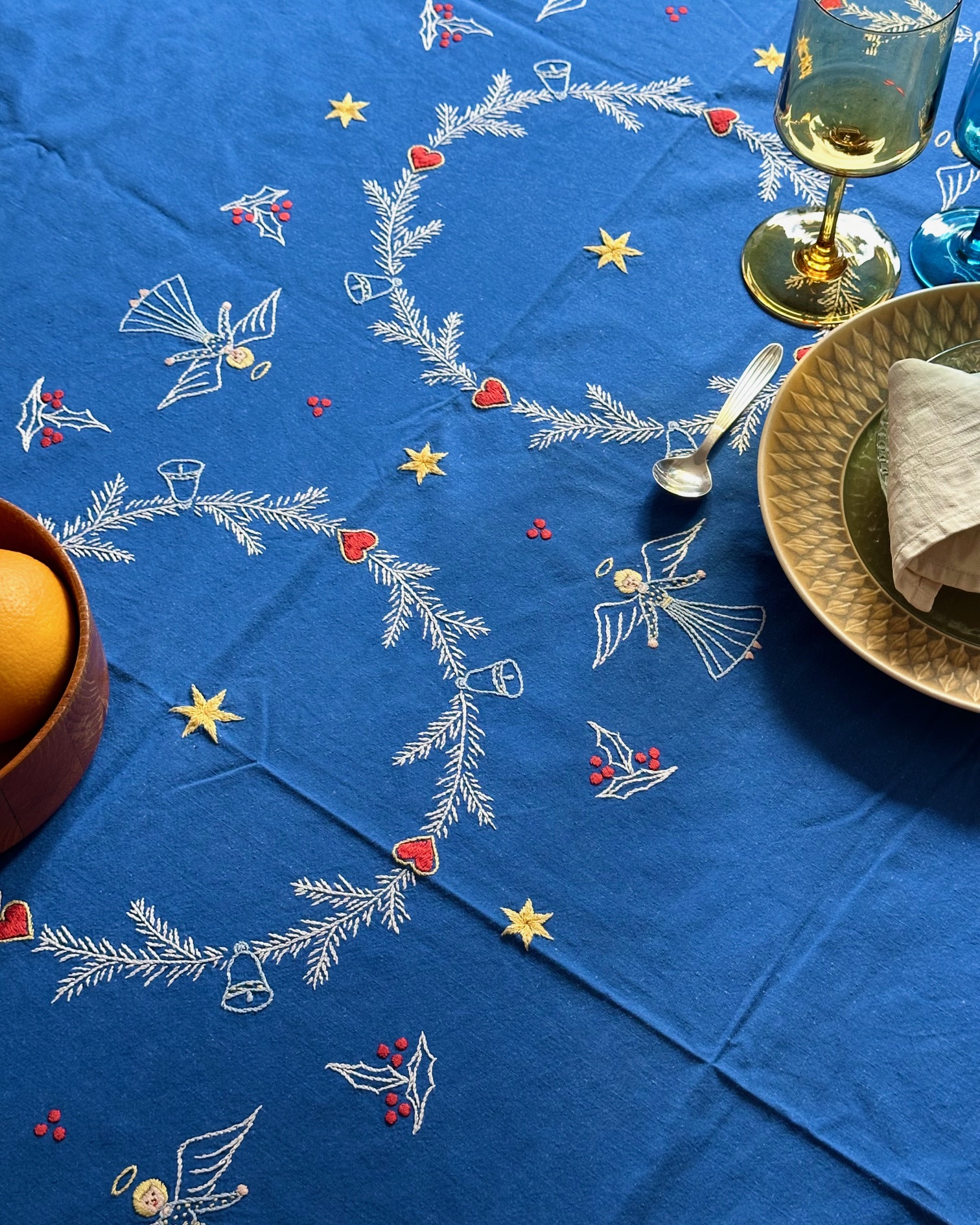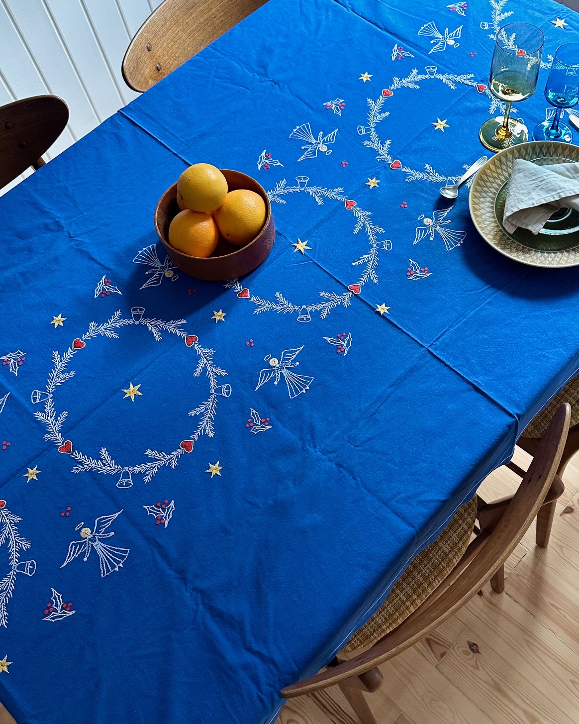 Blå juledug, håndbroderet med engle, krisstjørn og ranker
