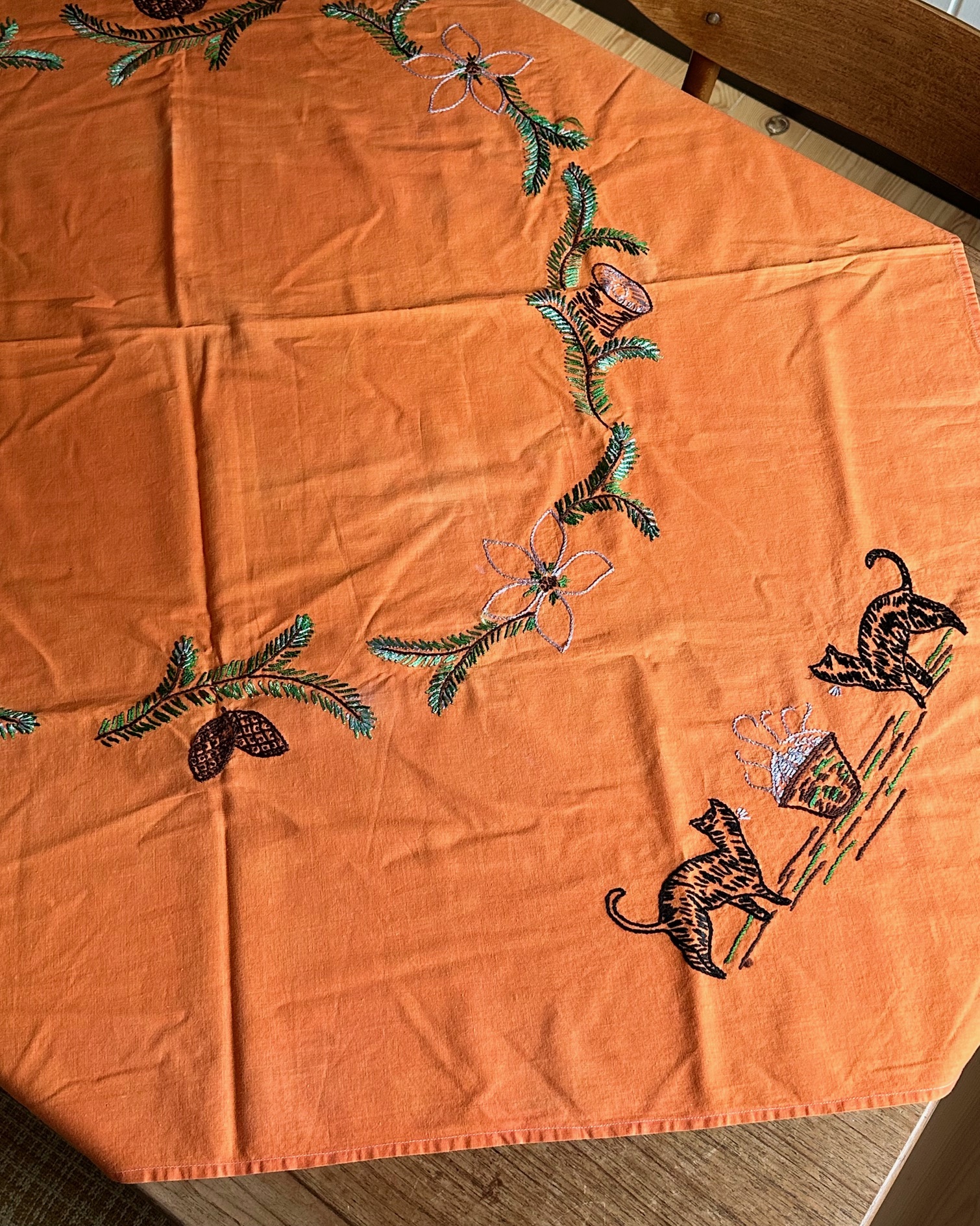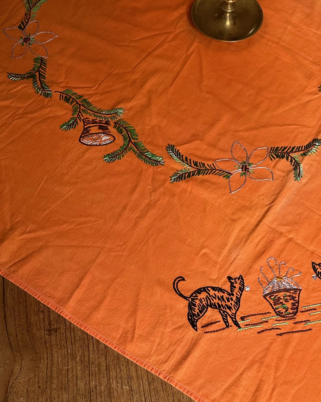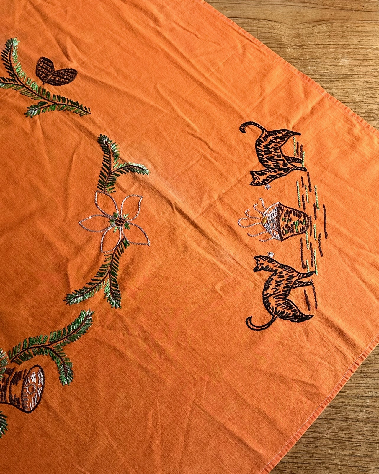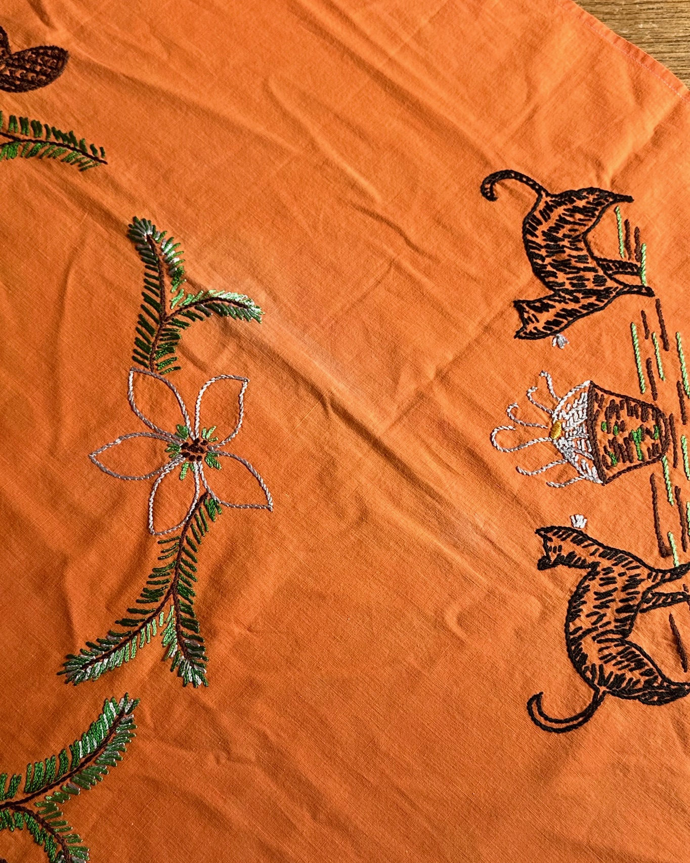 Antik juledug af orange stof. Håndbroderet med granranker, katte og grød