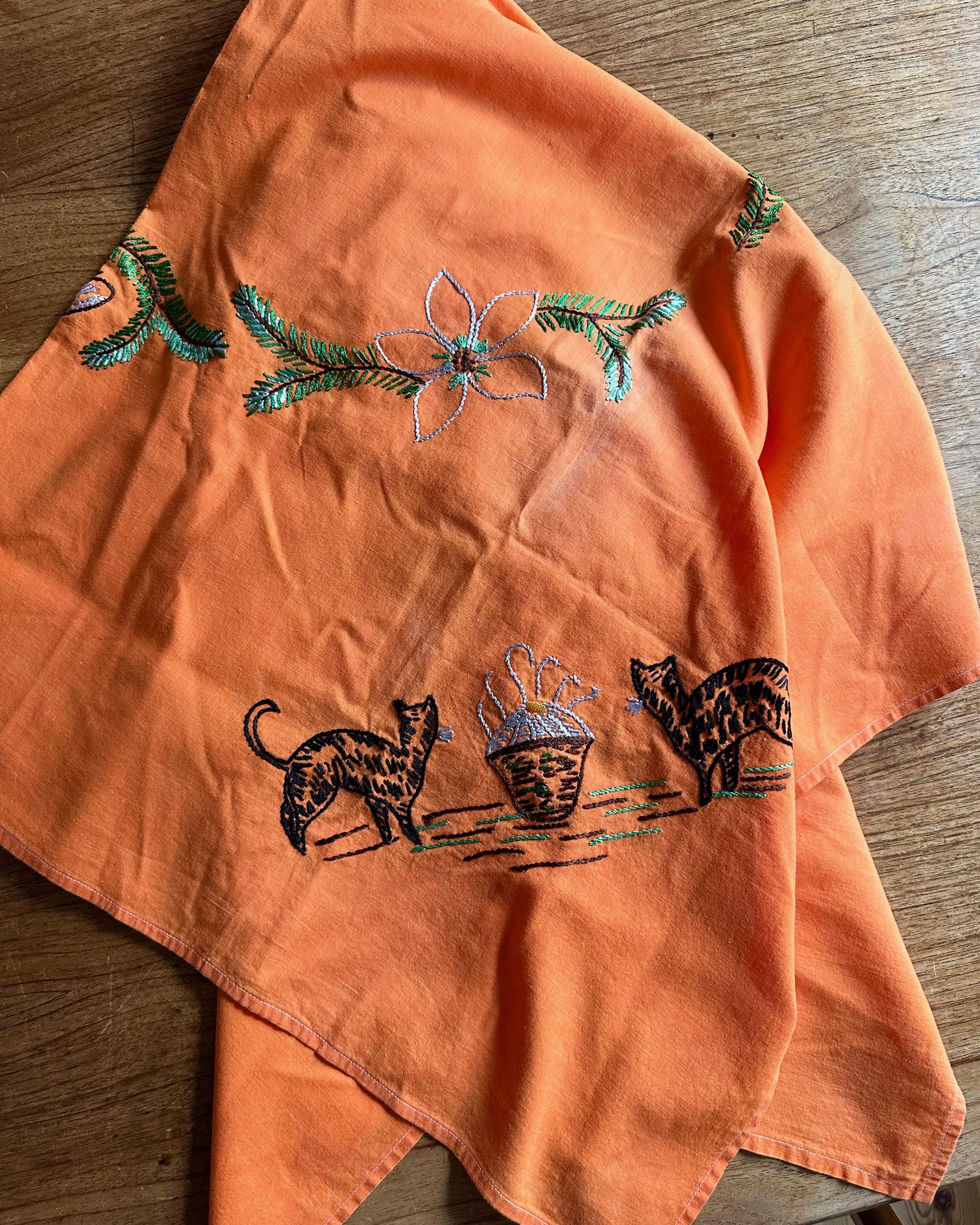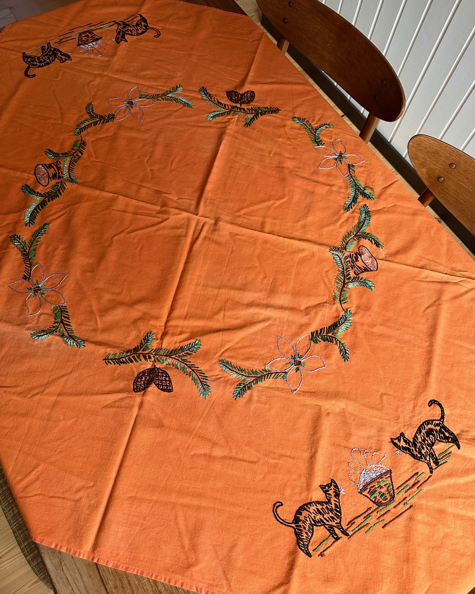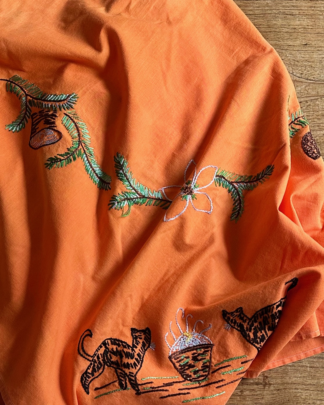 Antik juledug af orange stof. Håndbroderet med granranker, katte og grød