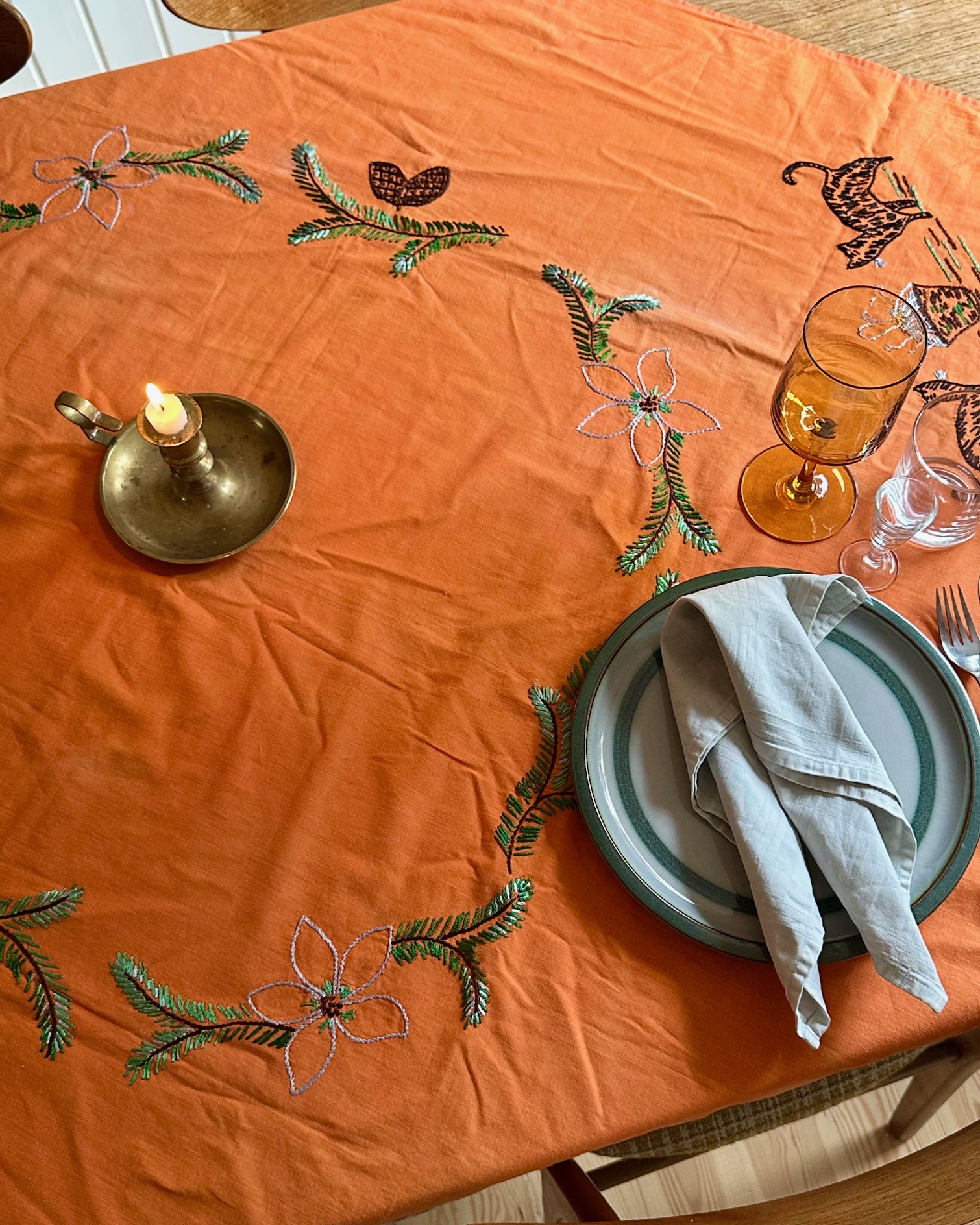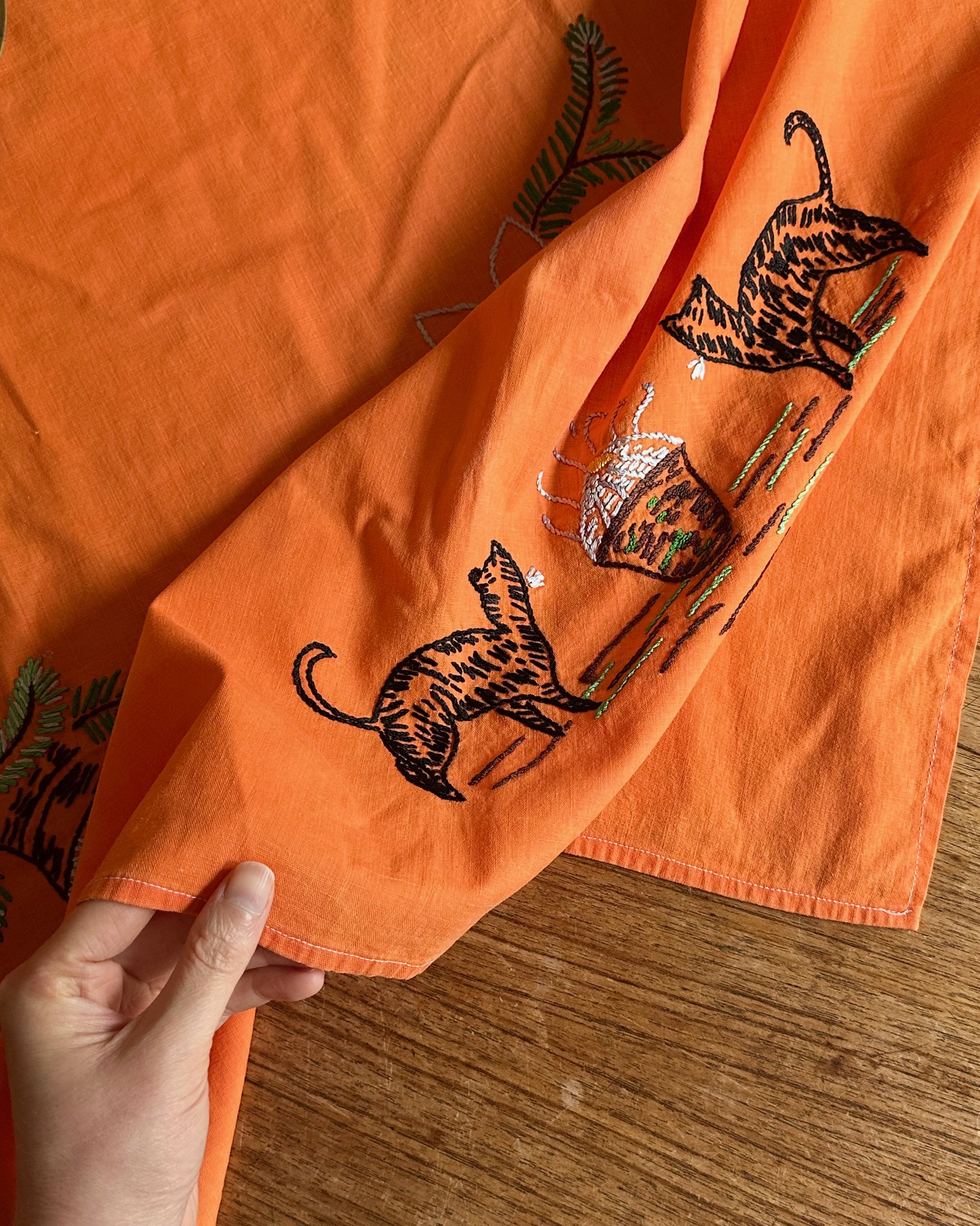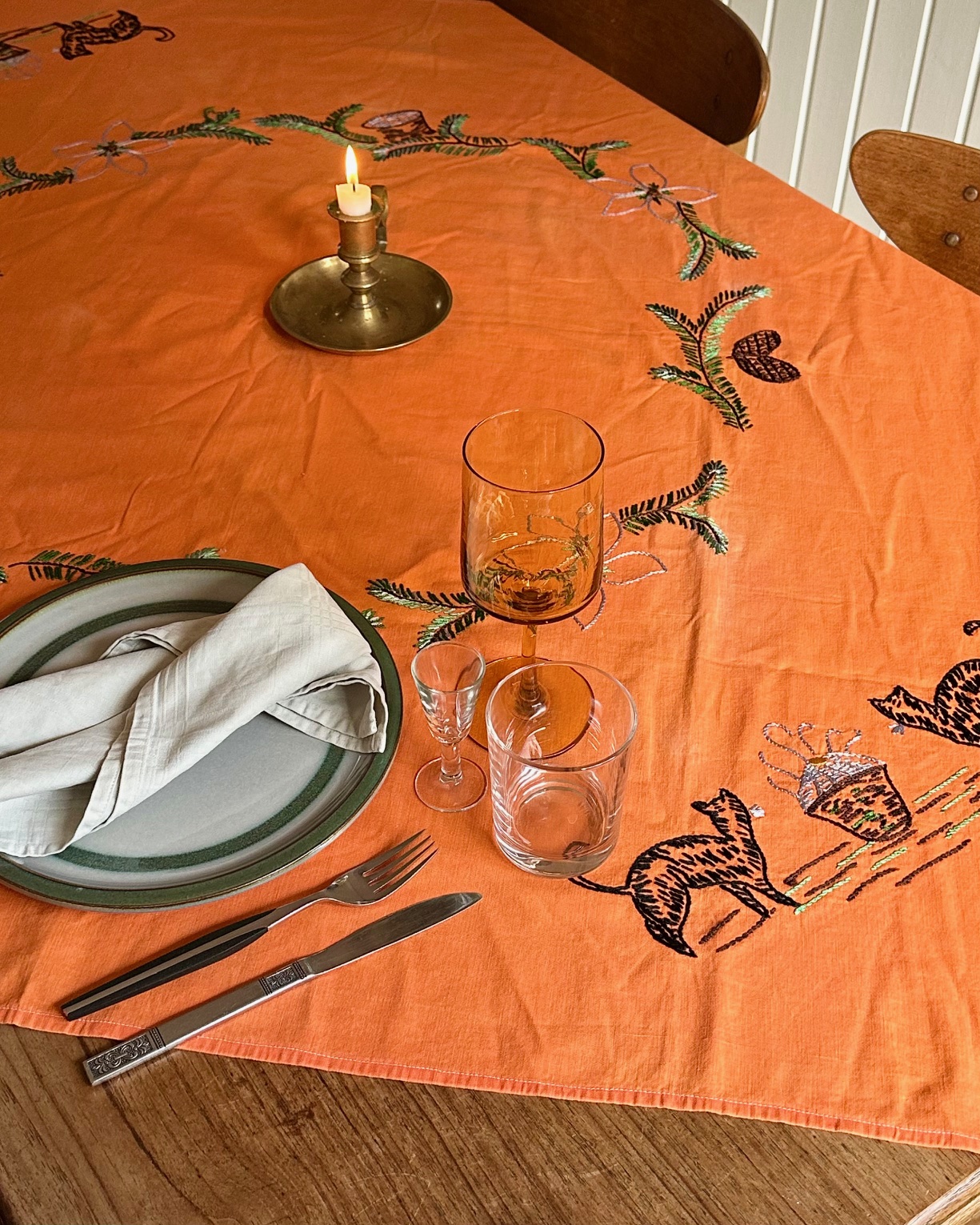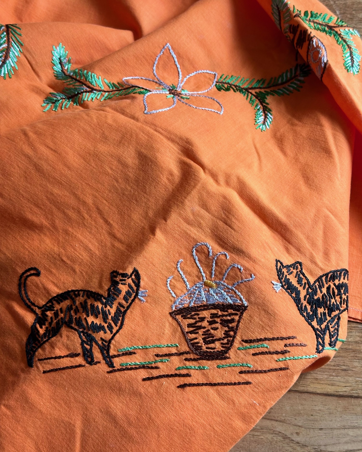 Antik juledug af orange stof. Håndbroderet med granranker, katte og grød