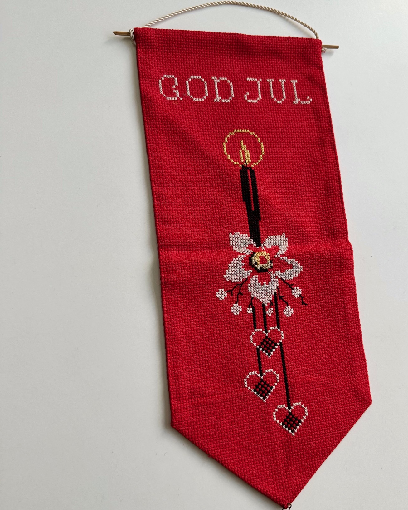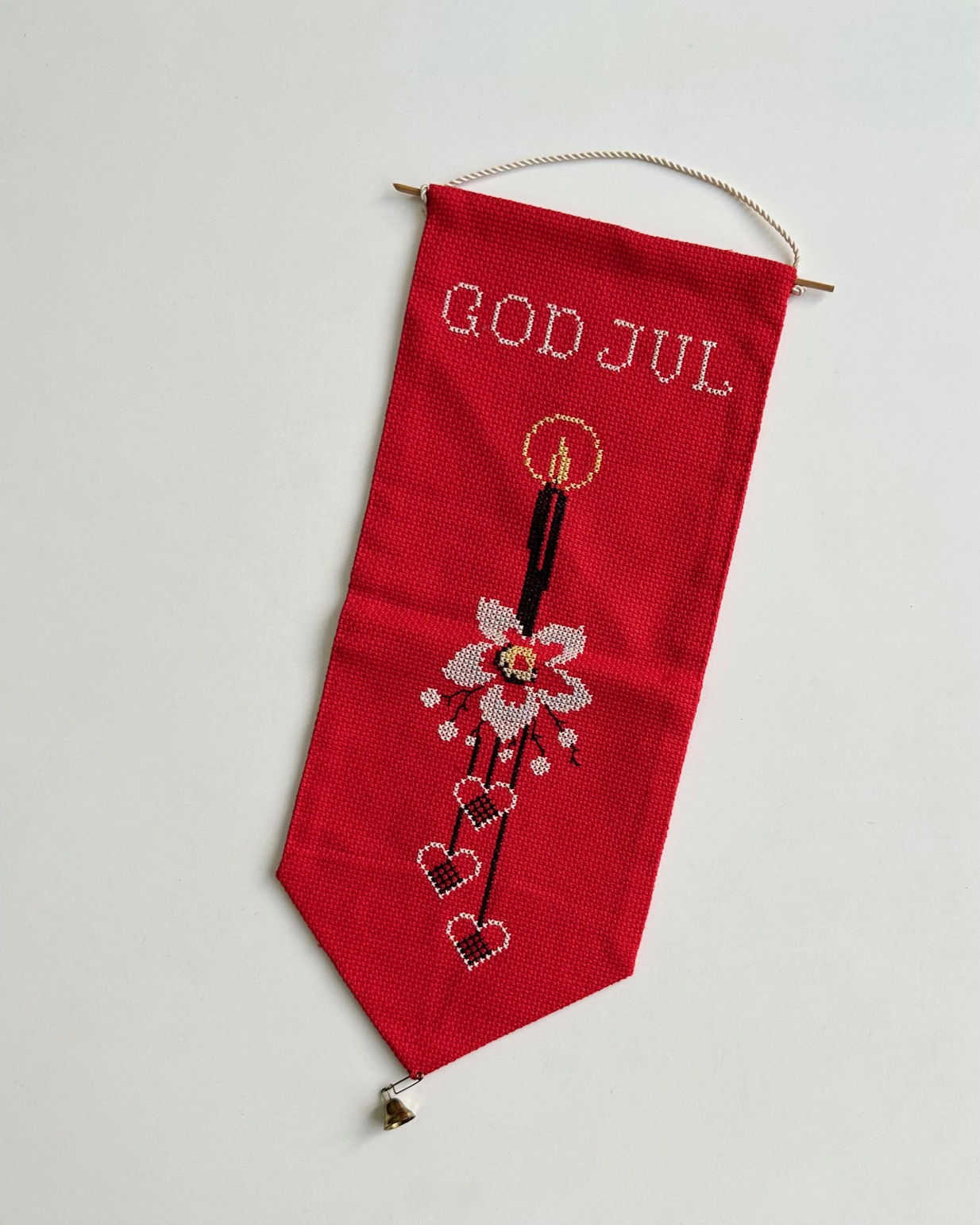 Broderet klokkestreng med skriften "God Jul" og lille klokke