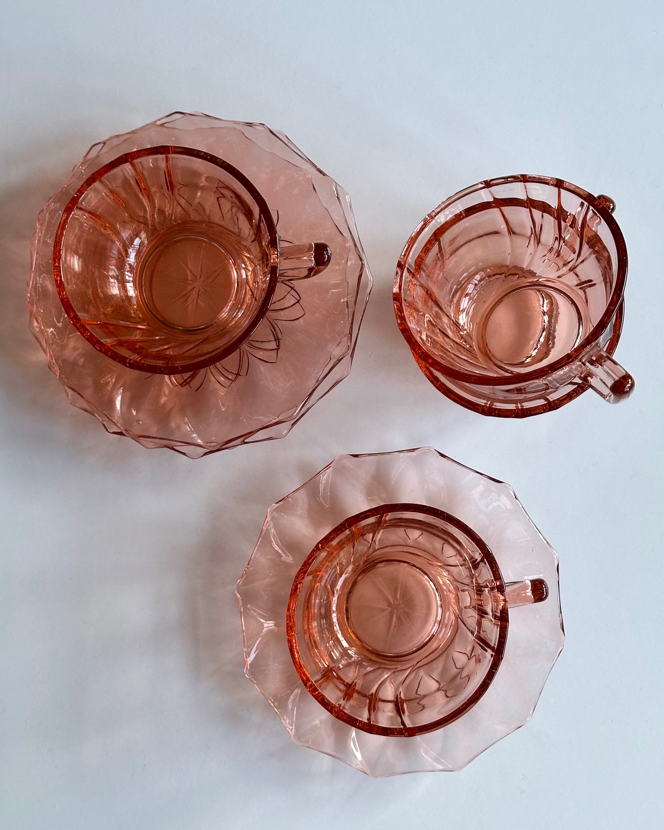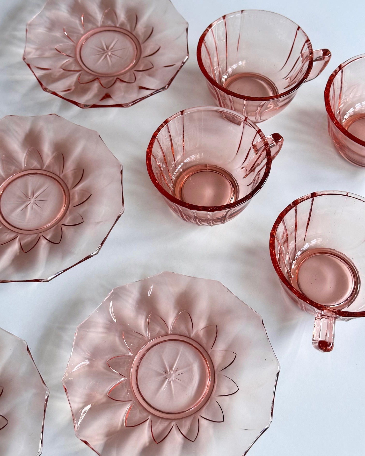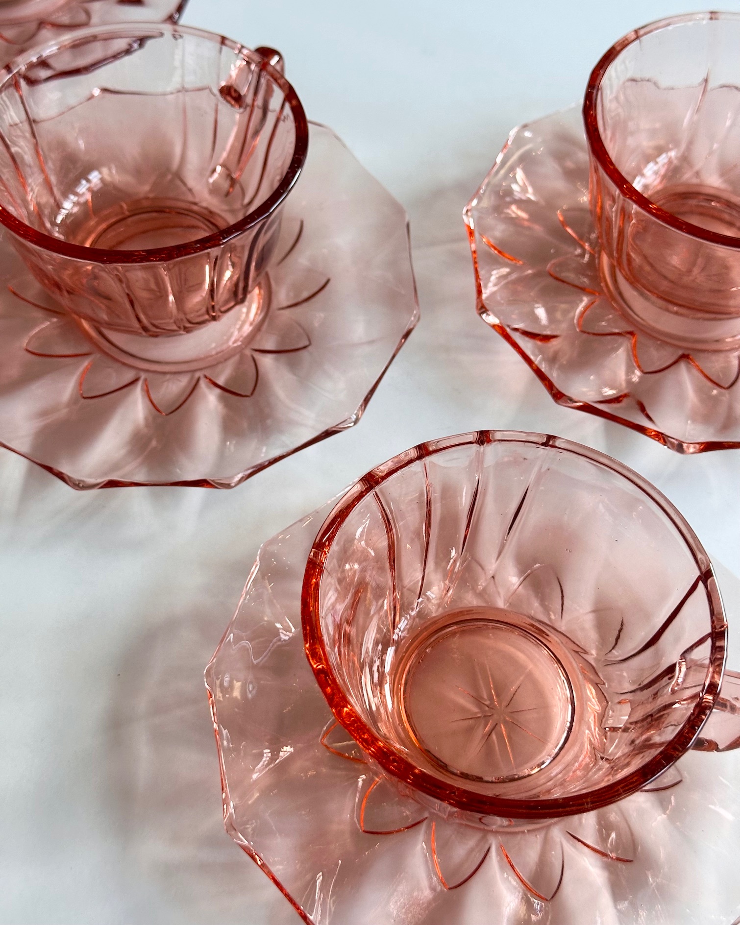Kopper m underkopper, rosa glas, 4 sæt samlet