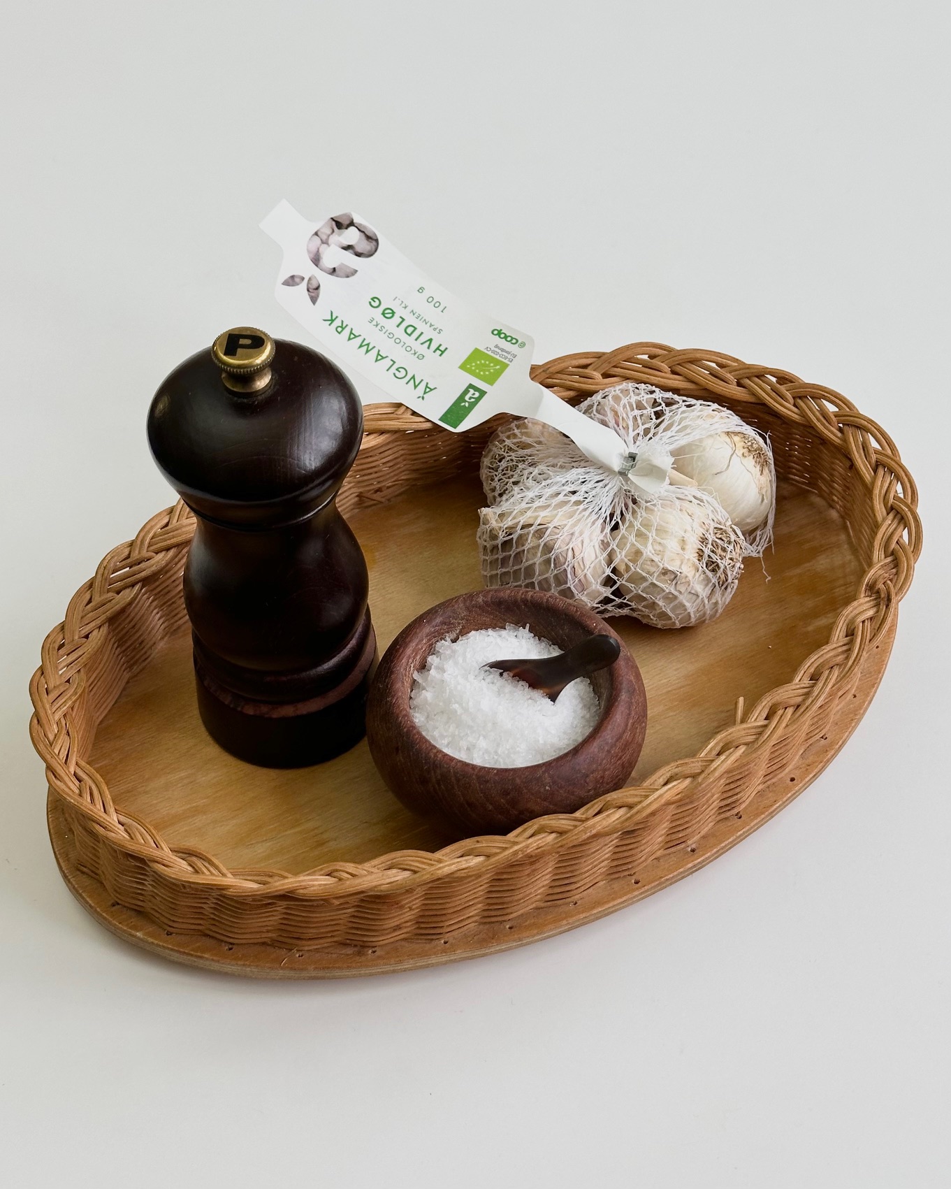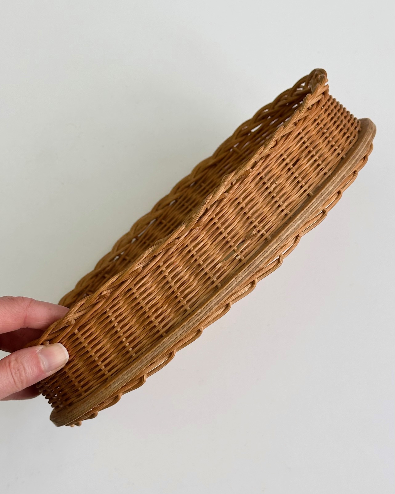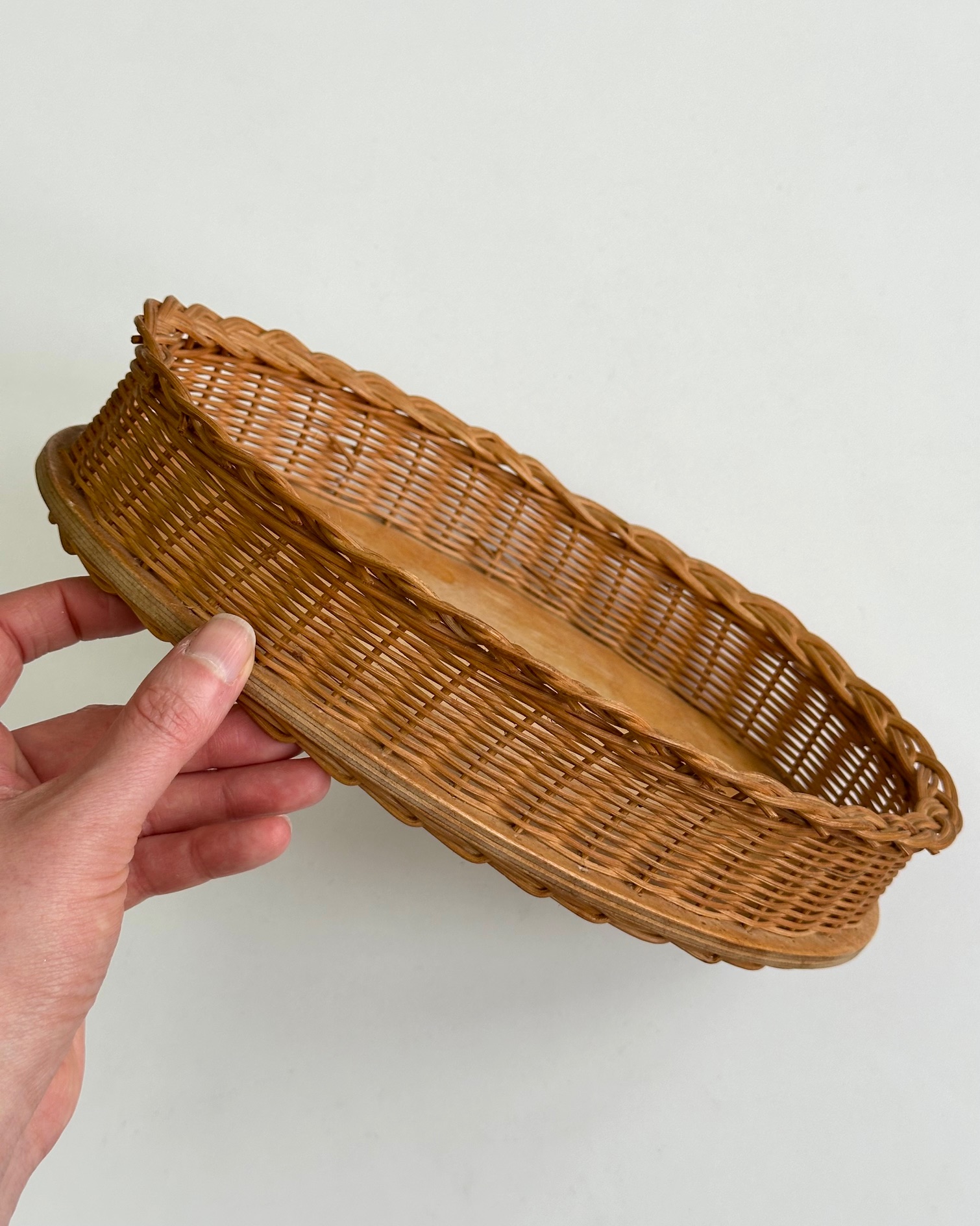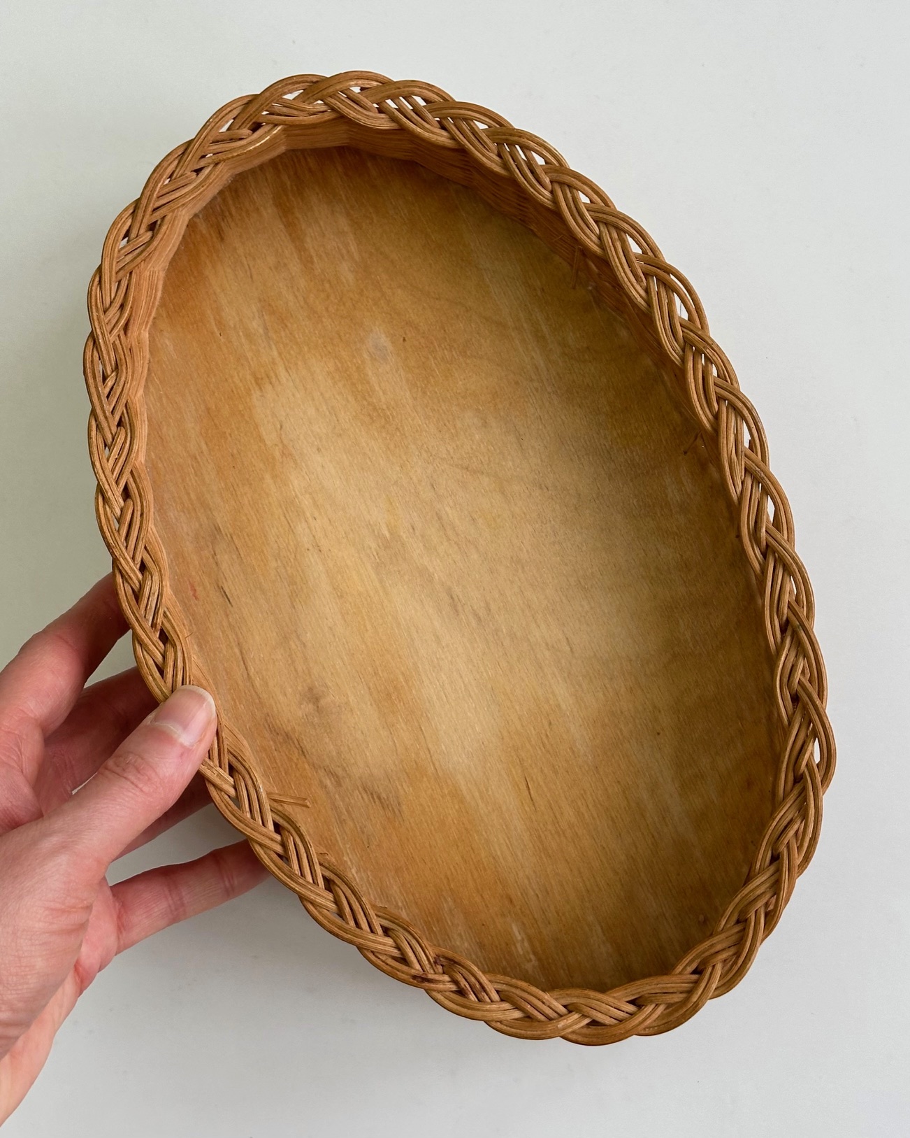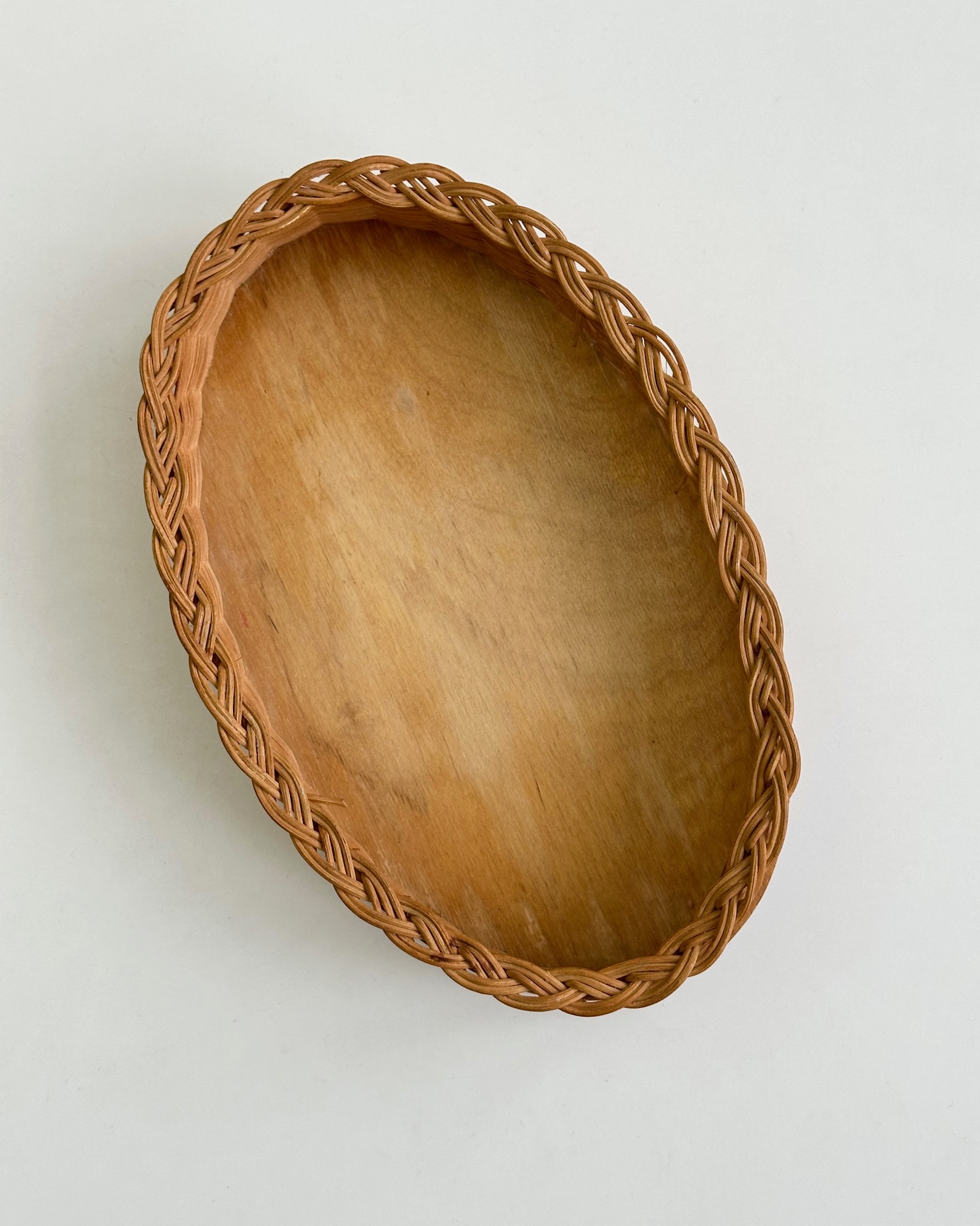 Oval bakke med træbund og flettet kant. God til stillebens eller køkkenet