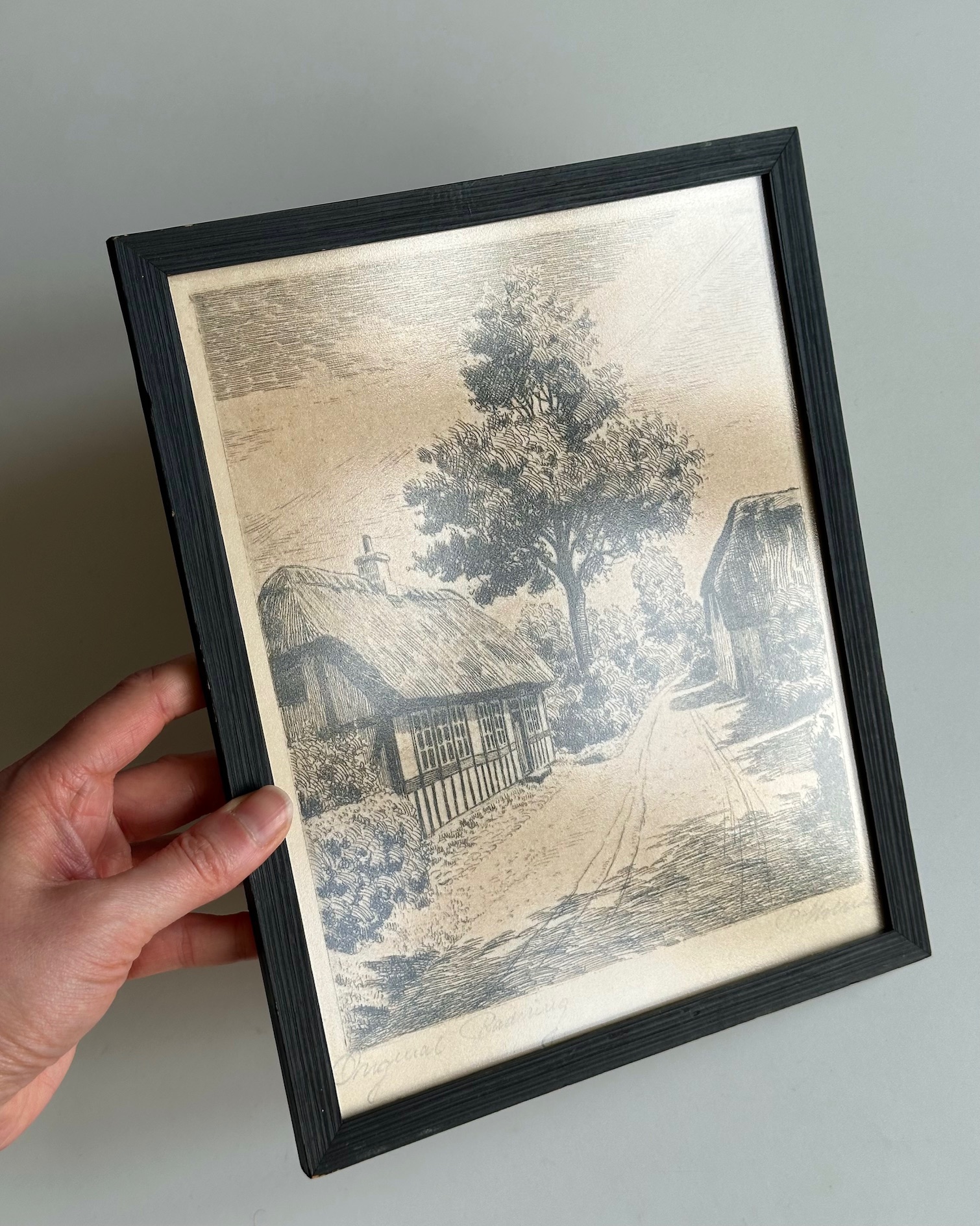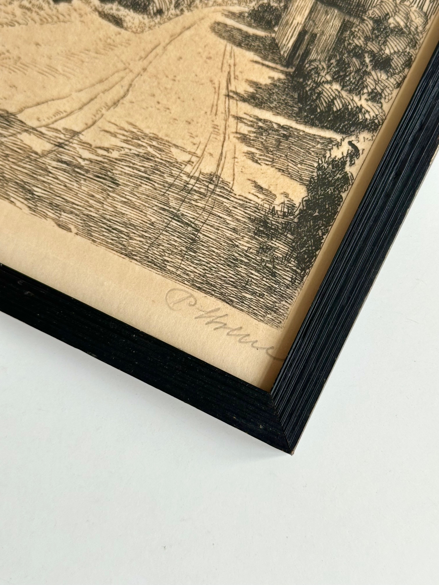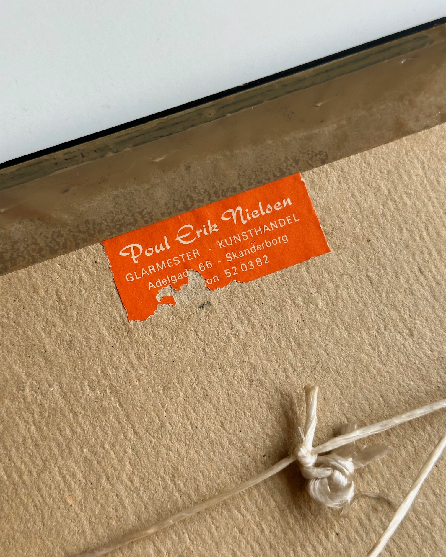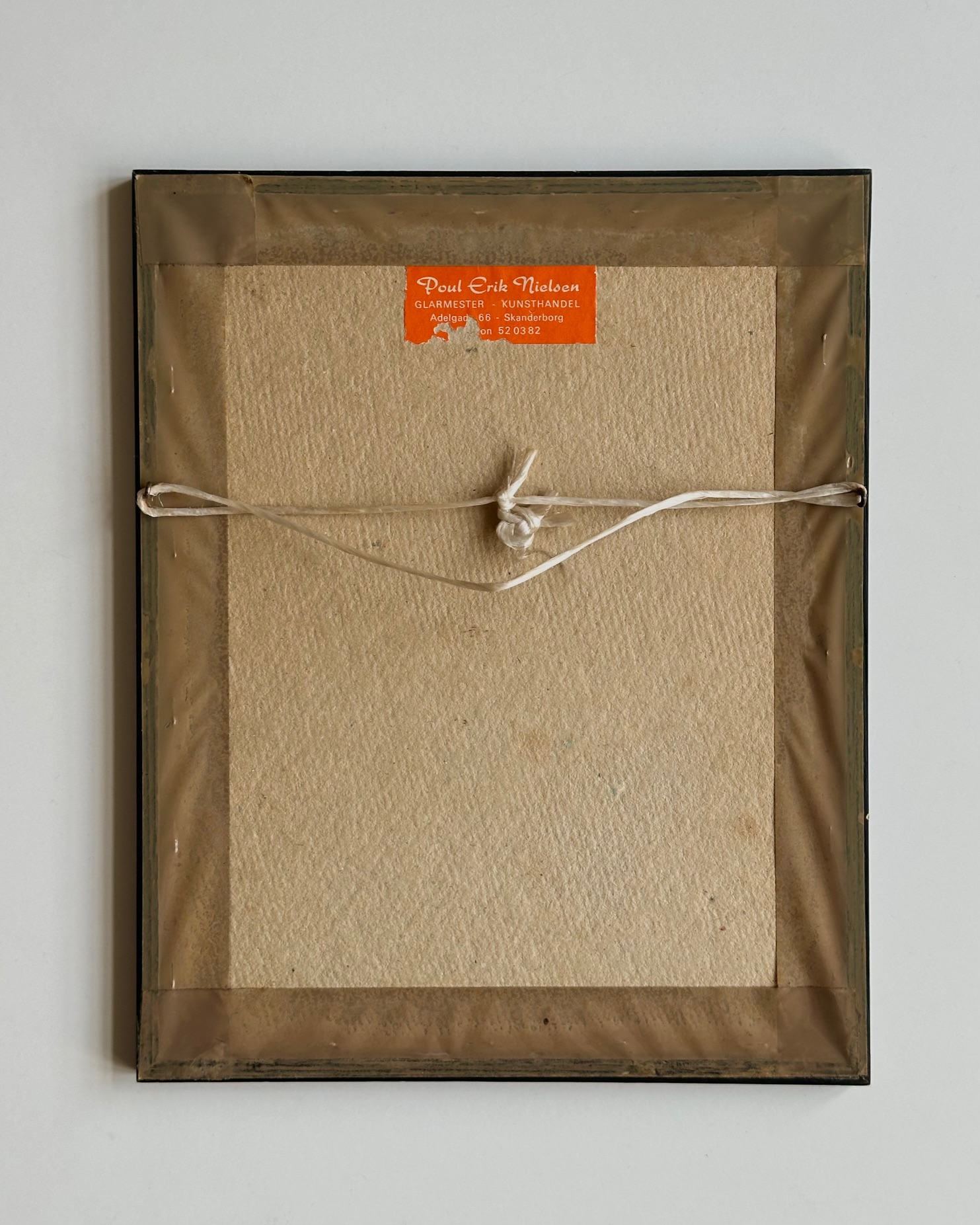 Original radering i original ramme med mat glas. En radering er en grafisk teknik, hvor motivet ridses i en syrebestandig grund på en metalplade (kobber, zink) og derefter ætses med syre, hvilket giver et detaljeret, trykt kunstværk. Dateret ca. 1966-70 ud fra det faktum at glarmesteren havde 6-cifret telefonnummer.