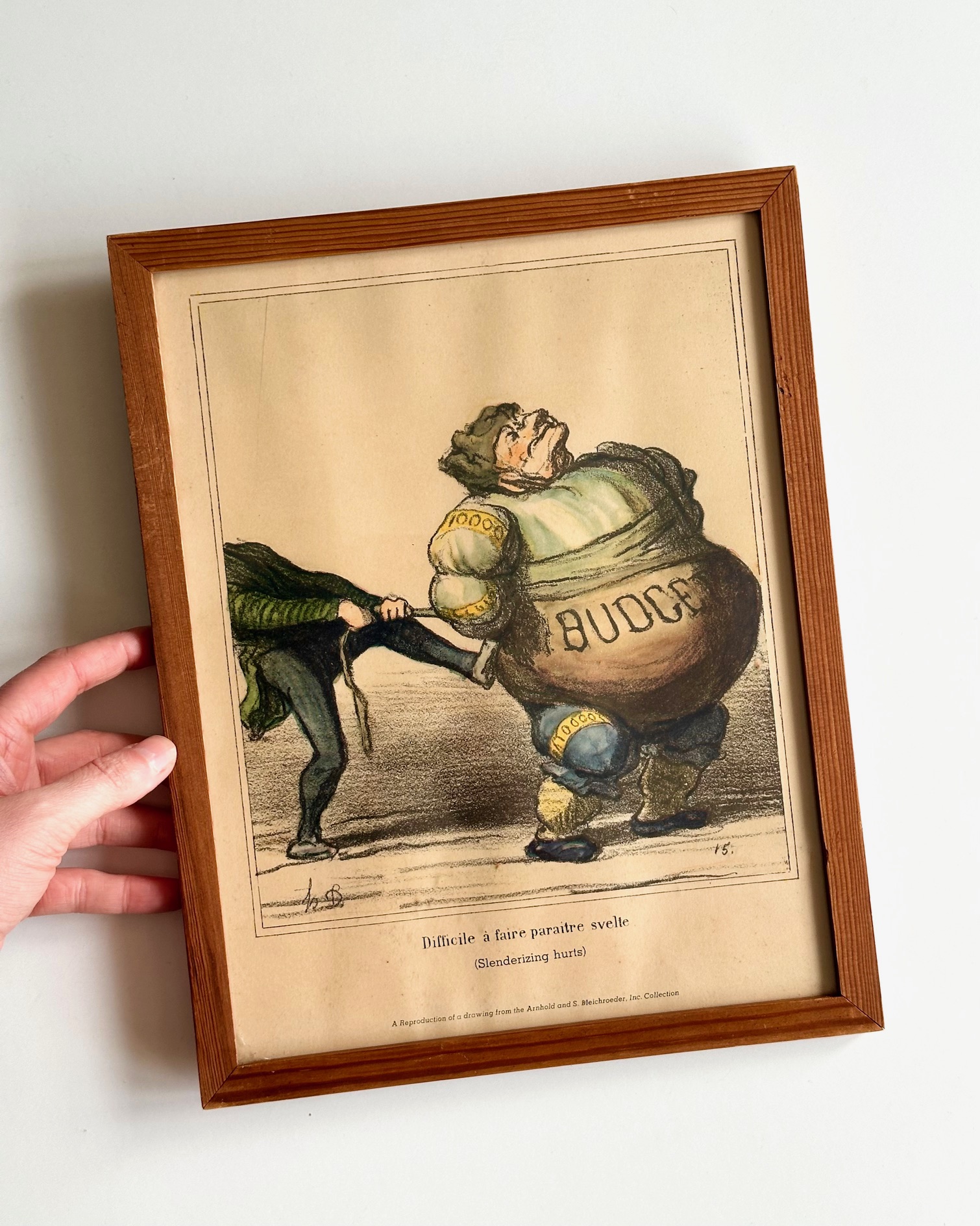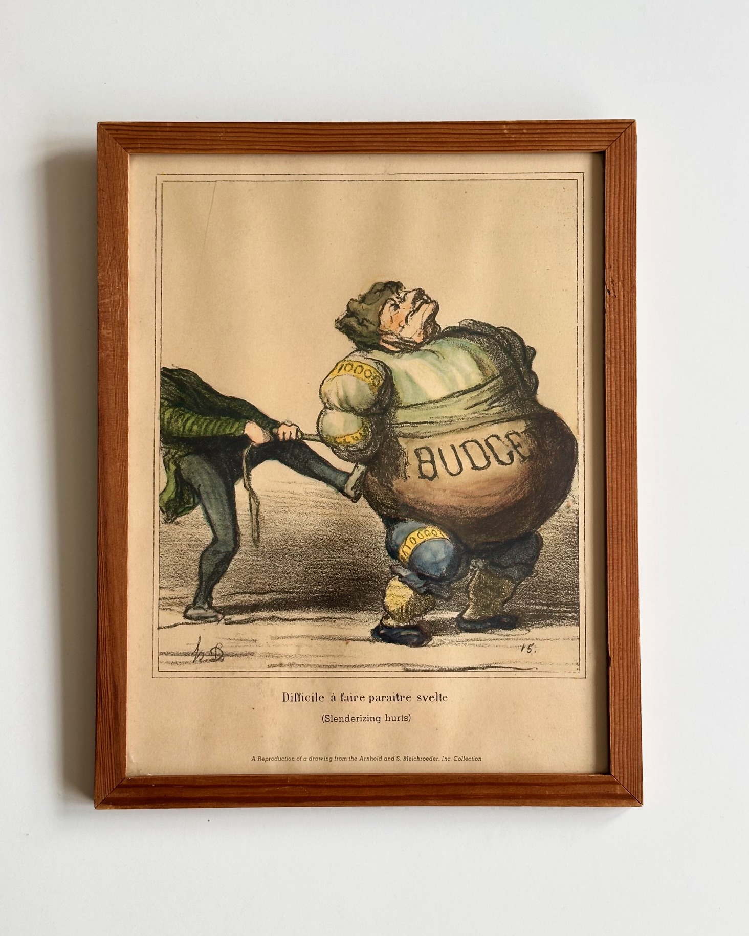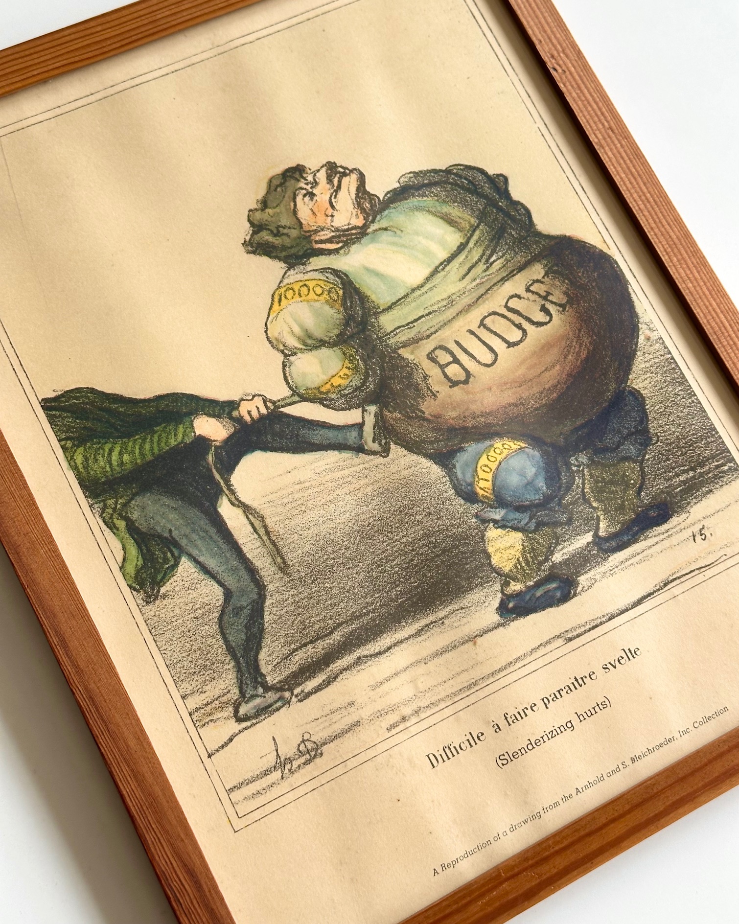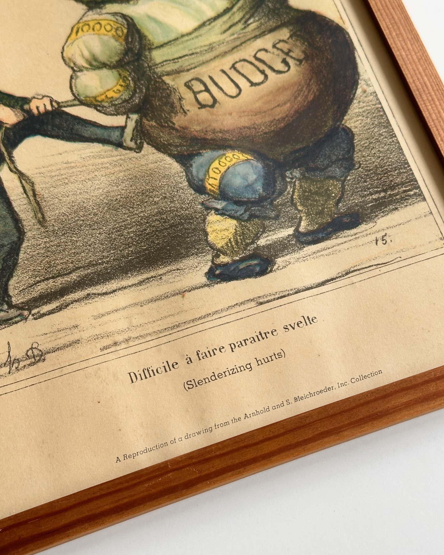 Skøn, gammel satiretegning på fransk. Teksten "difficile á faire paraitre svelte" (det er svært at slanke sig). Tryk efter tegning af Arnhold og S. Bleichroeder.