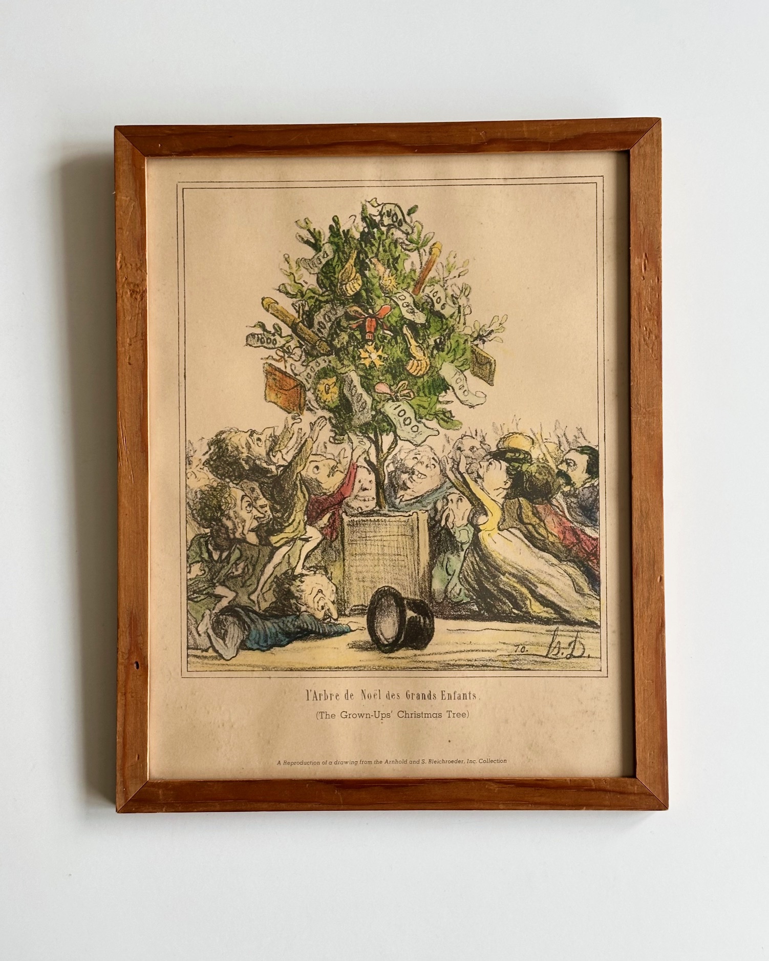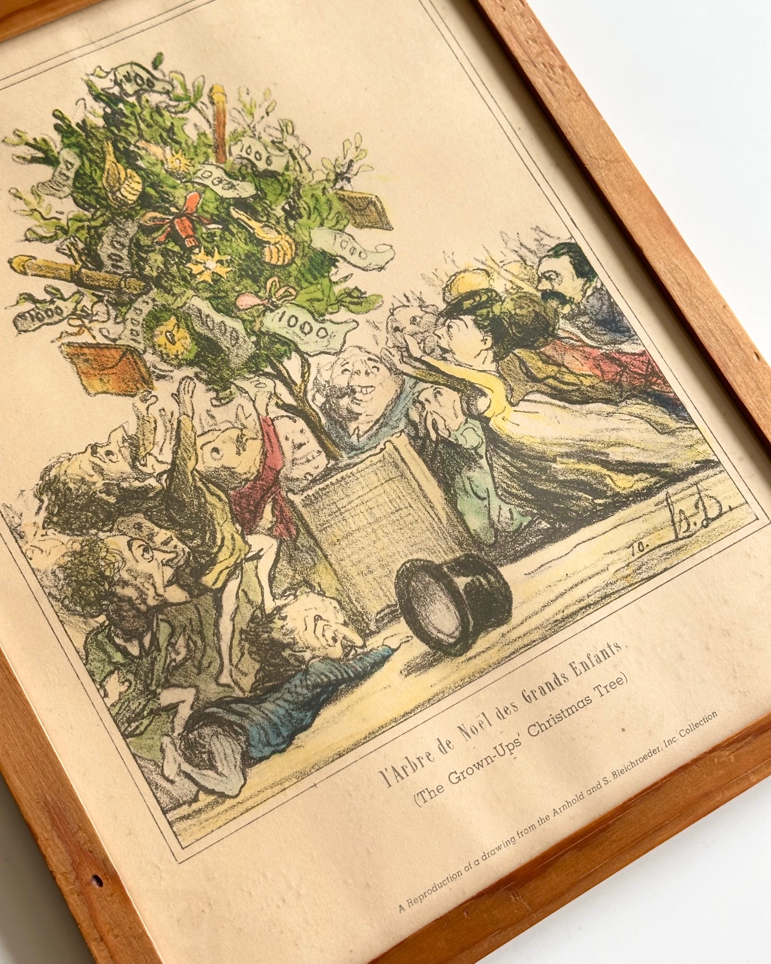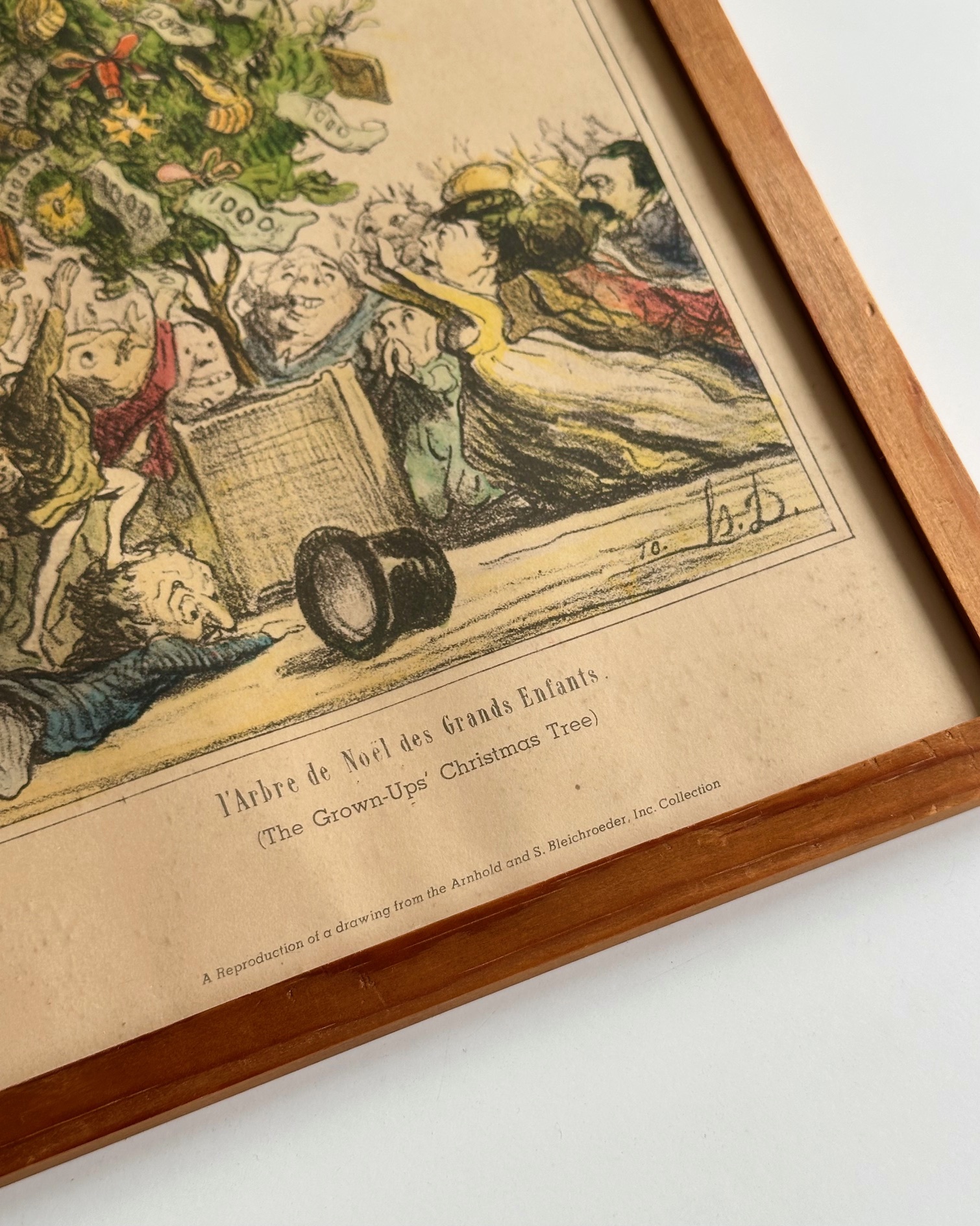 Skøn, gammel satiretegning på fransk. Teksten "l'Arbre de Noël des Grands Enfants" (de store børns juletræ). Tryk efter tegning af Arnhold og S. Bleichroeder.