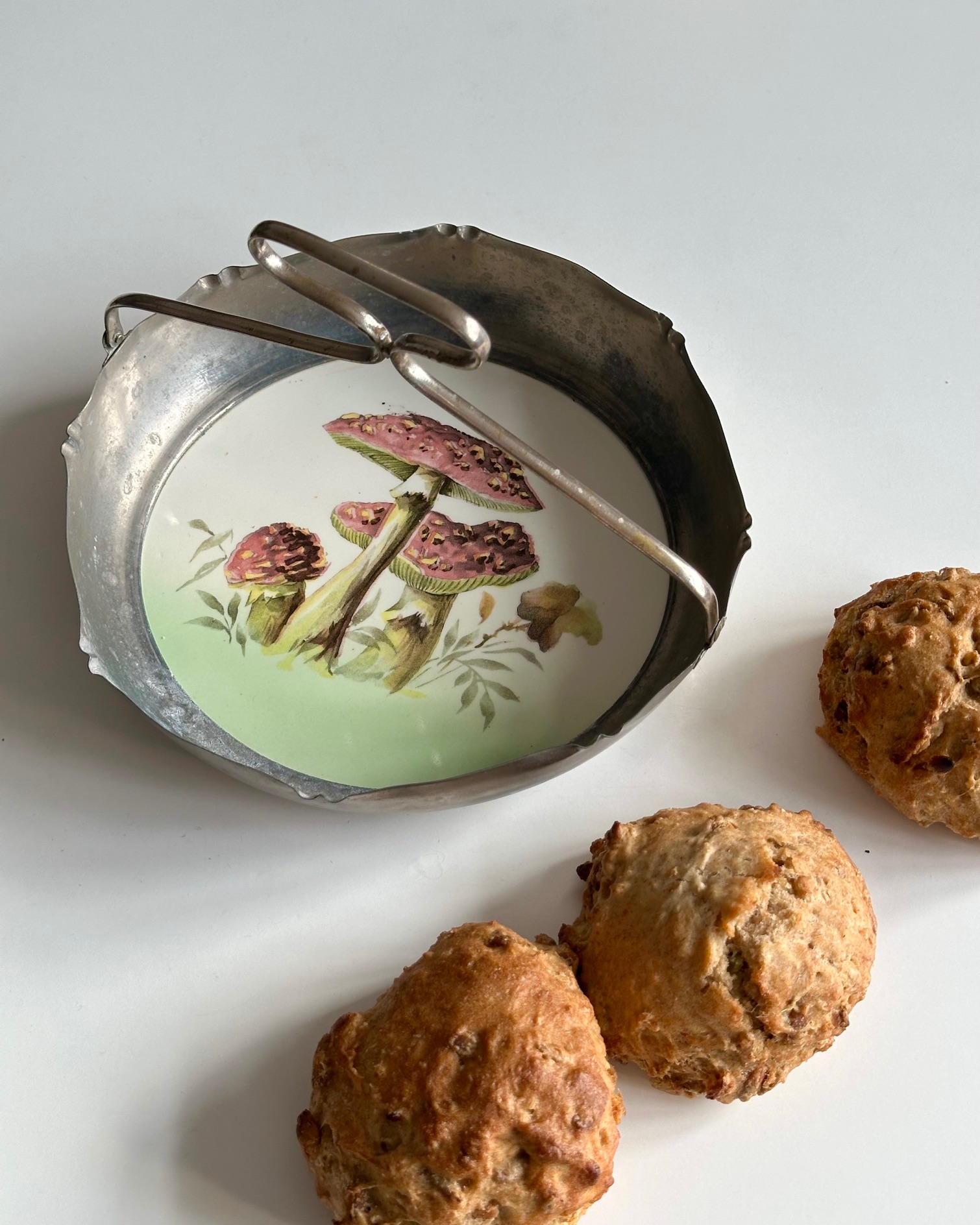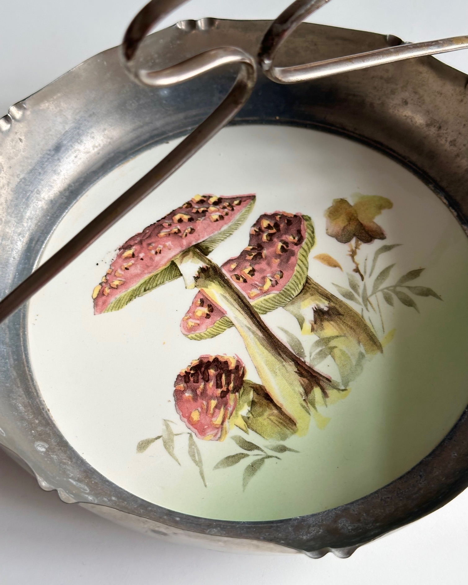 Metalskål i jugendstil med bund af majolika/fajance og hank