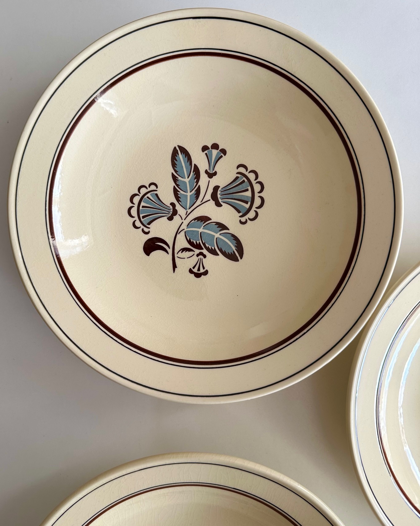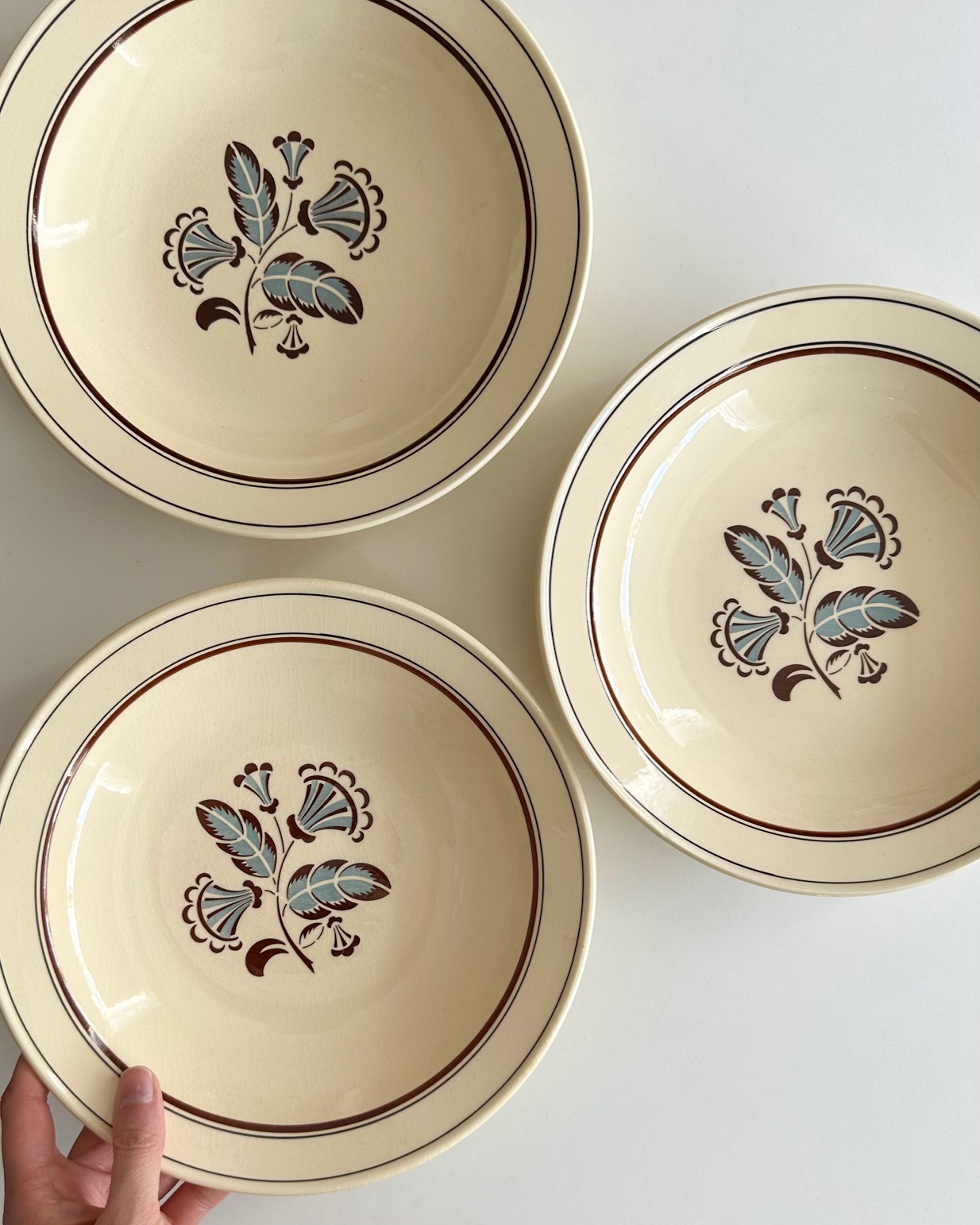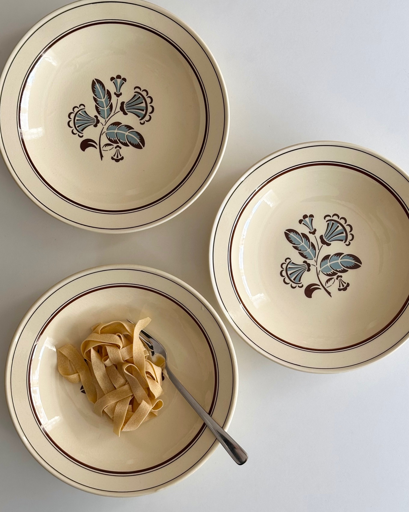 3 gamle fajancetallerkner med smukke motiver og flødefarvet glasur, perfekte til pasta.