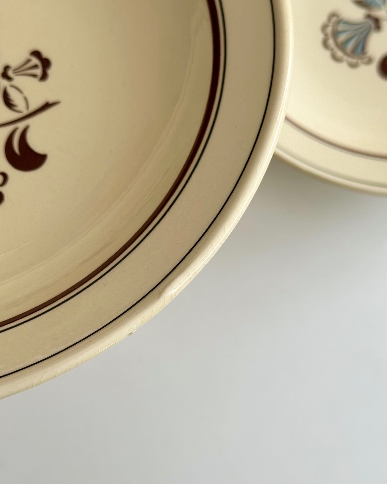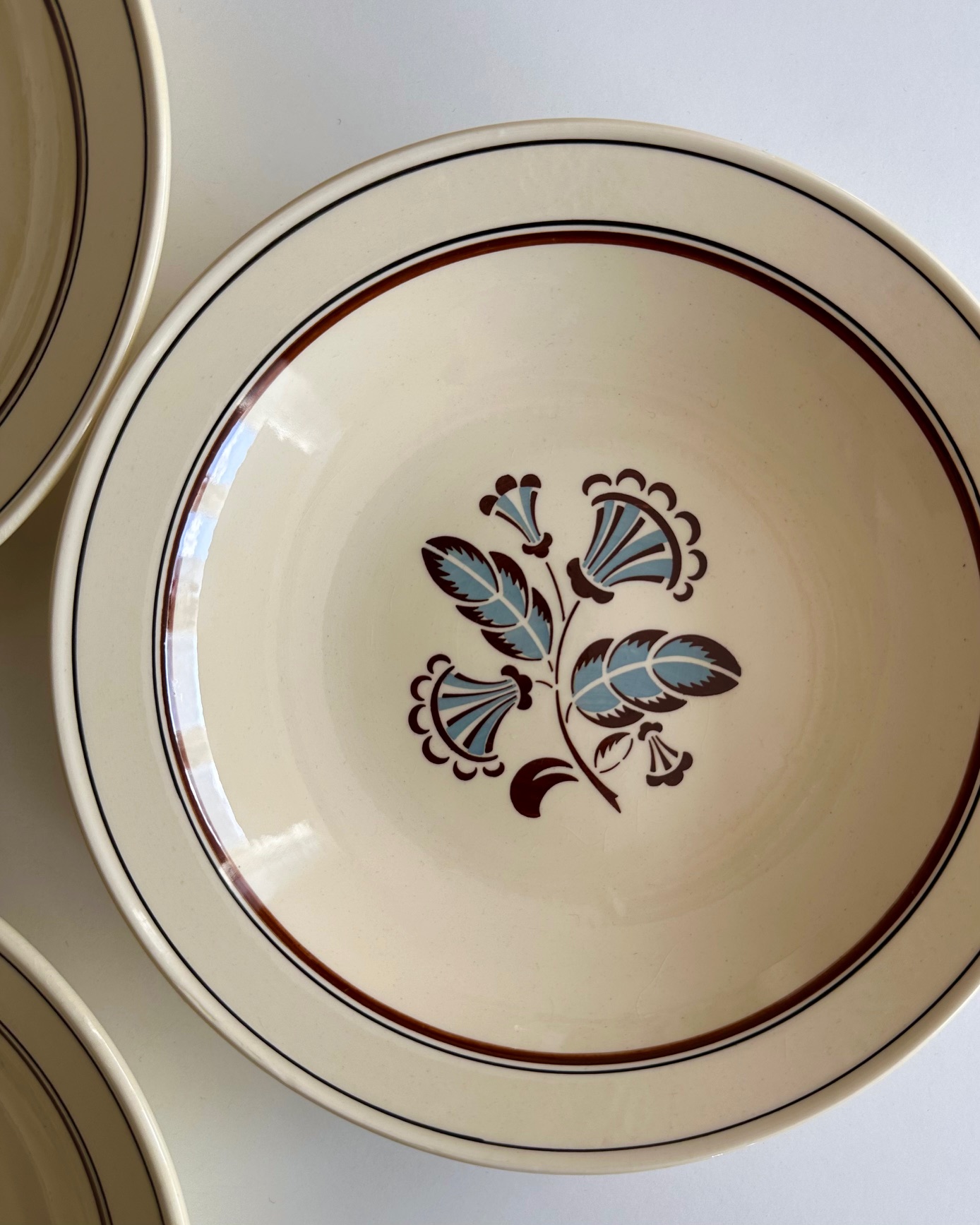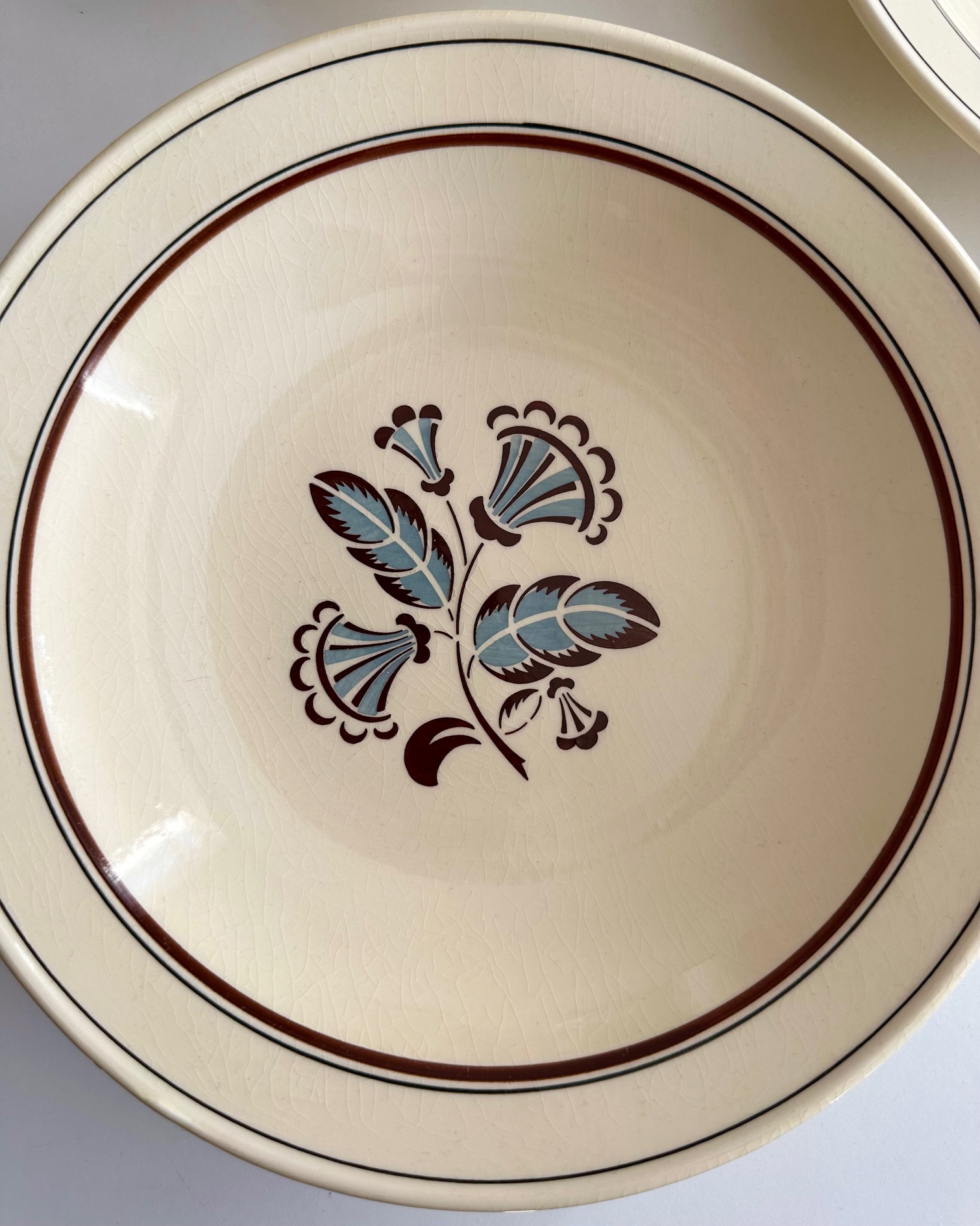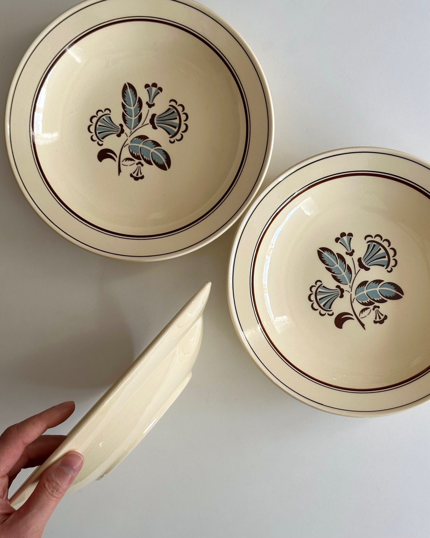3 gamle fajancetallerkner med smukke motiver og flødefarvet glasur, perfekte til pasta.