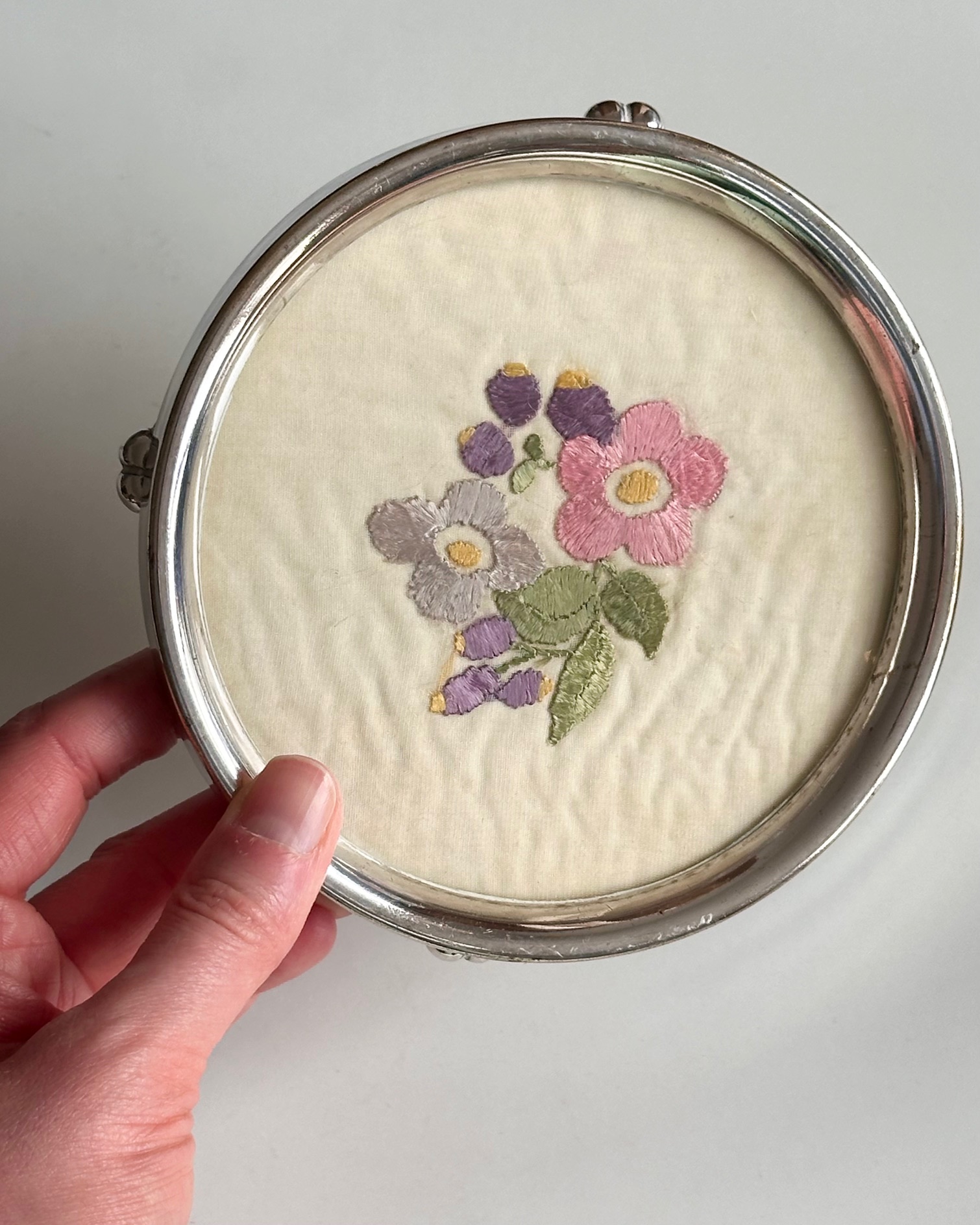Antik bordskåner/flaskebakke med broderi. Indrammet med glas og pletsølv. Genial til vinflasken.