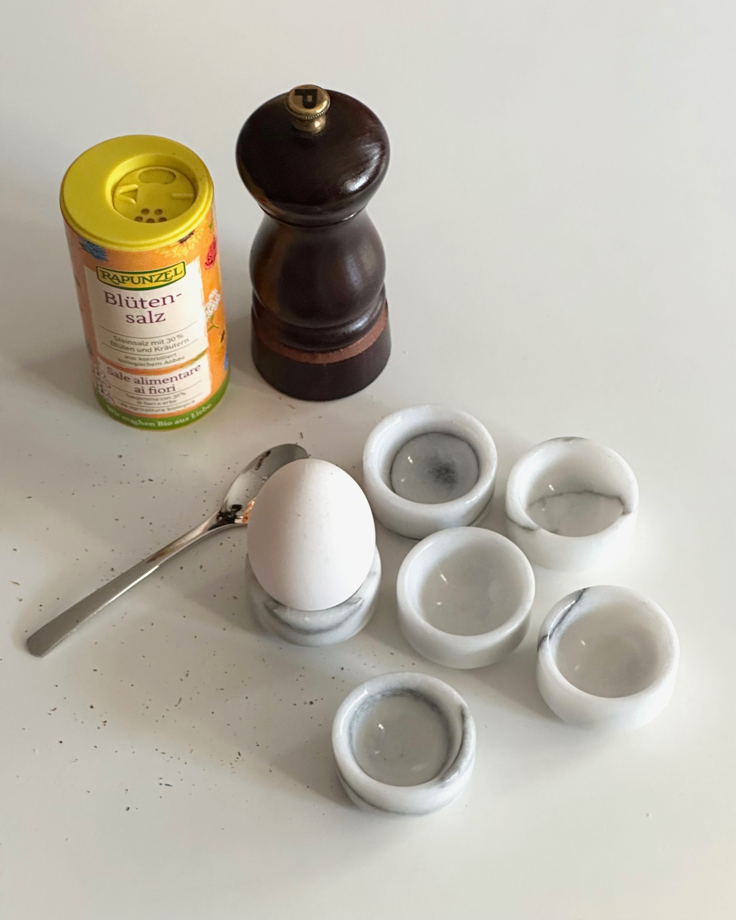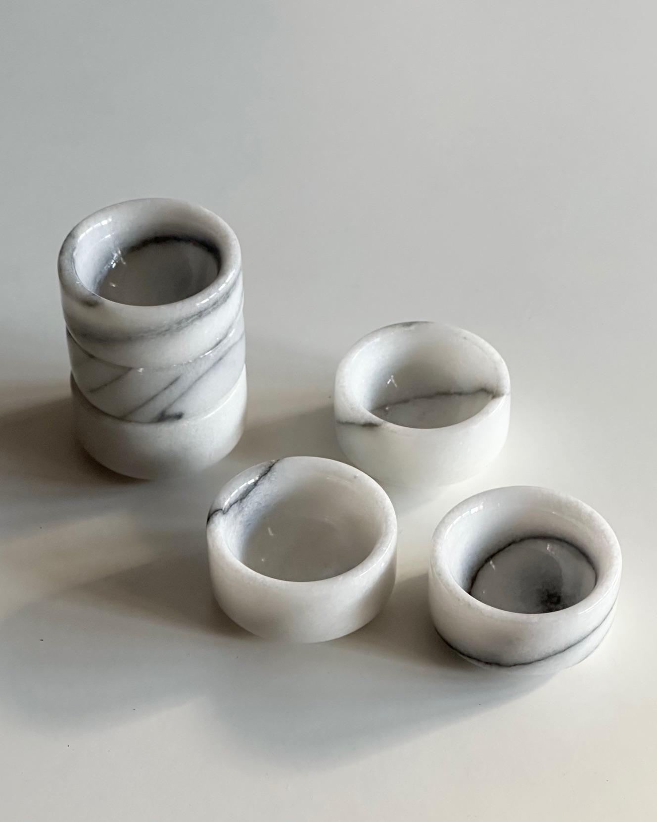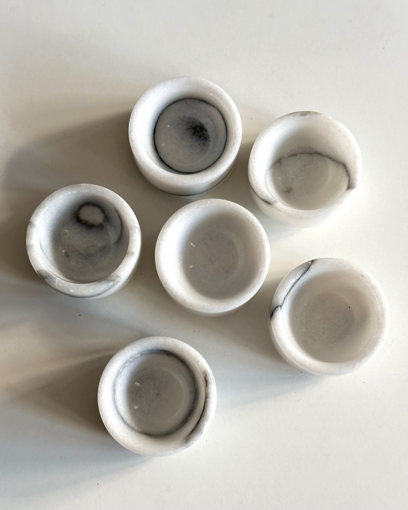 6 fine, flade æggebægre af hvid marmor