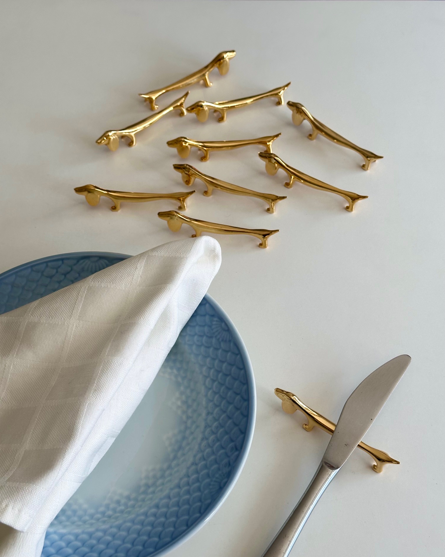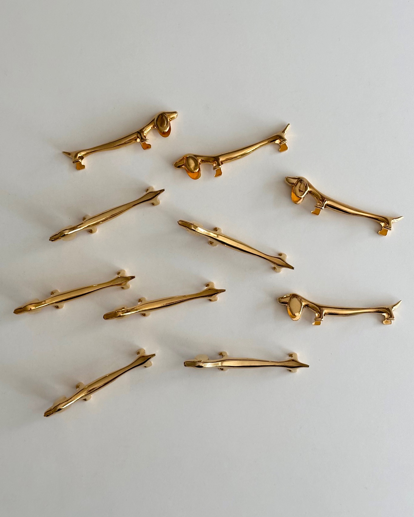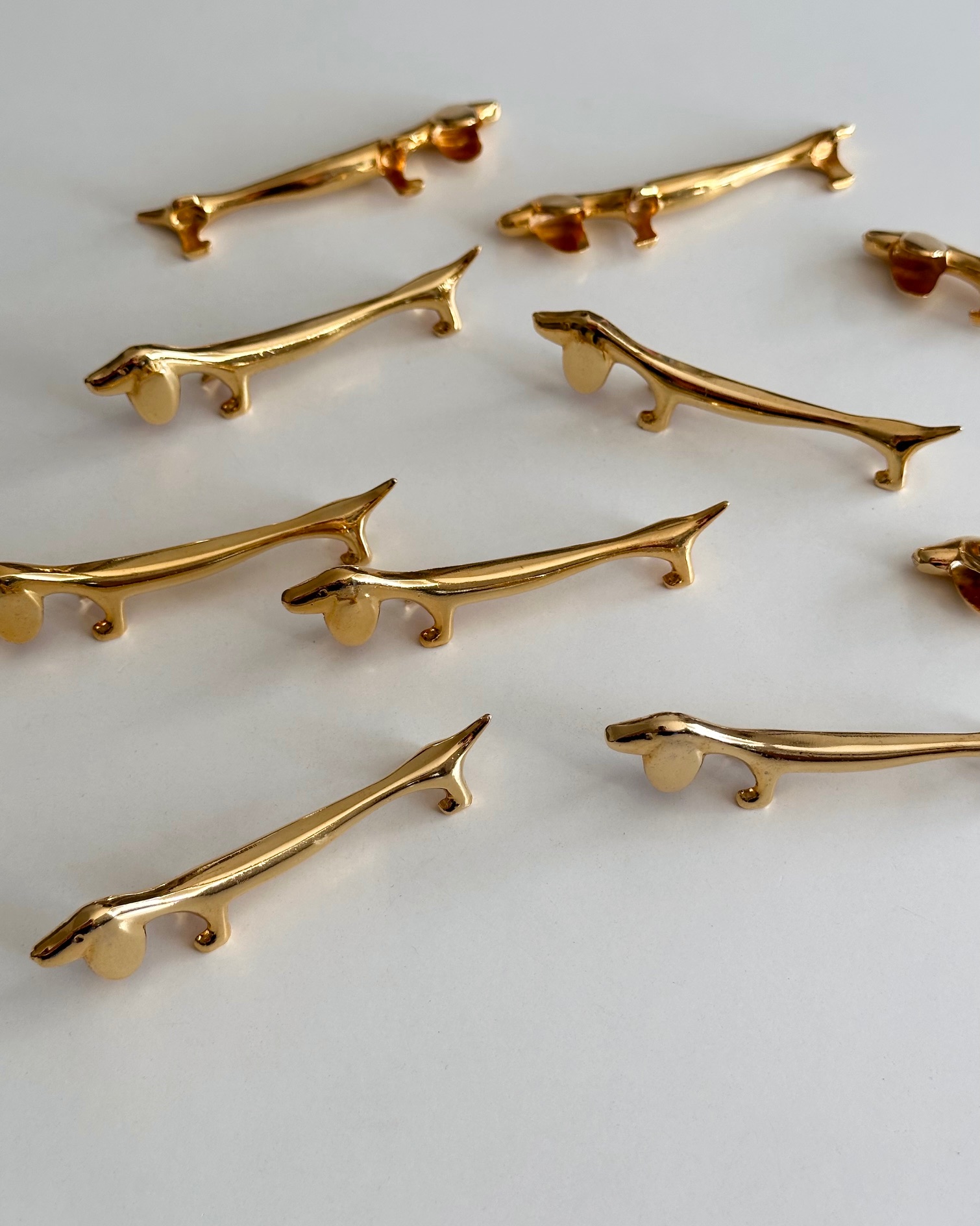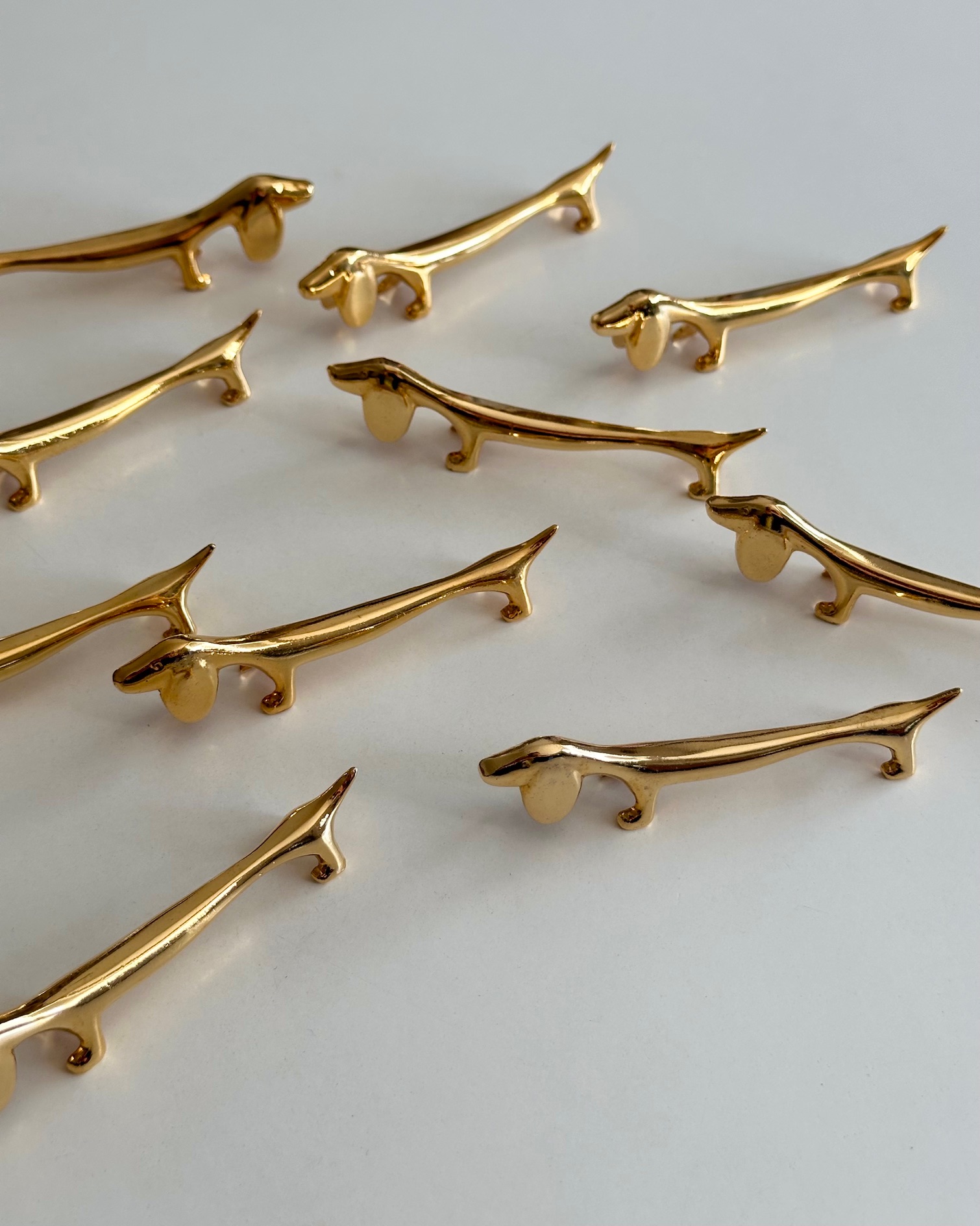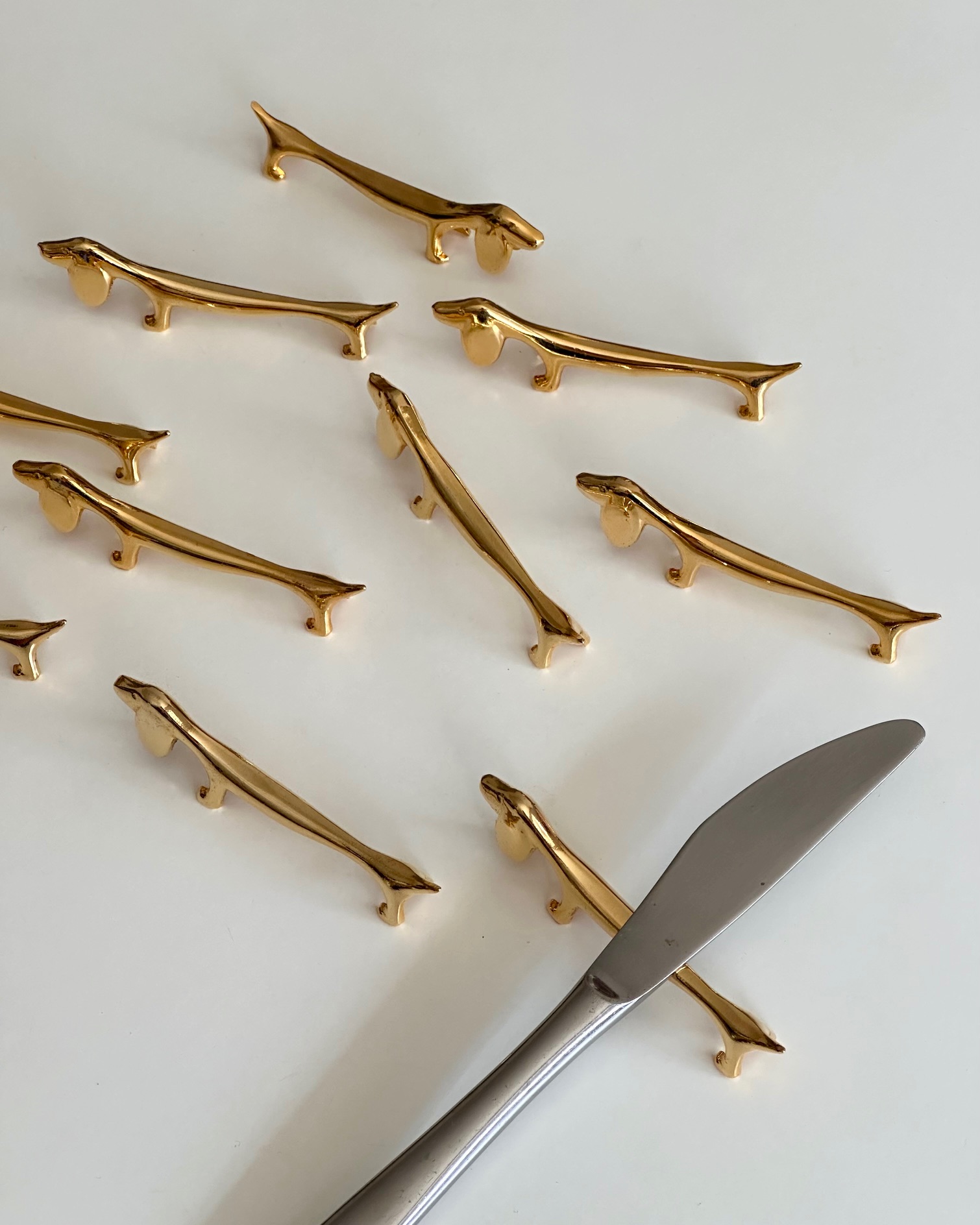 10 smukke, sjove knivstole i form af gravhunde, forgyldte.