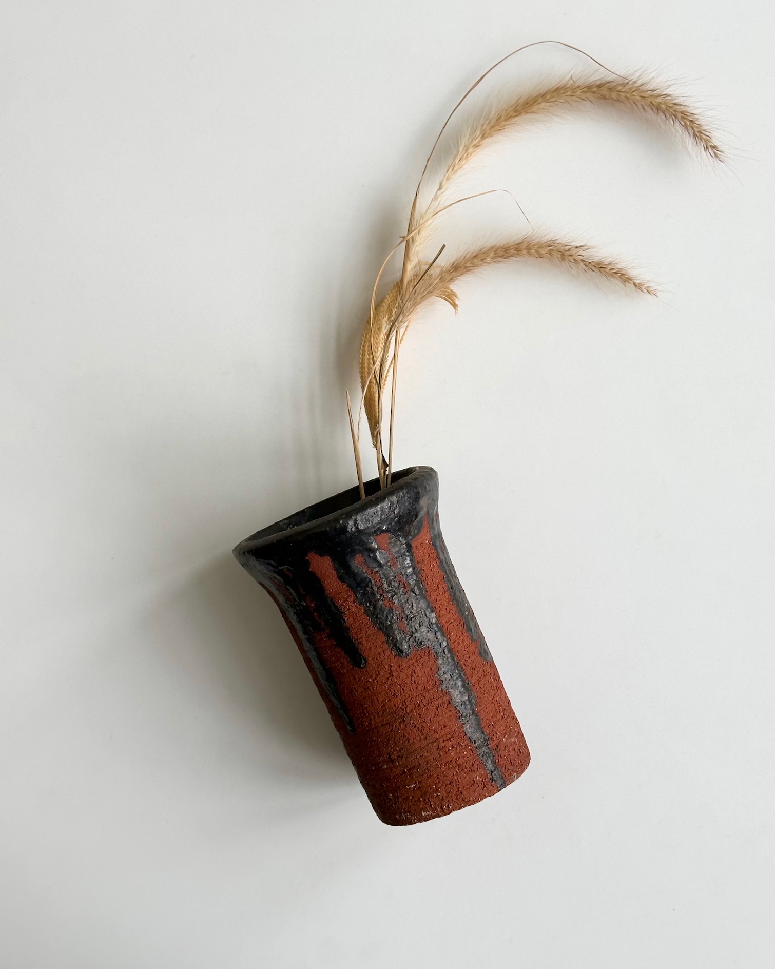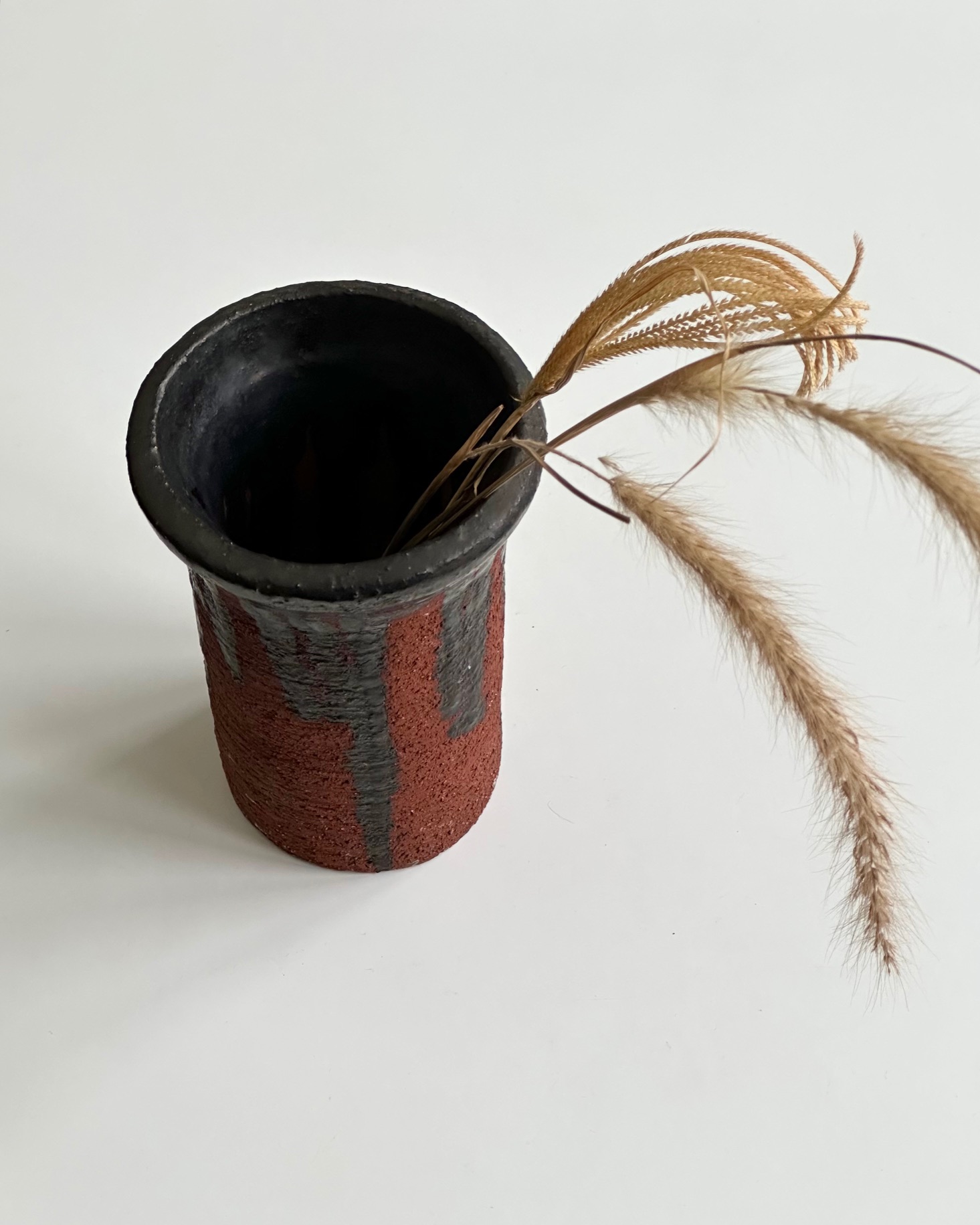 Håndlavet keramikvase, delvist uglaseret og med iriserende, sort glasur