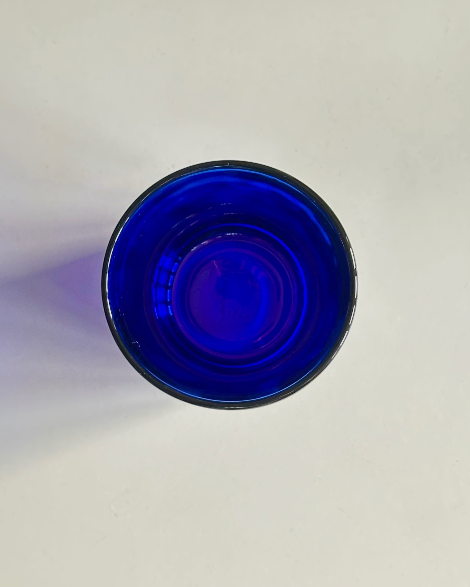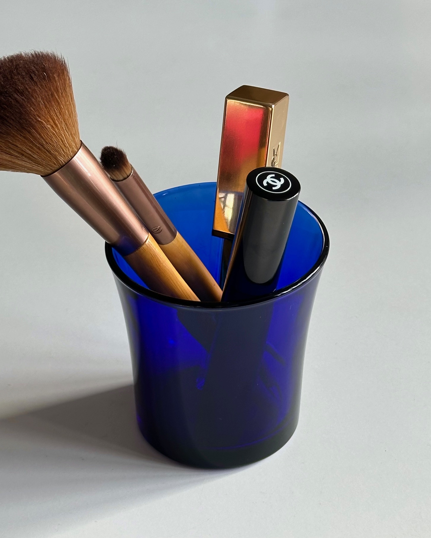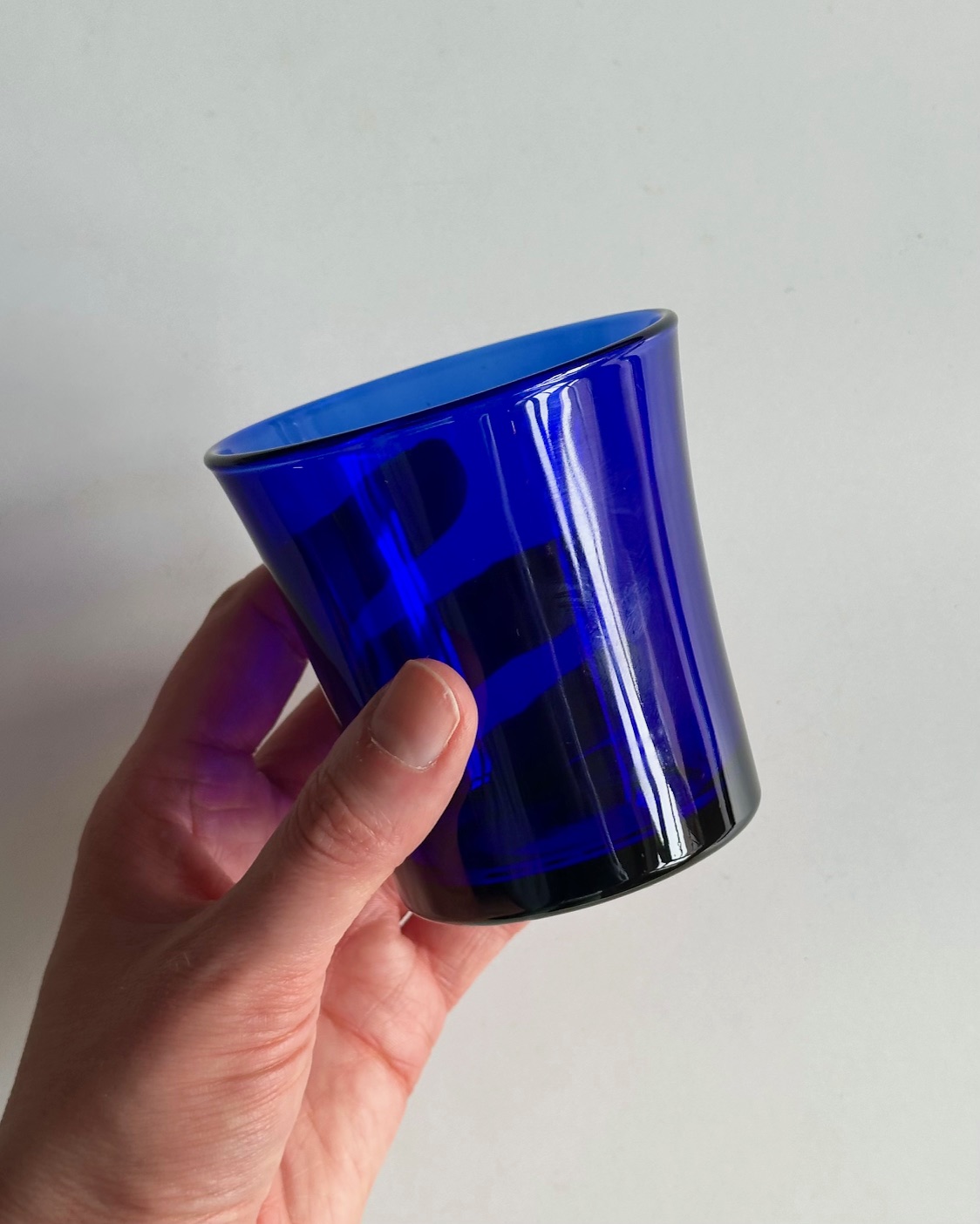 Et enkelt koboltblåt glas fra franske Duralex. Fint til fx makeuppensler, kuglepenne eller som en lille vase.