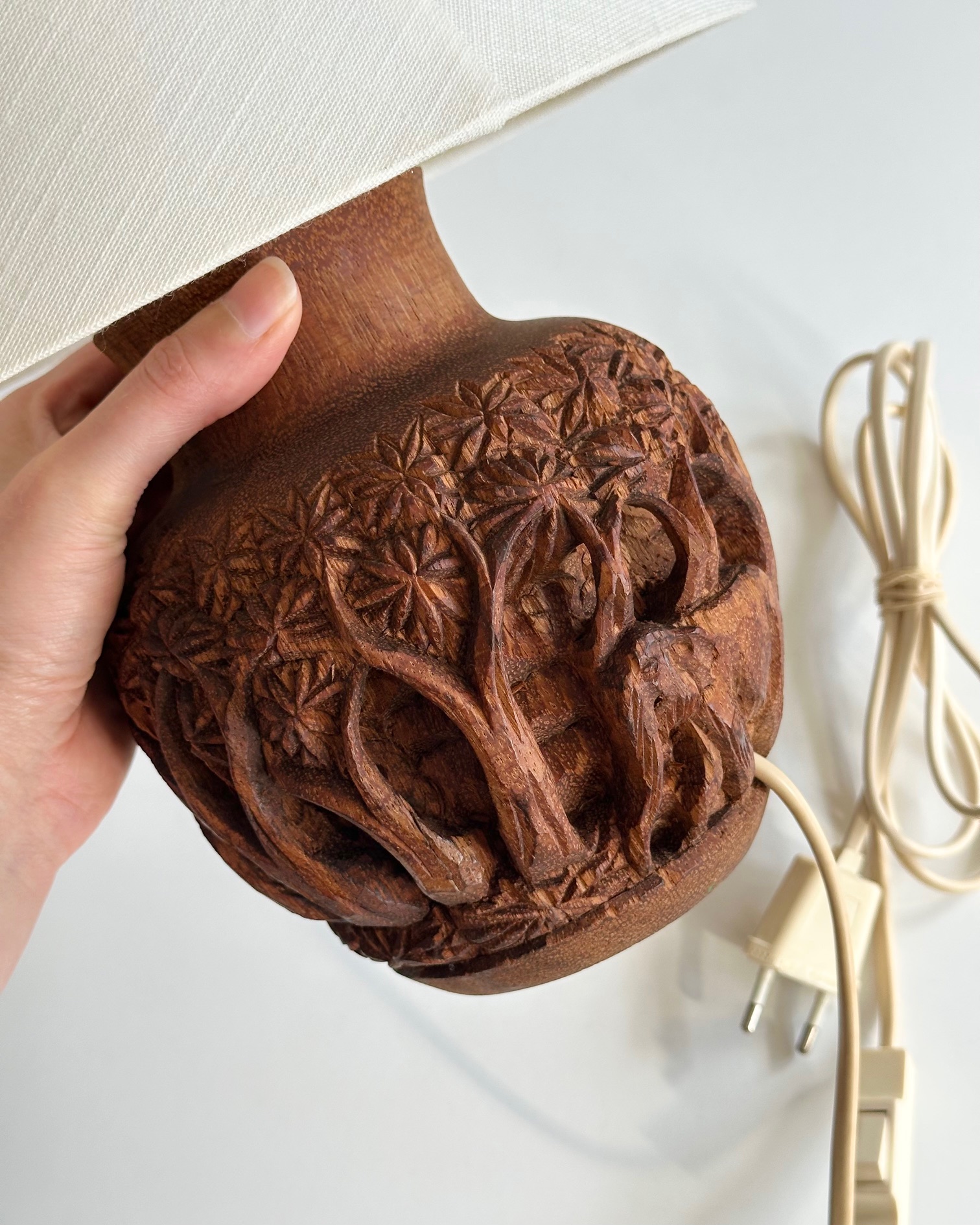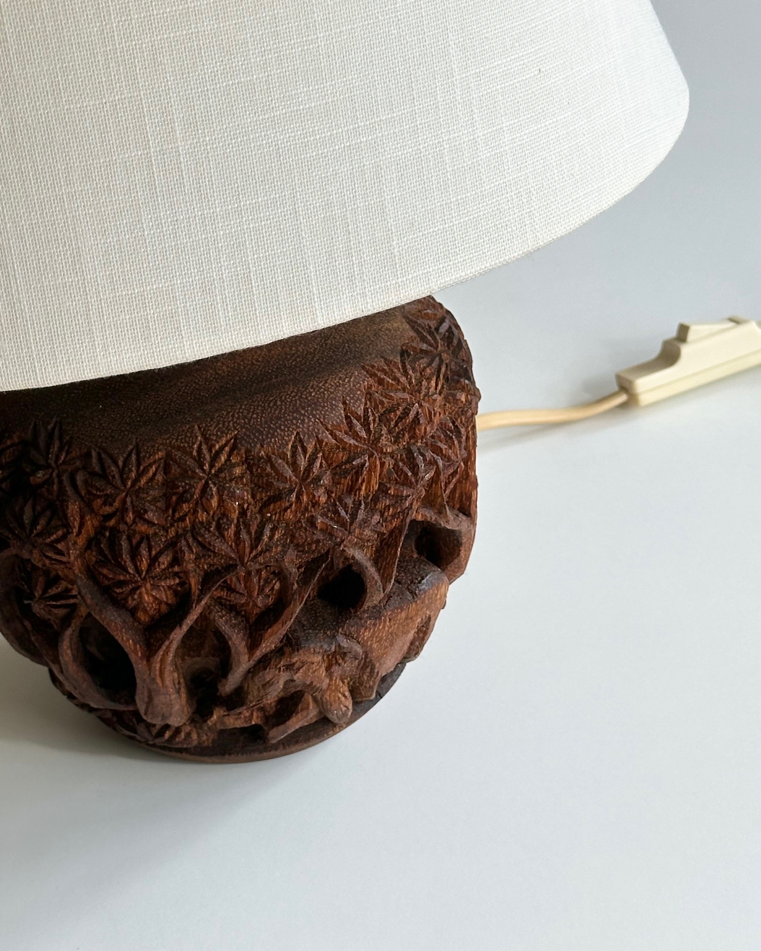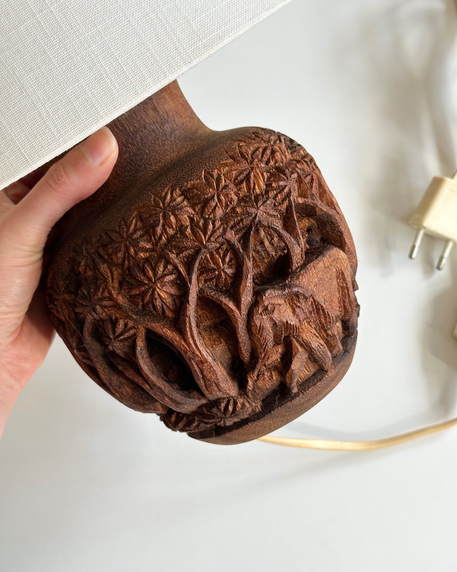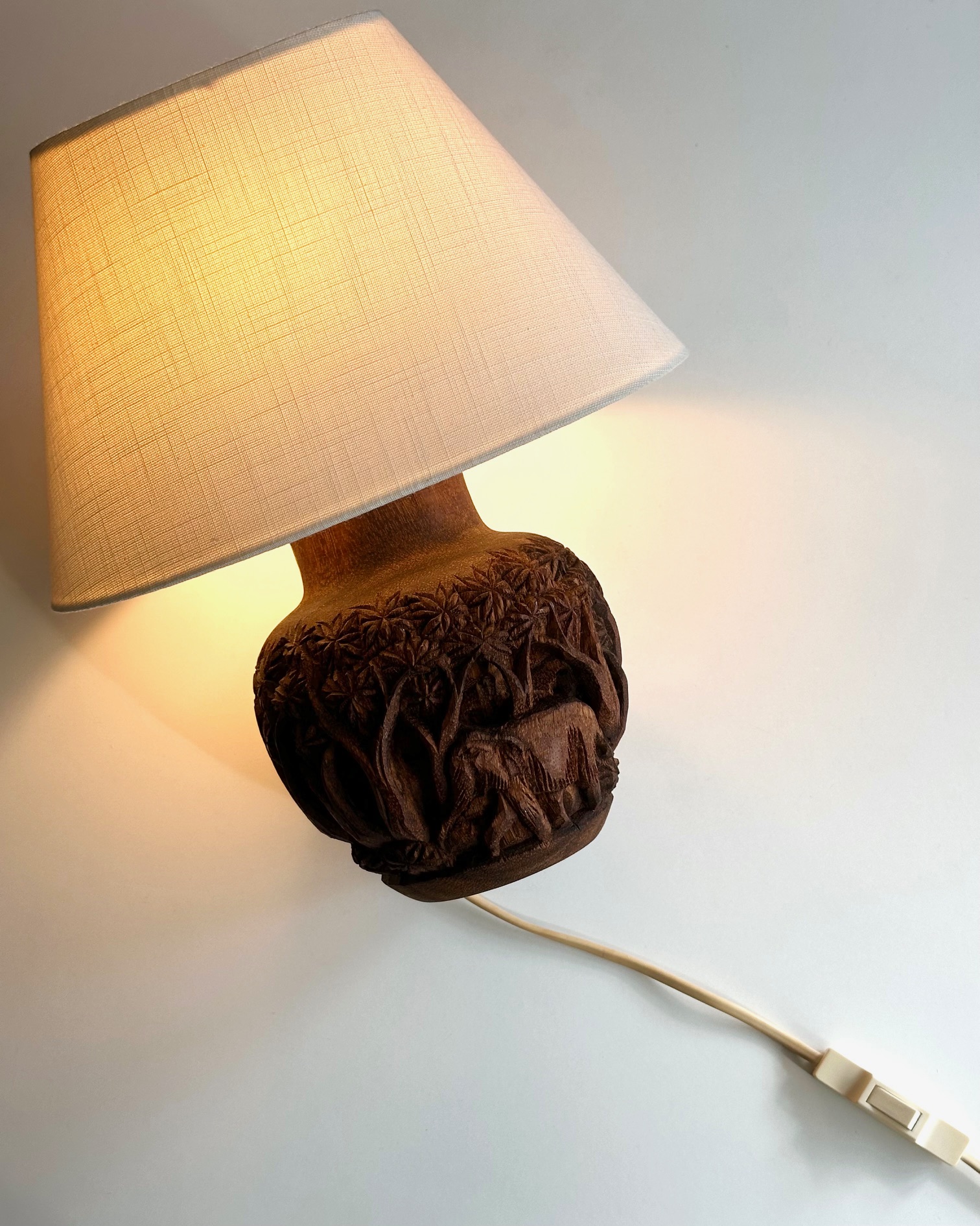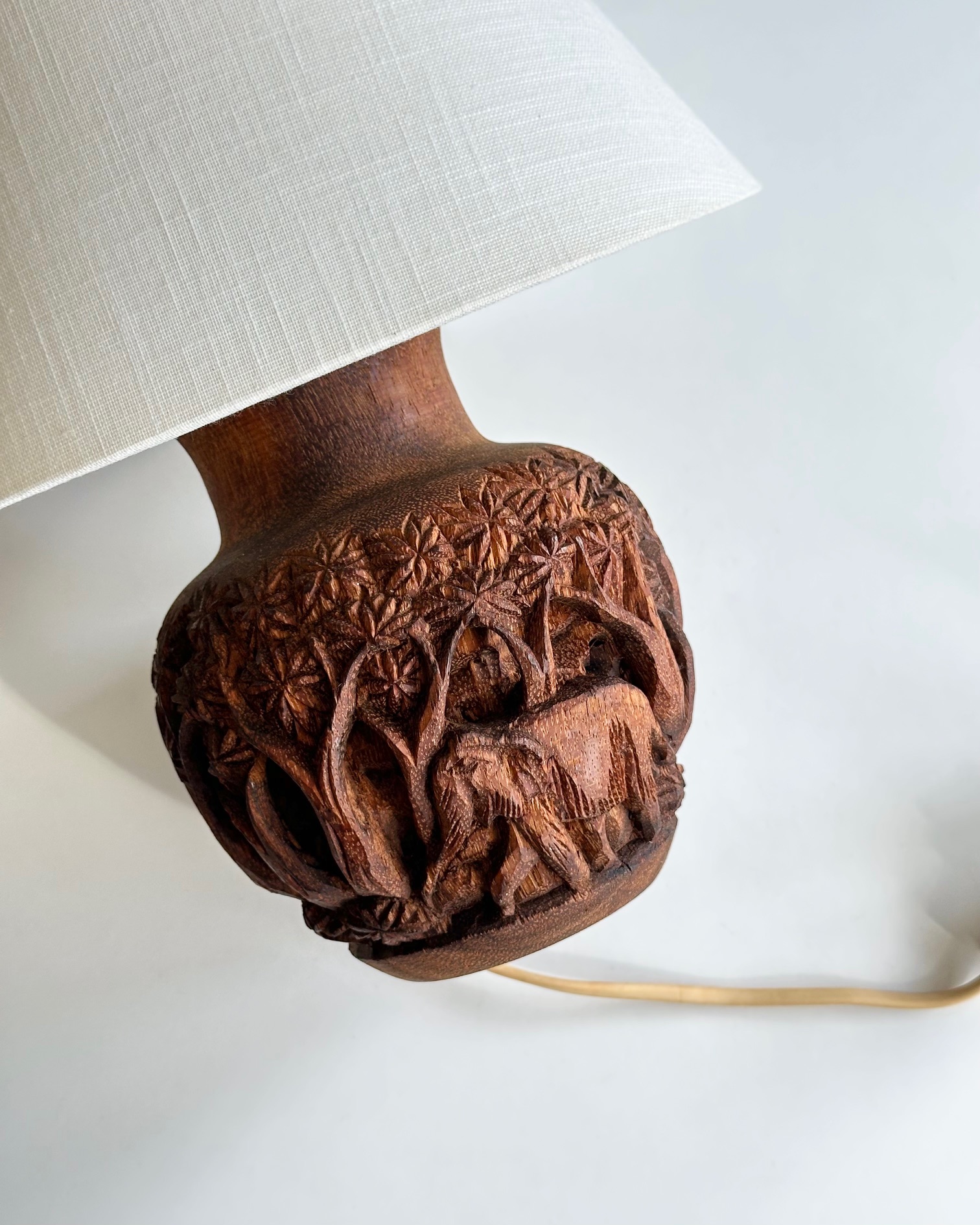 Bordlampe, håndskåret af træ med elefantmotiv. Oval lampeskærm med lyst tekstil. Nyolieret.