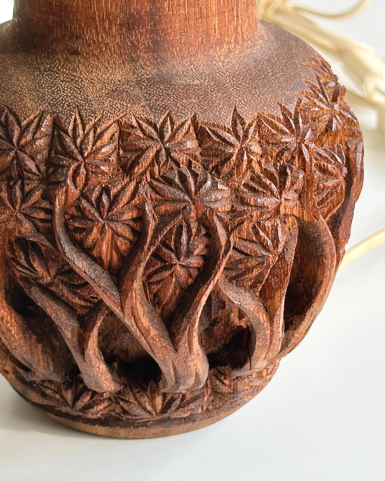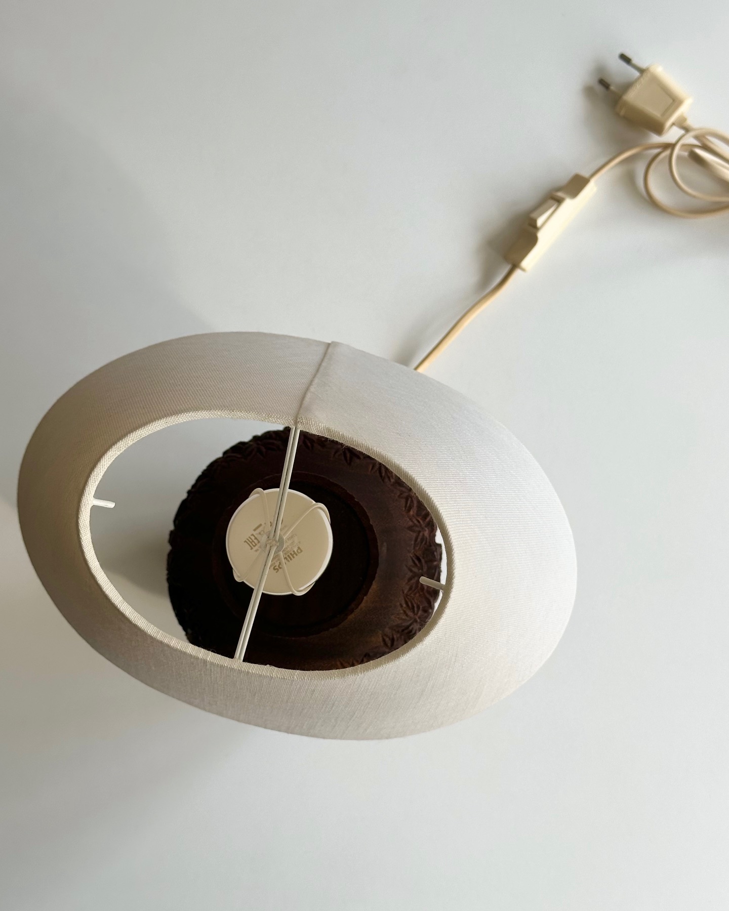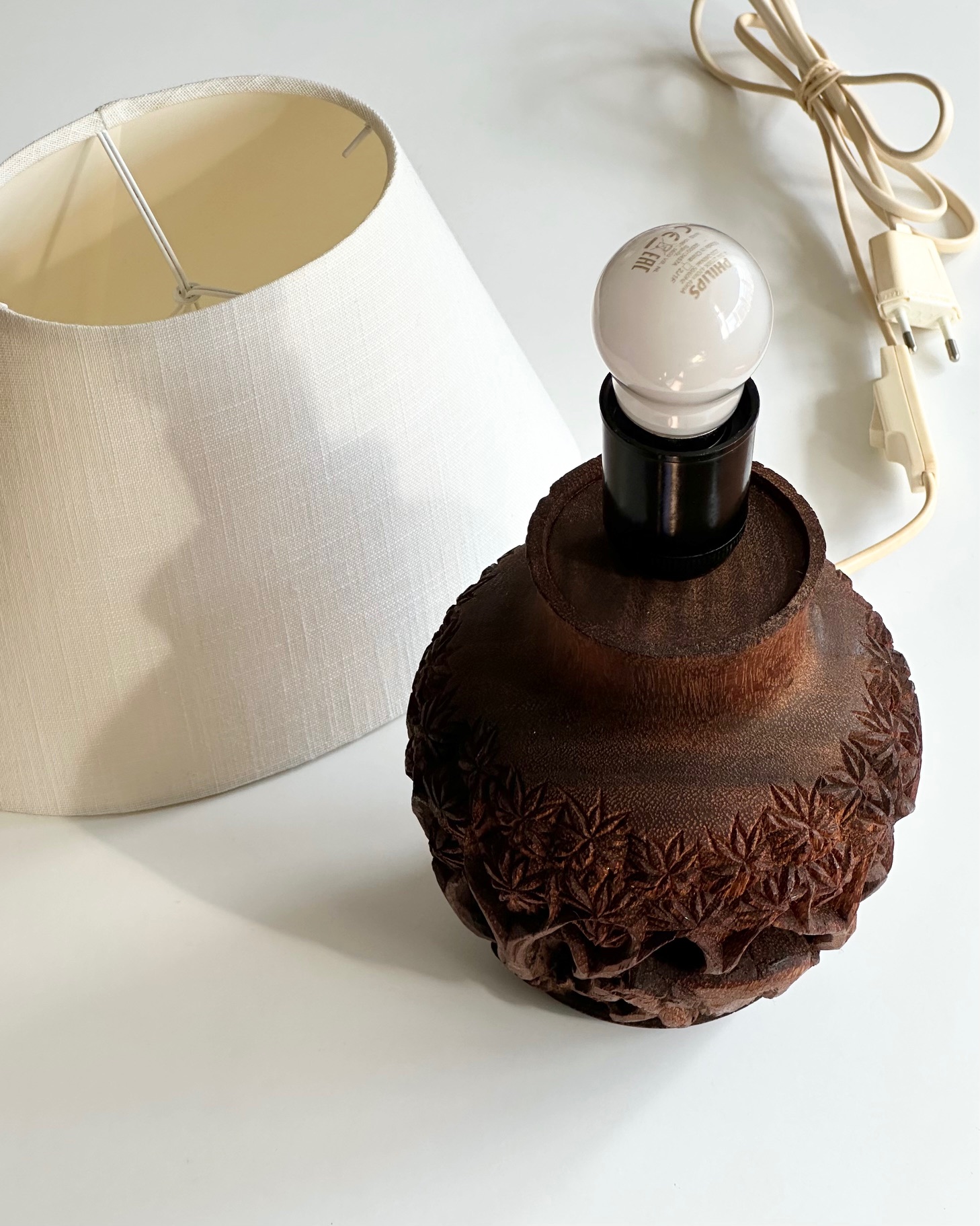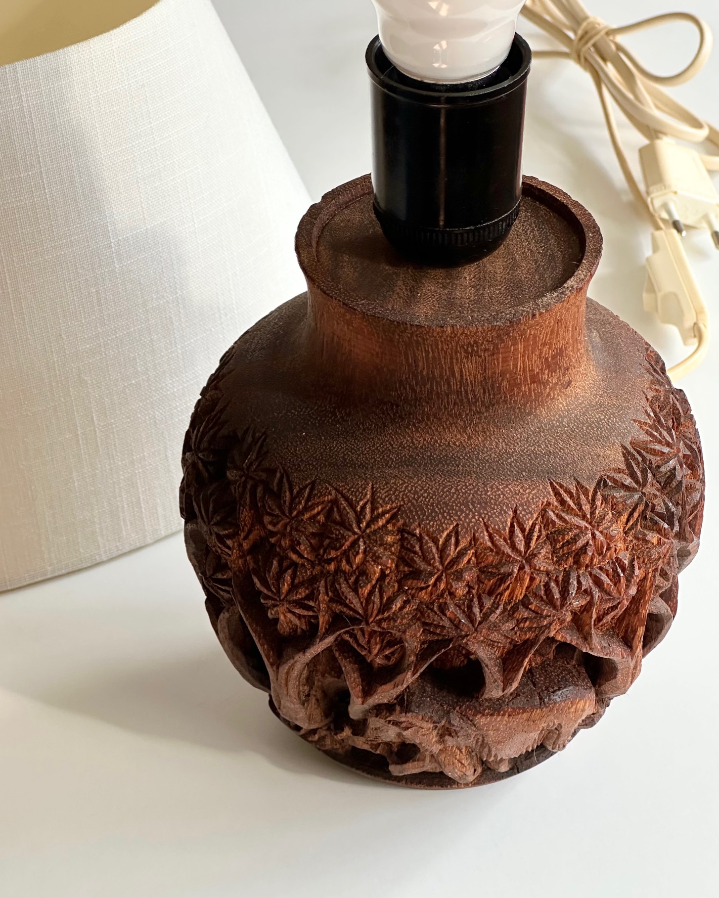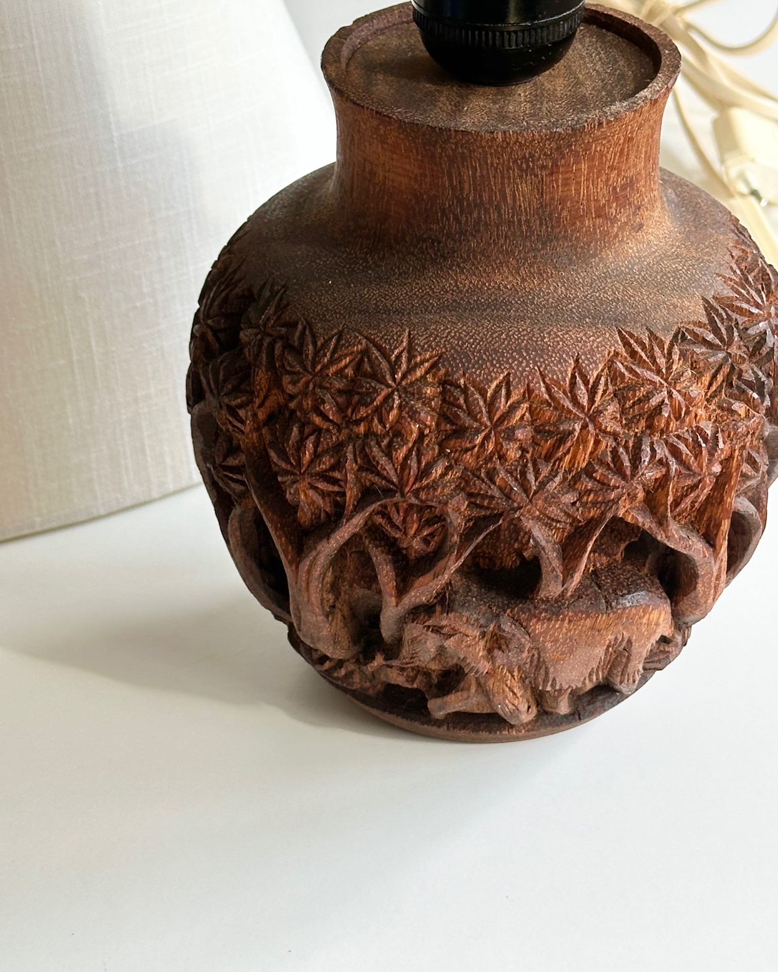 Bordlampe, håndskåret af træ med elefantmotiv. Oval lampeskærm med lyst tekstil. Nyolieret.