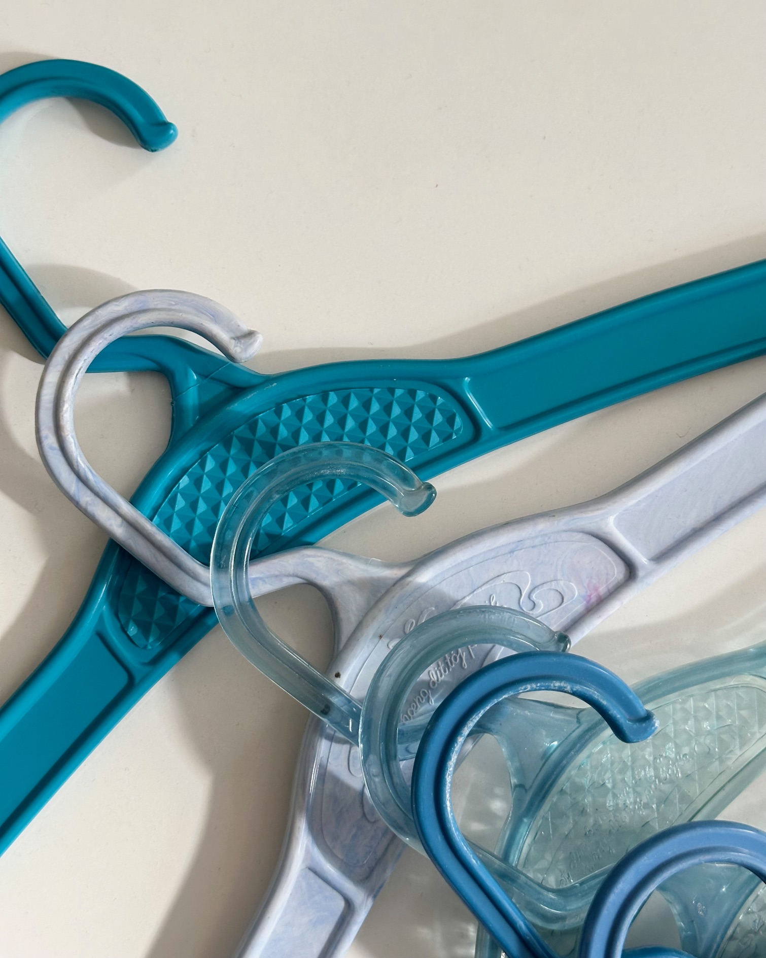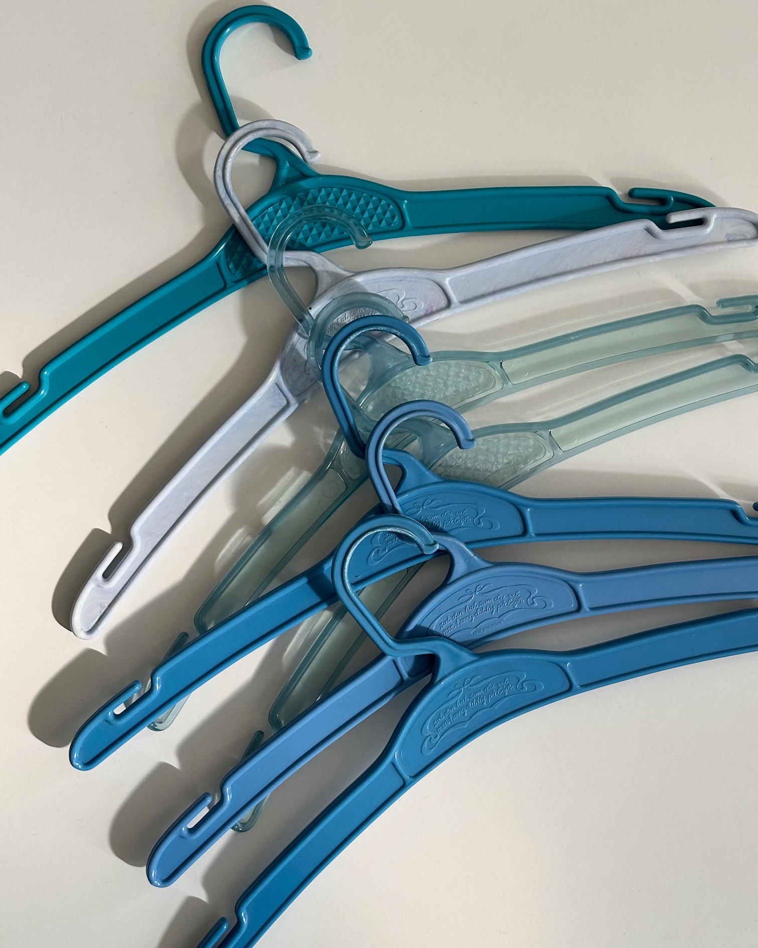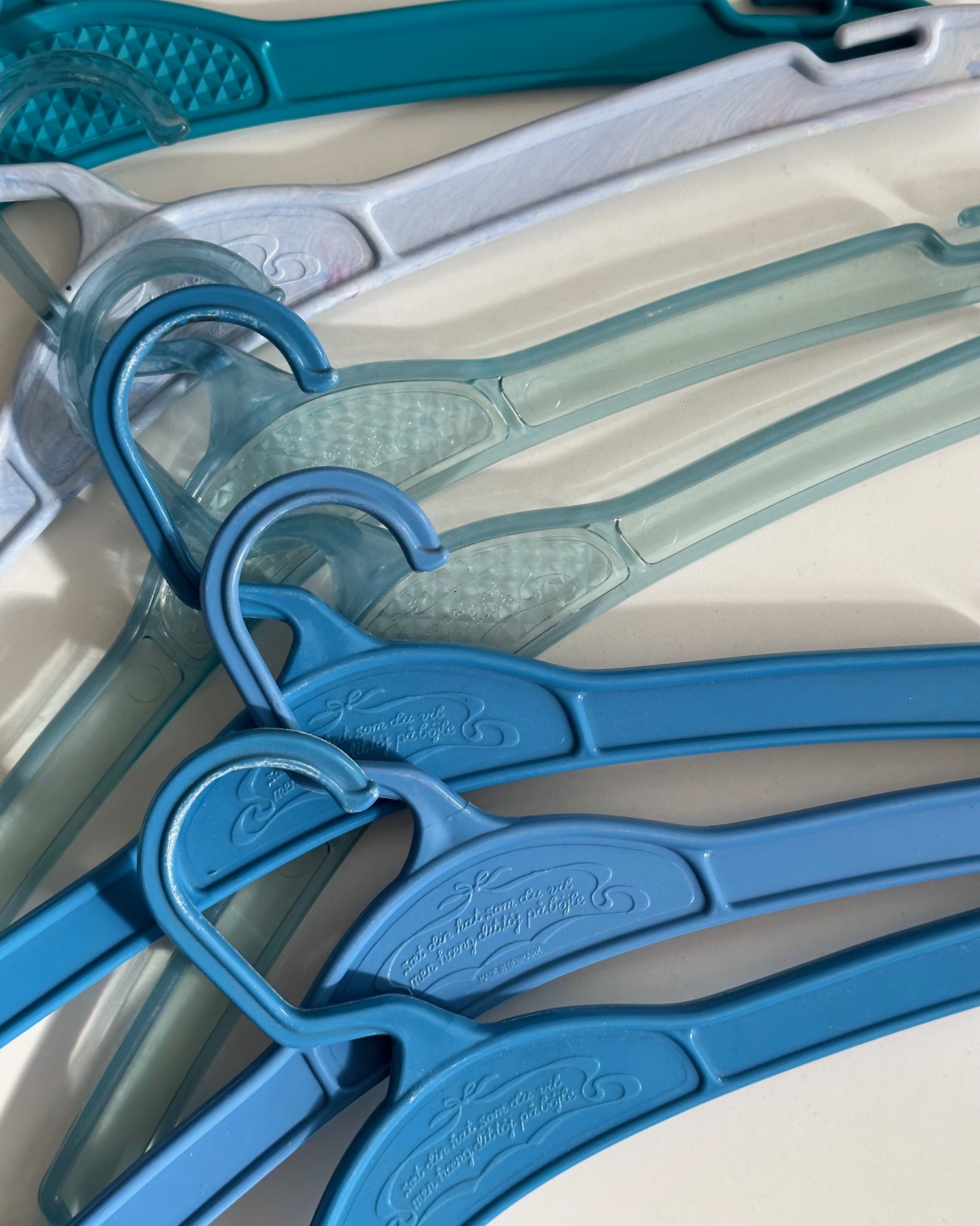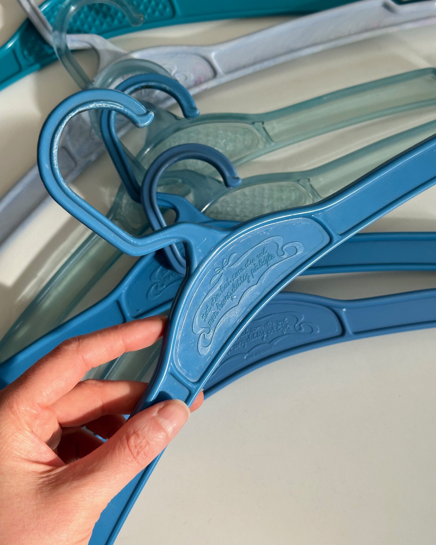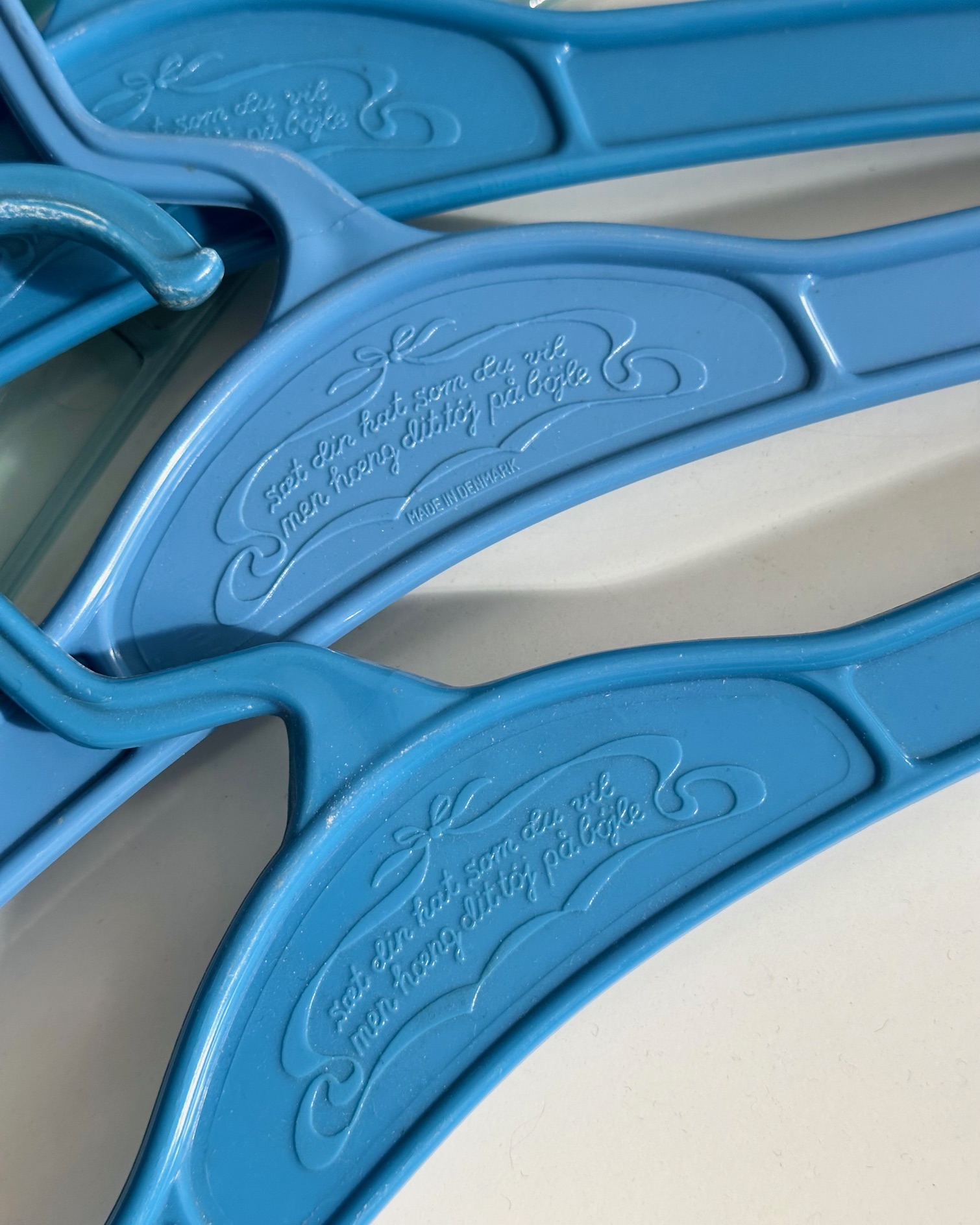 7 skønne, retro plastikbøjler, nogle med teksten "Sæt din hat som du vil, men hæng dit tøj på bøjle"