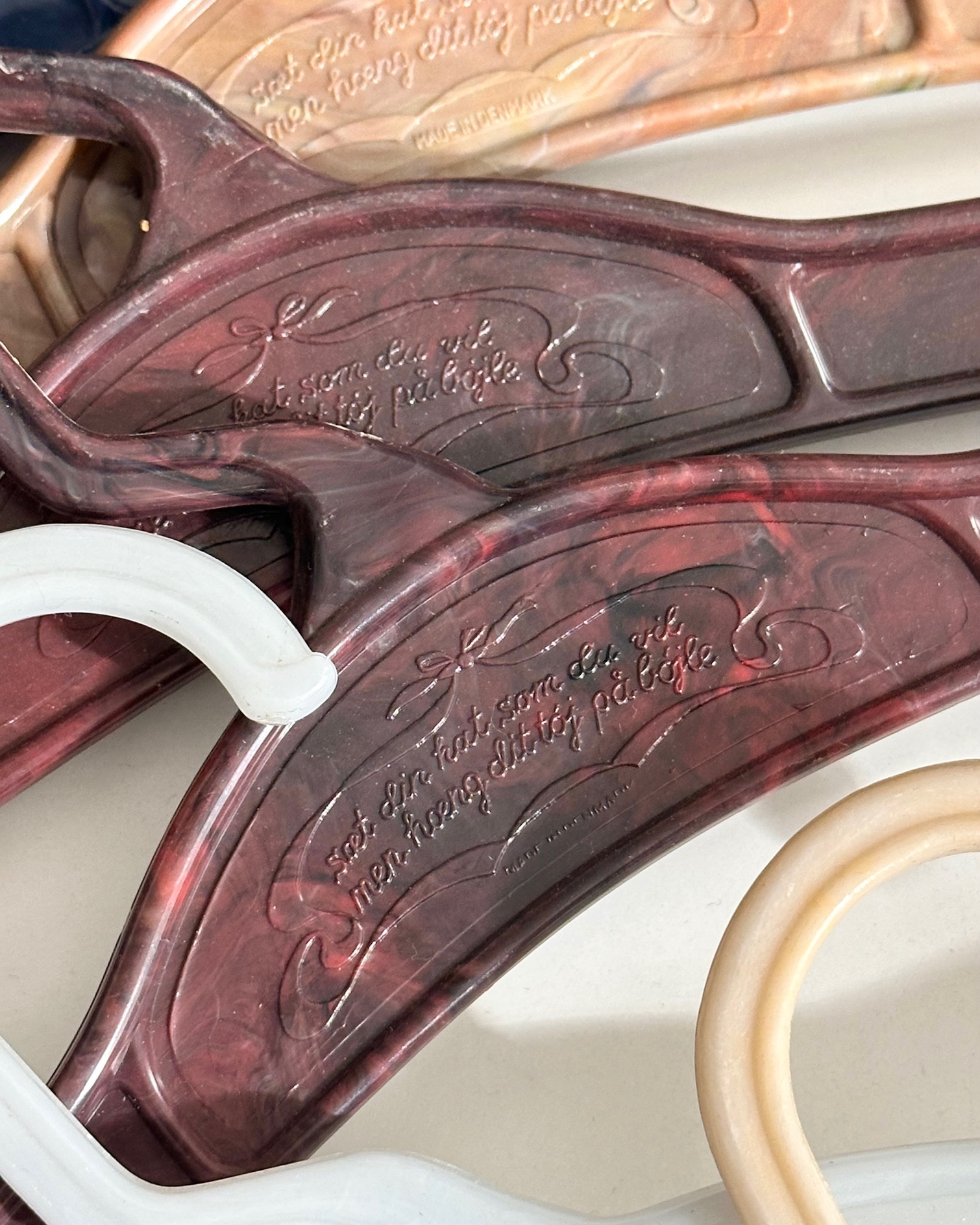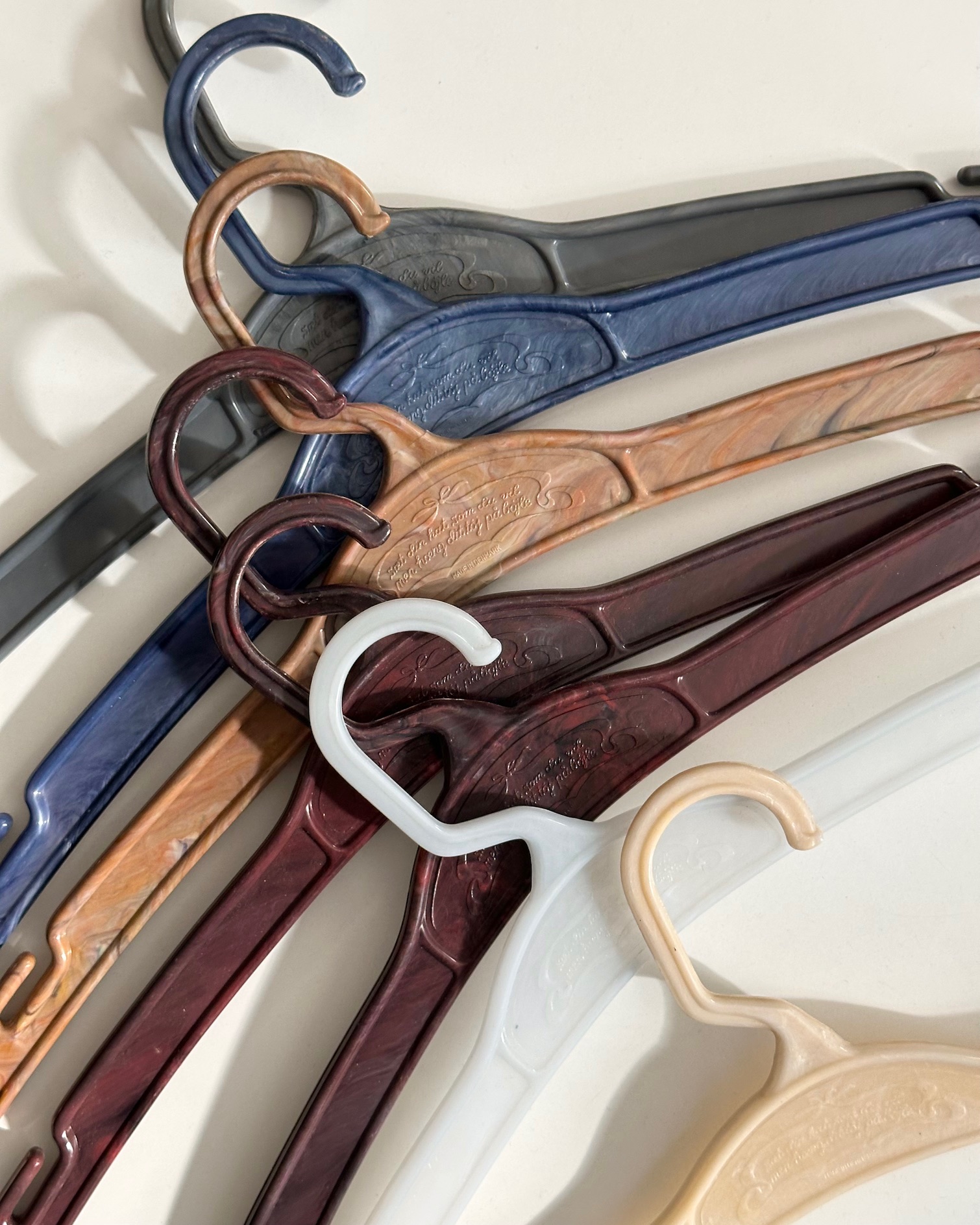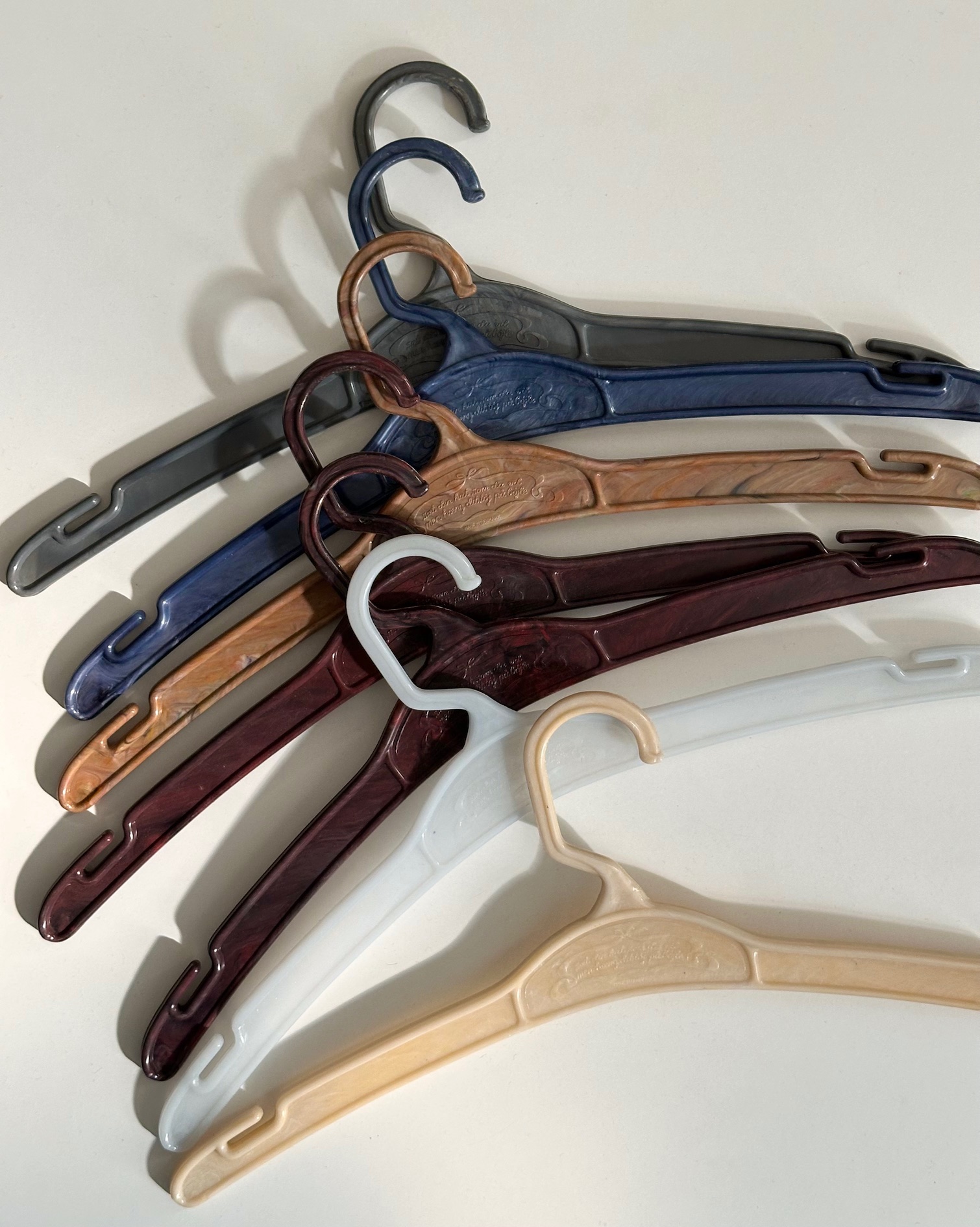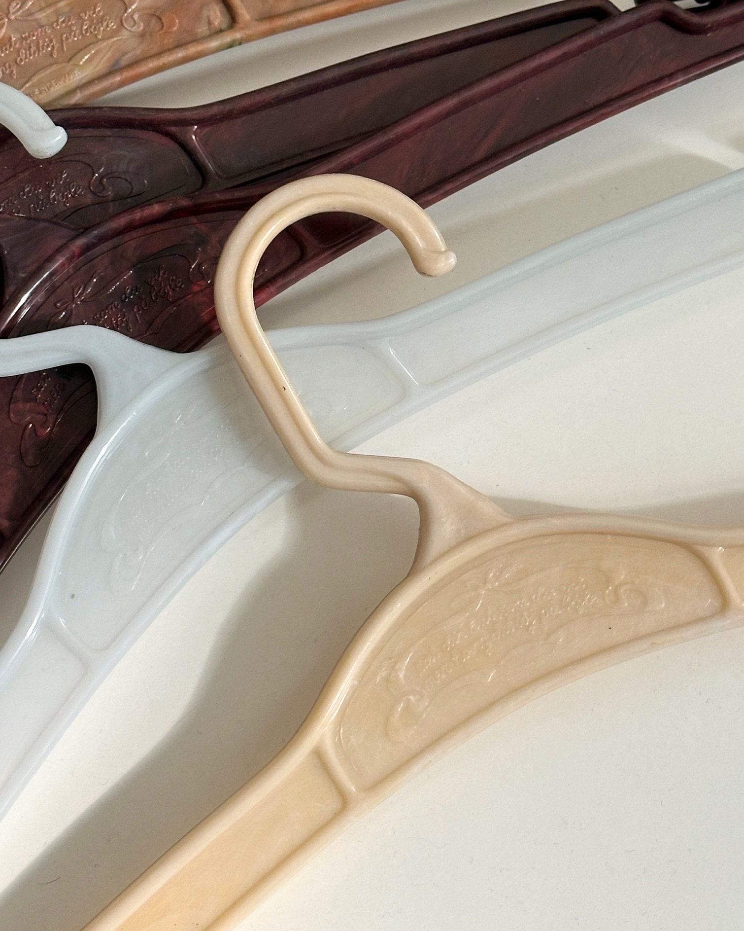 7 skønne, retro plastikbøjler, nogle med teksten "Sæt din hat som du vil, men hæng dit tøj på bøjle"