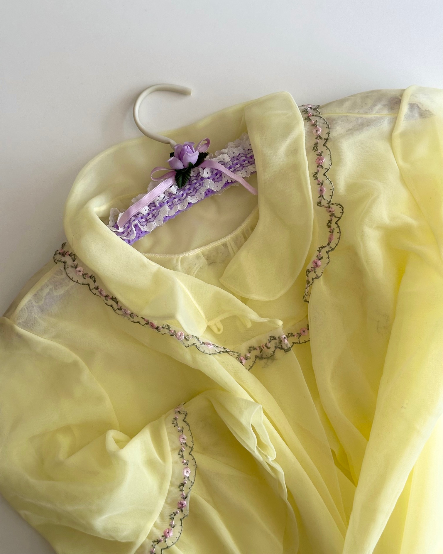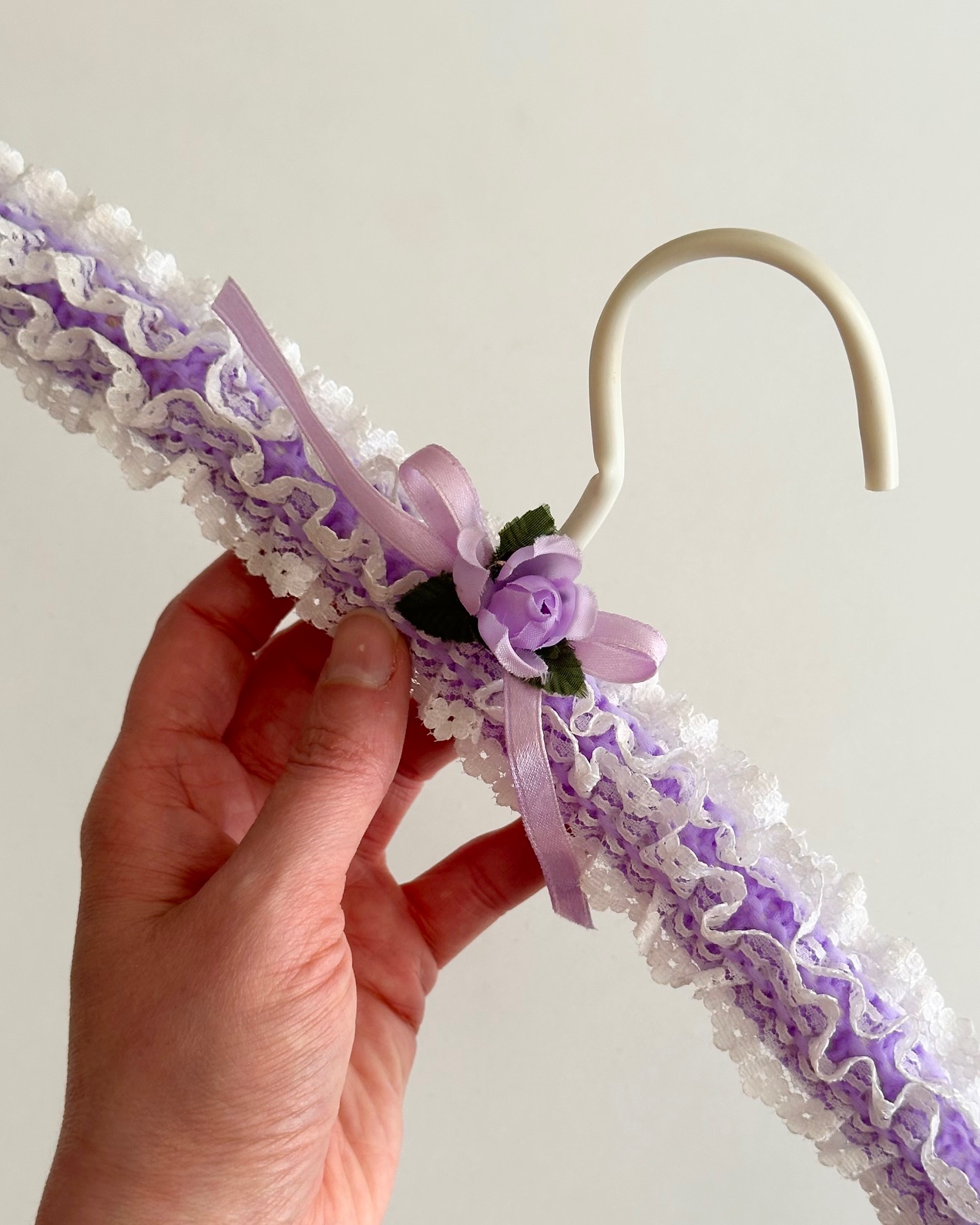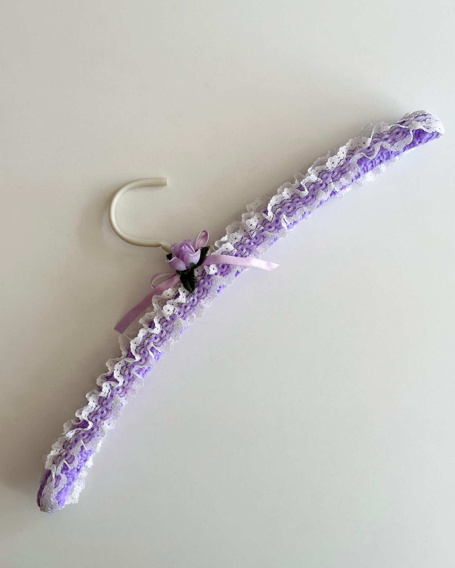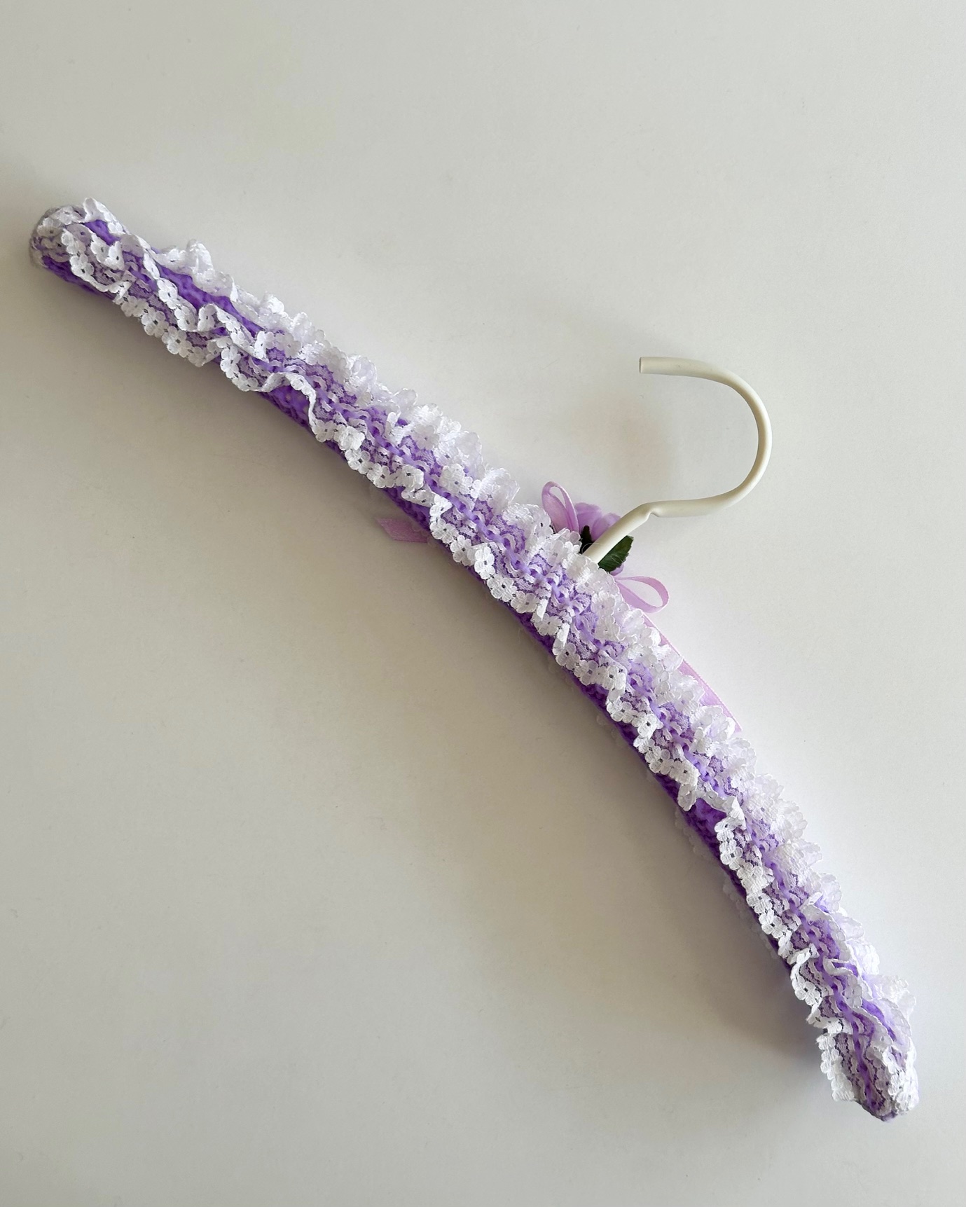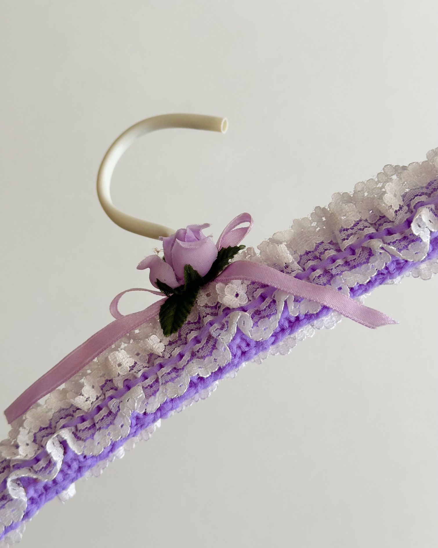 Vintage bøjle med lilla strik og flæser, rose og bånd